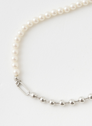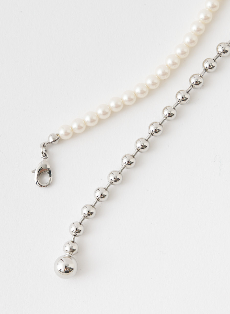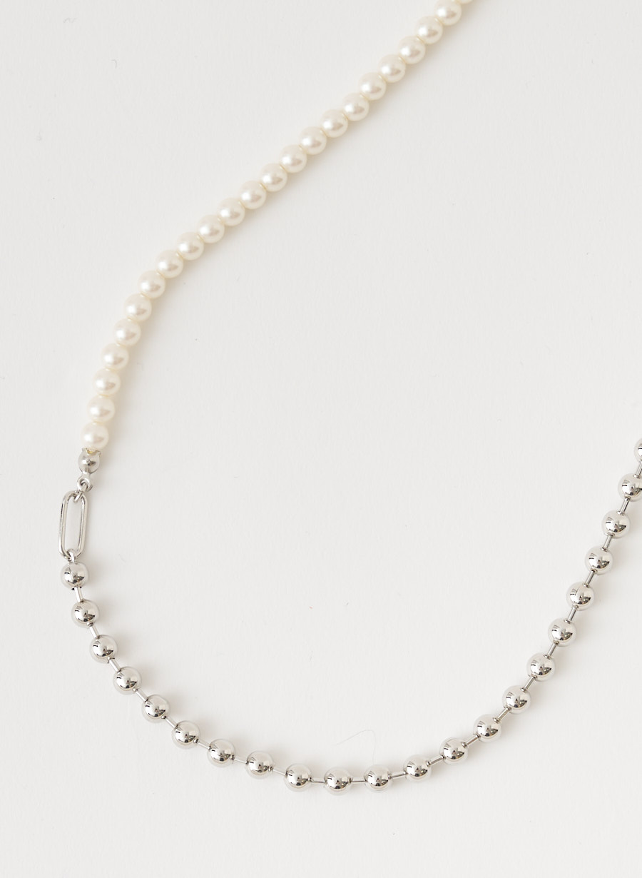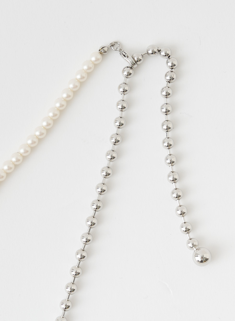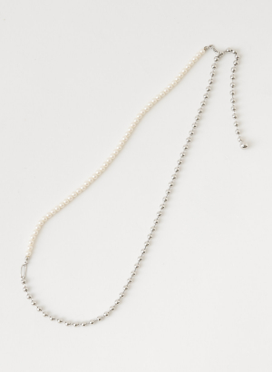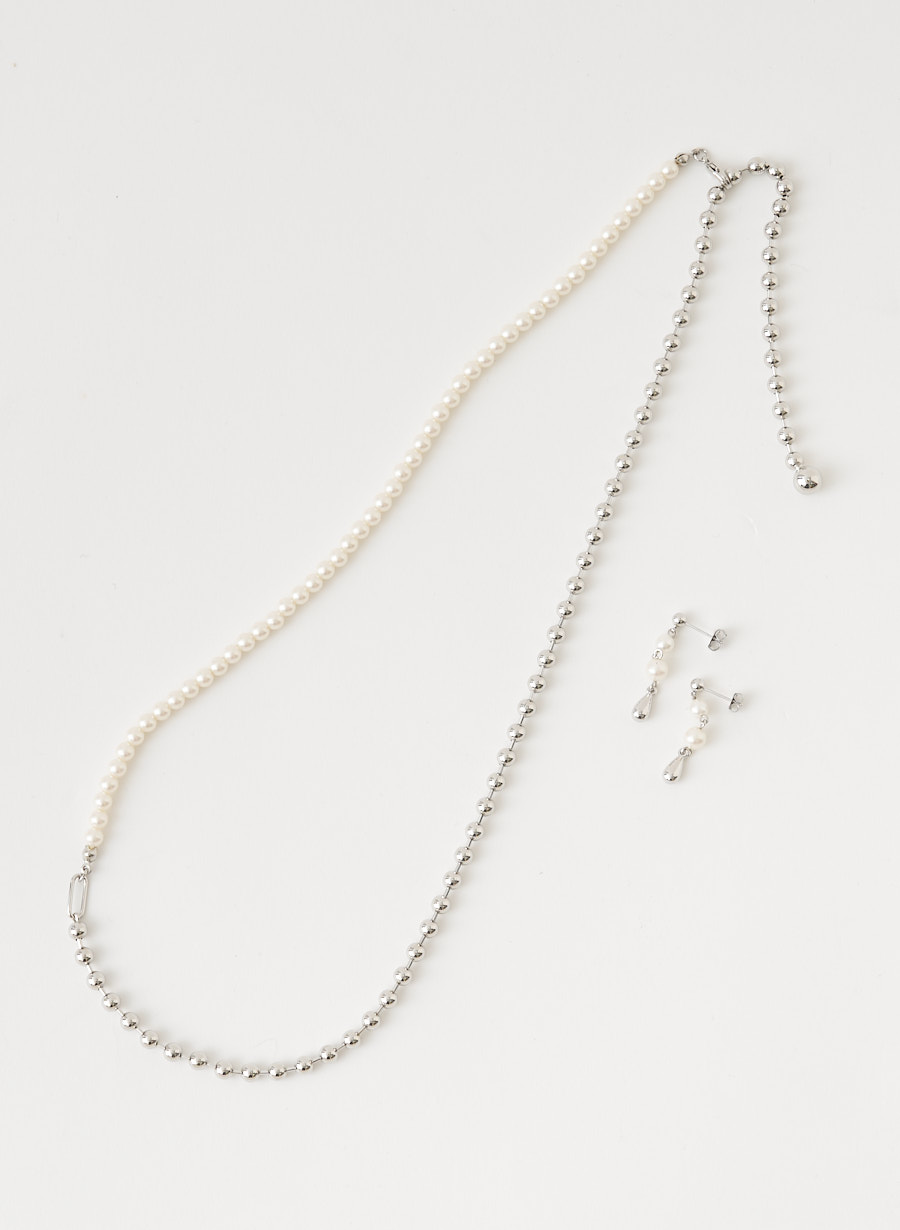 ボールチェーンとパールをコンビにしたネックレスは、ナスカンを好きな位置に留められる仕様なので、Y字ラリエットとしてもロングネックレスとしてもお使い頂ける優れもの!パールとメタルのドロップパーツを組み合わせたピアスをプラスしたお得なセット企画です。