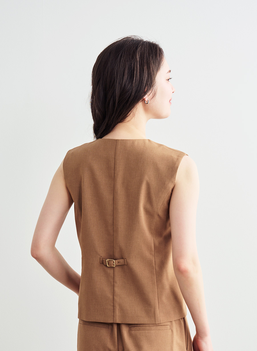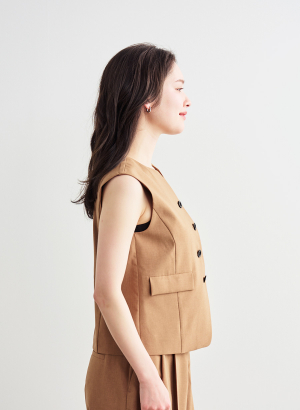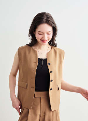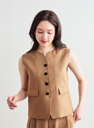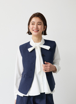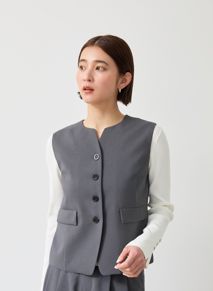・衿ぐりのスリットカットと多めに配したボタンが縦ラインを強調。
