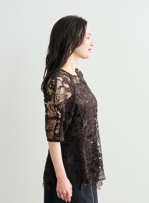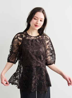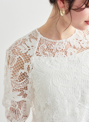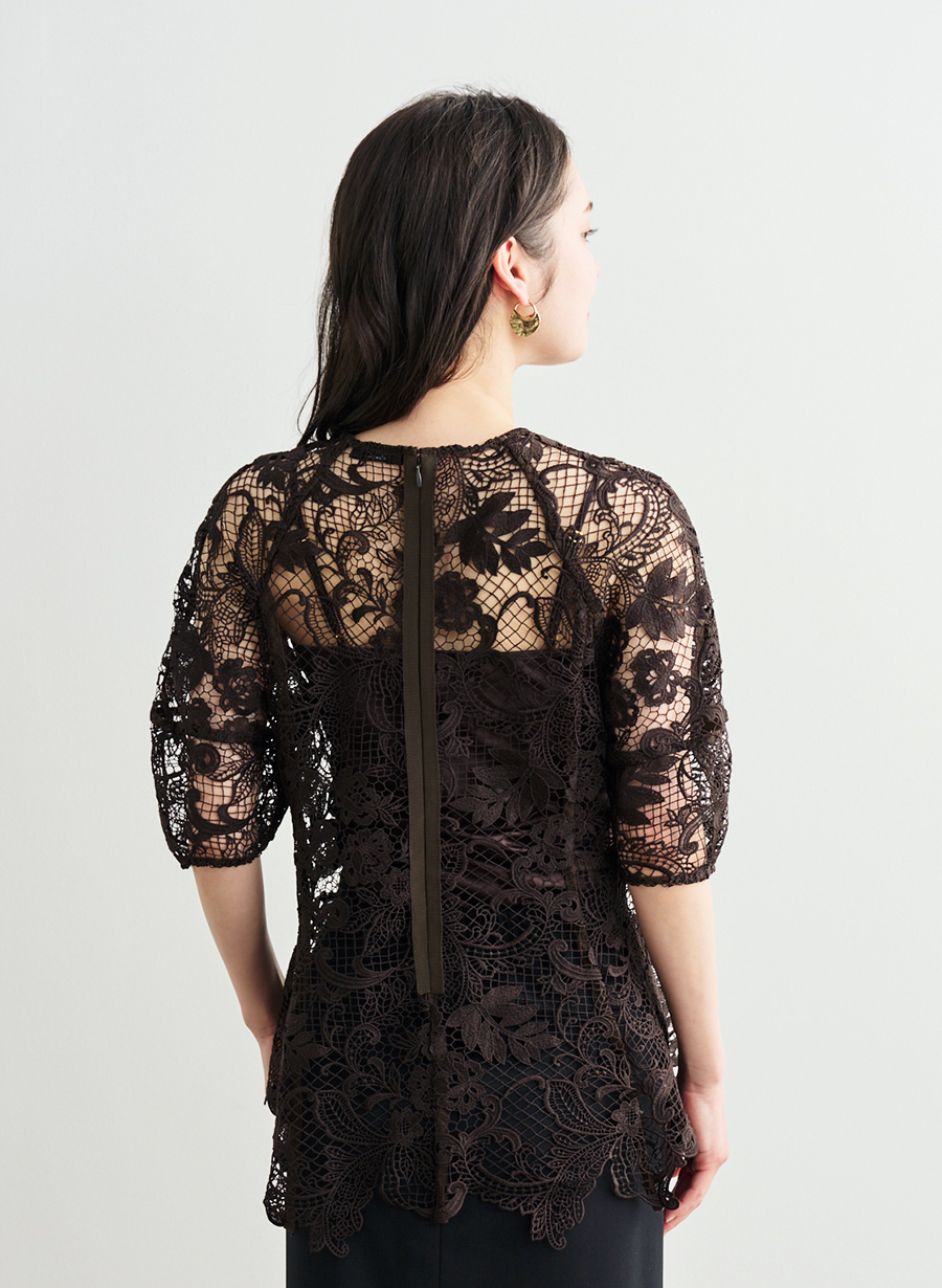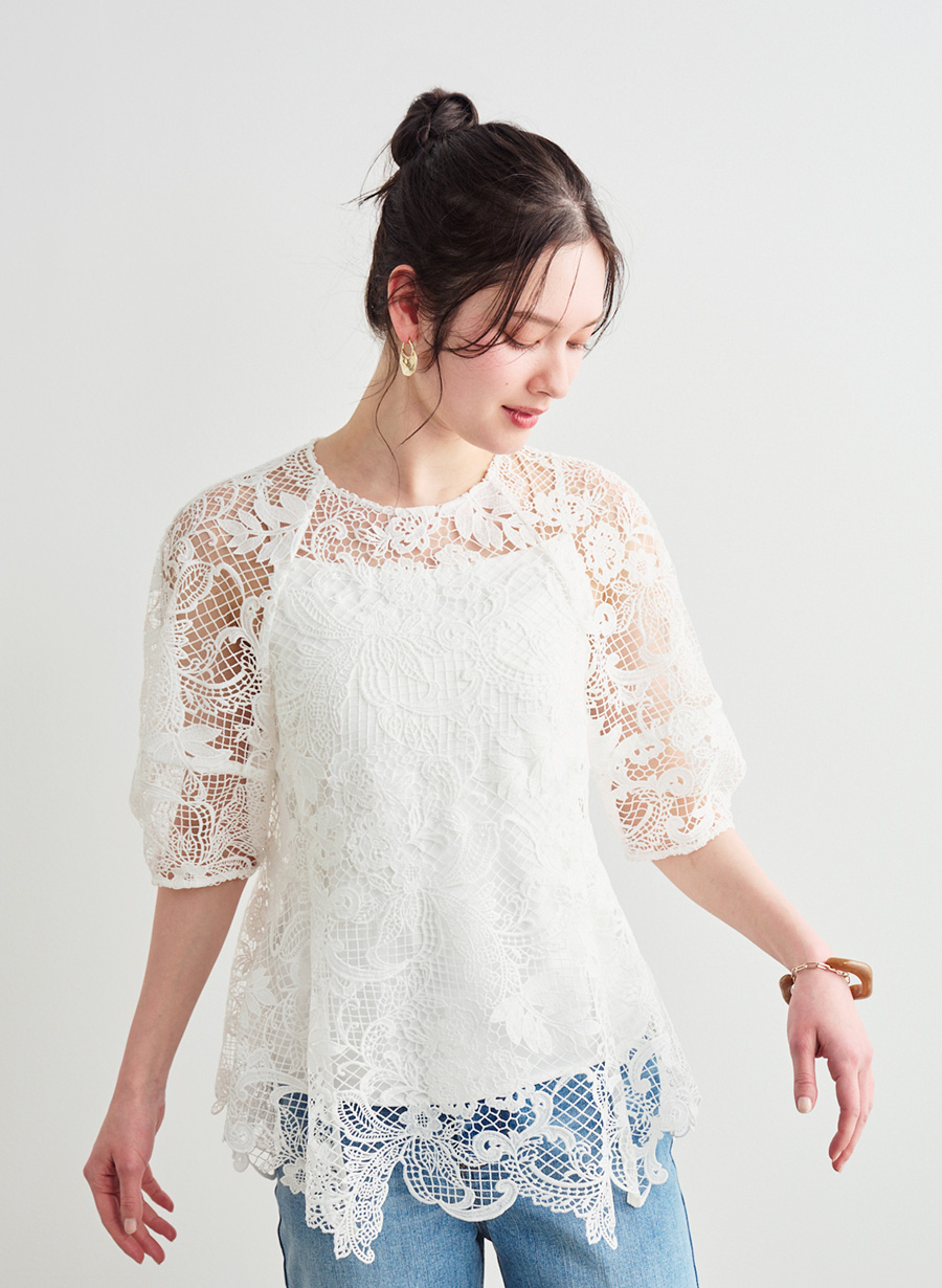・裾にレースのスカラップを使用していることがポイント ・袖に立体的な切り替えを入れることで、程よいボリュームと構築的な表情を演出。