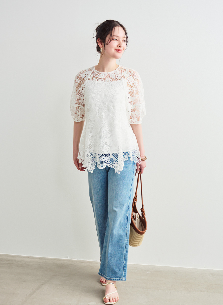 ・同レースを使用した同素材スカートと揃えて、セットアップとしても上品にコーディネート可能。※インナーキャミ付き※伸縮性なし