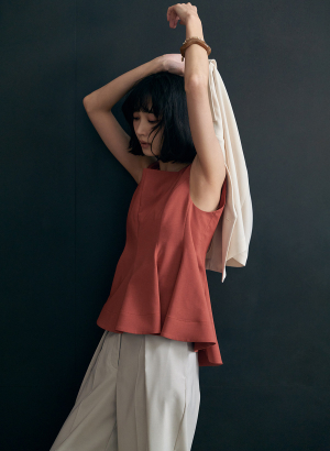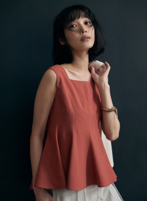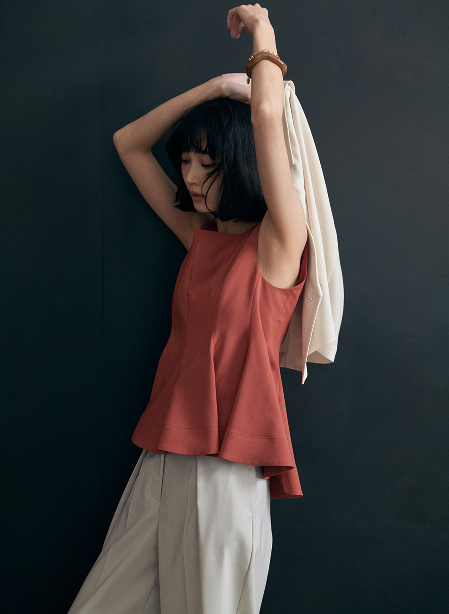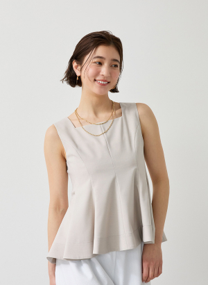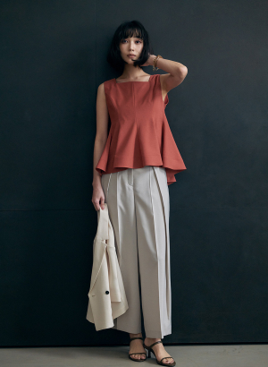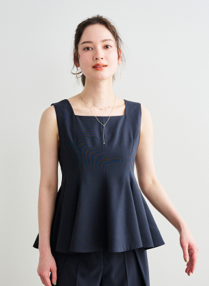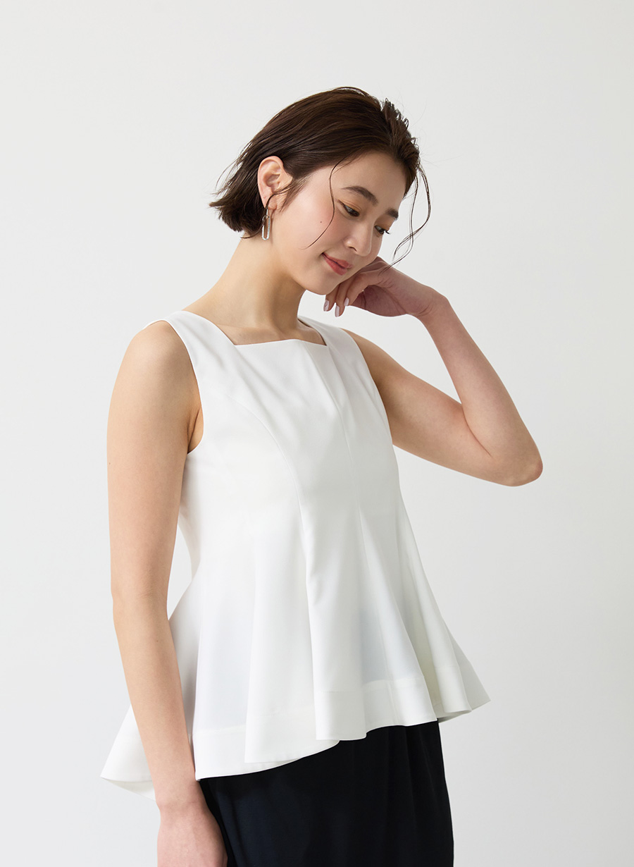 ・ノースリーブとスクエアネックで、カジュアルにもキレイめにも馴染むニュートラルな印象。
