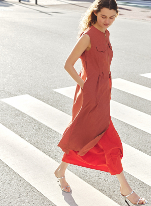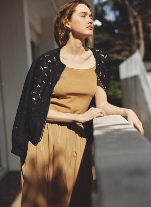・生地の落ち感と軽い反発感のバランスにより、広がりすぎずすっきり縦に流れるラインをキープ。