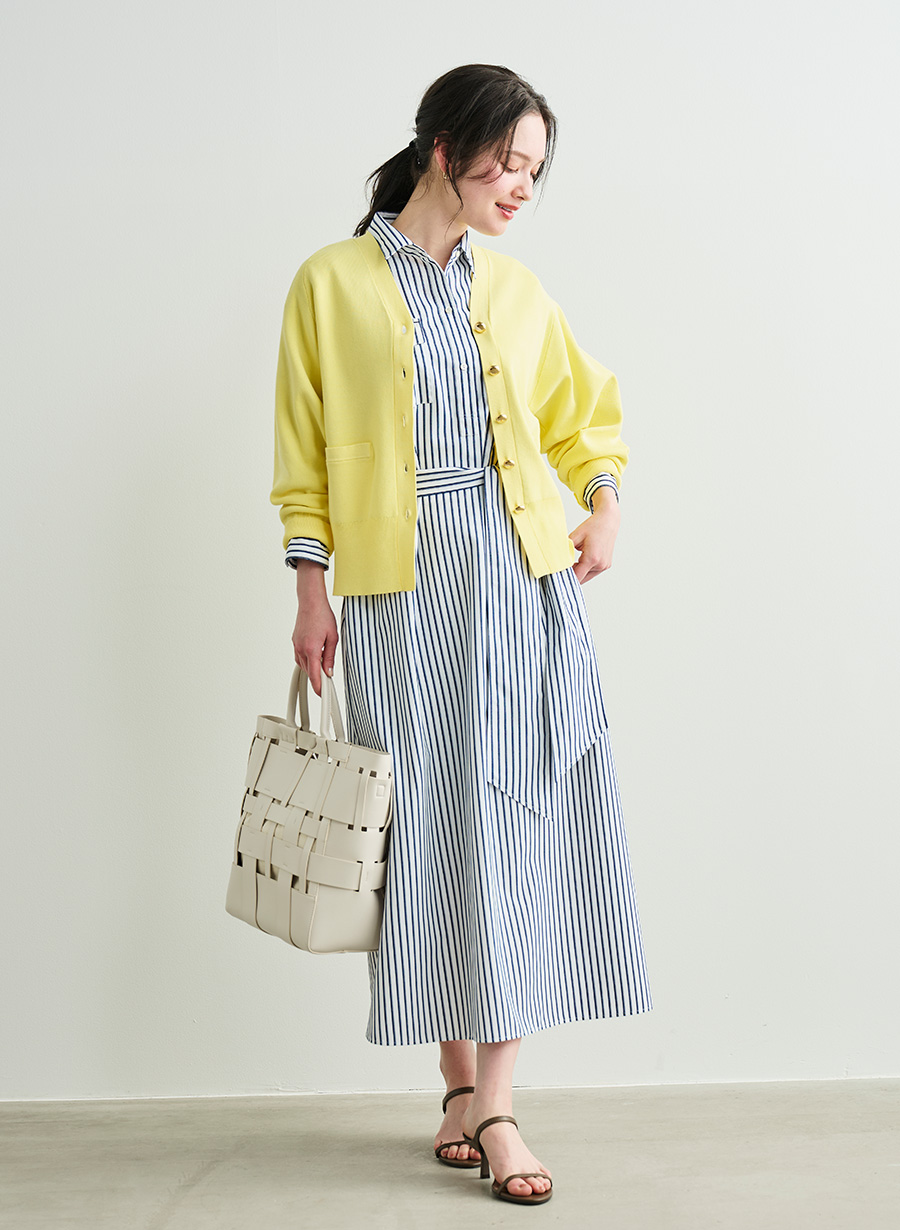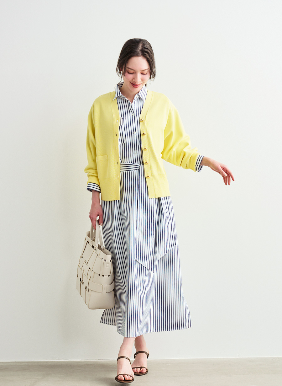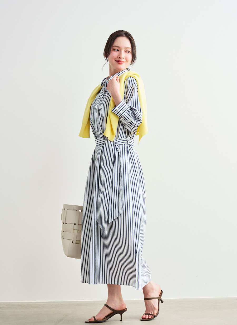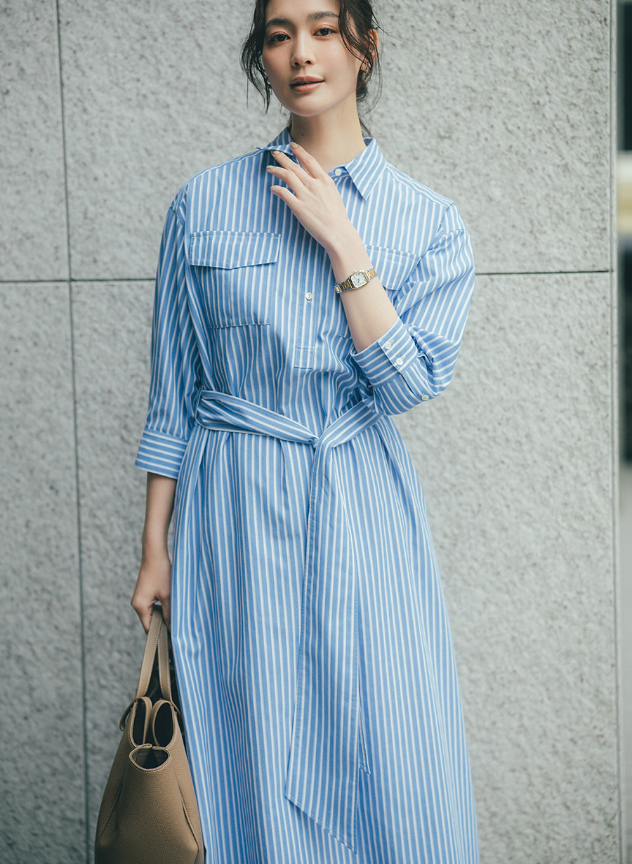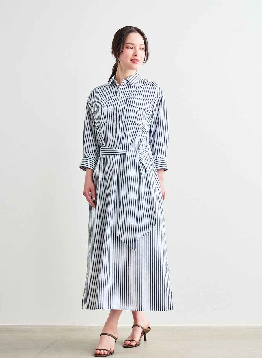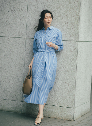 ・爽やかな先染めストライプ素材を使用したクリーンな印象のオリジナルテキスタイルのシャツ。