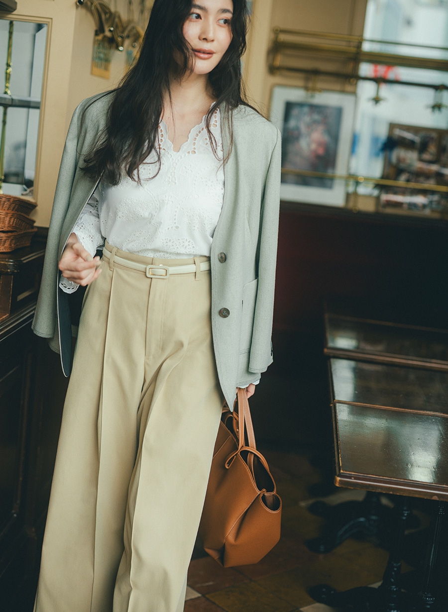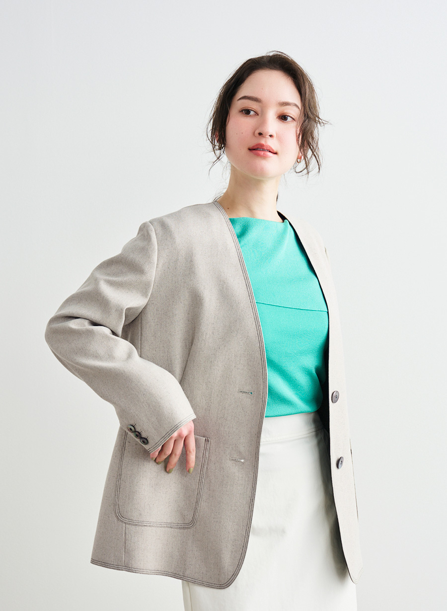 ・見返しにあしらった黒の配色が、ノーカラーの襟ぐりを一層シャープに引き立てます。