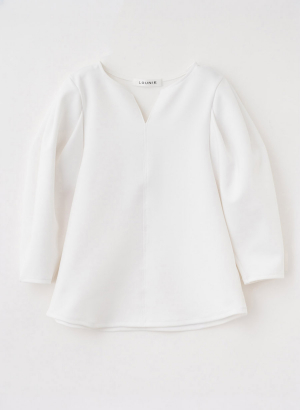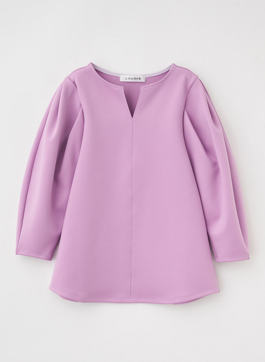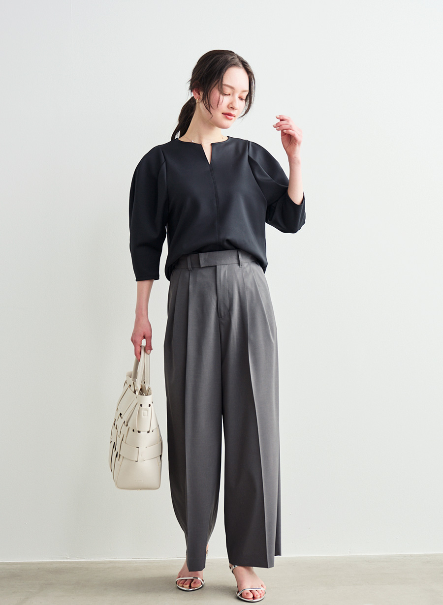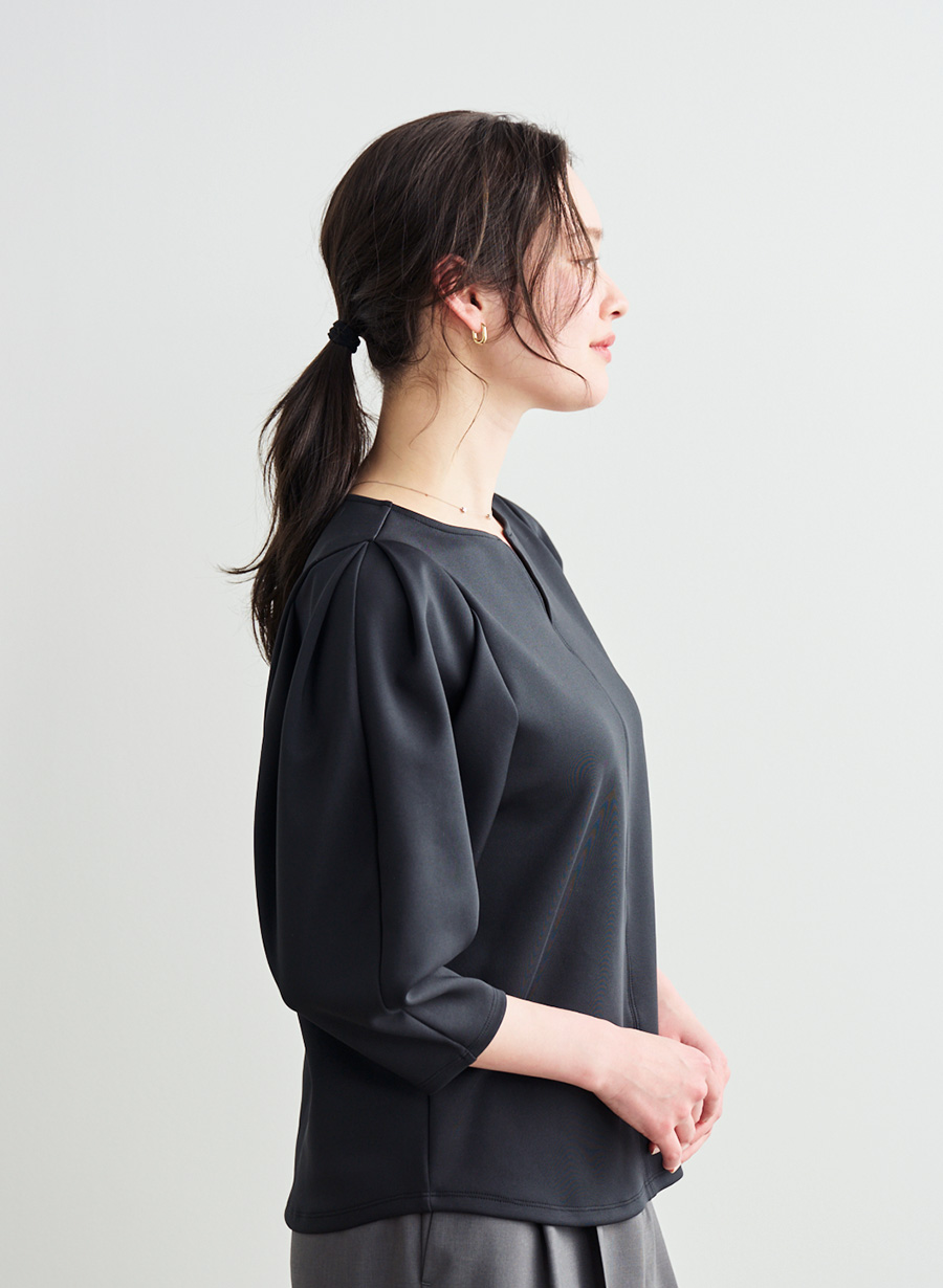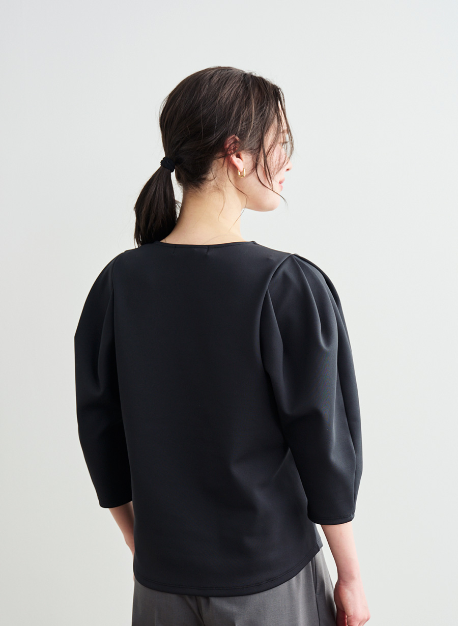・袖山からのタック構造による柔らかなボリュームスリーブが、女性らしい立体感を形成。