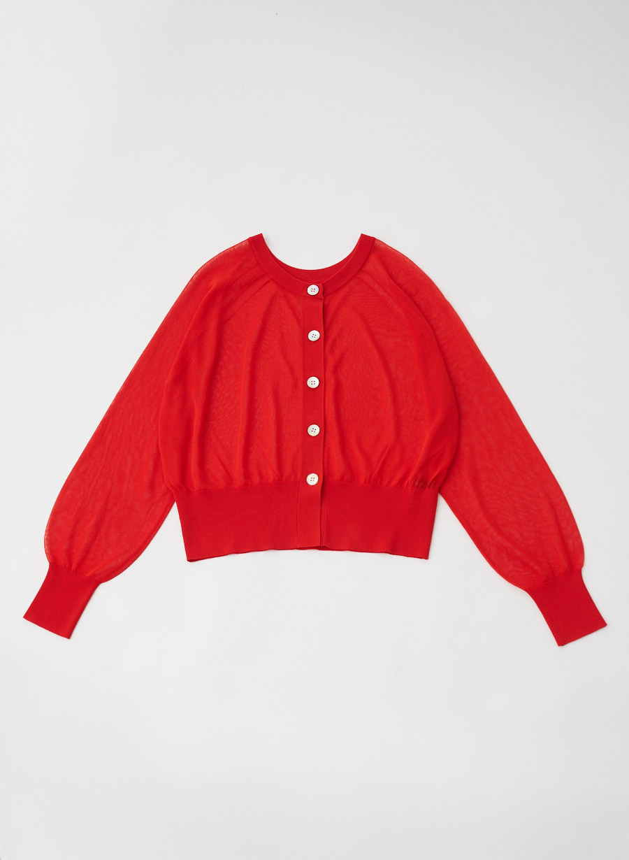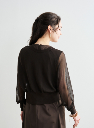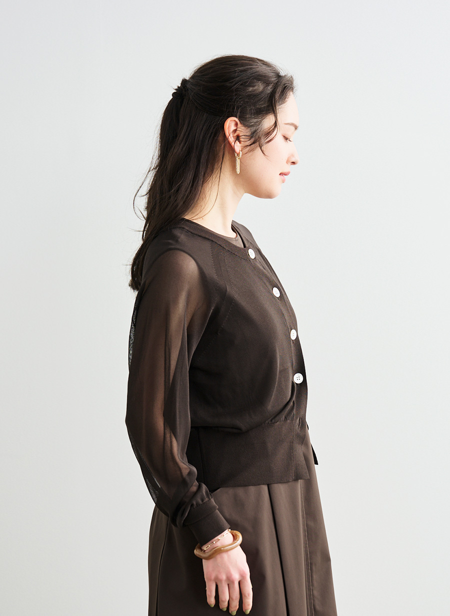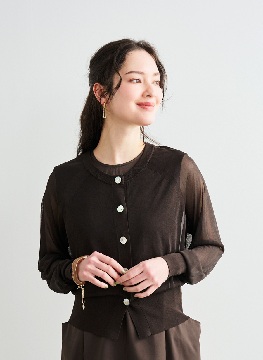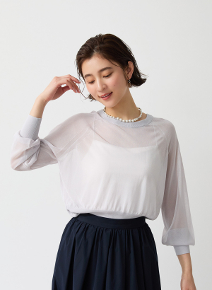 ・細い糸で繊細な素材ではありますが、目を詰めて美しい目面に編み立てることで、一般的なシアーニットよりも引っ掛けが起きにくい編地になっています。