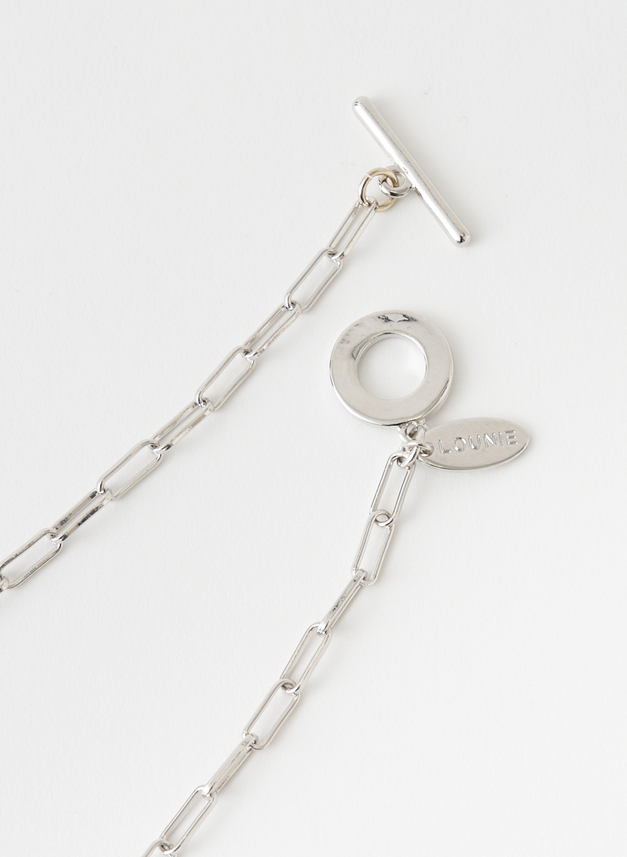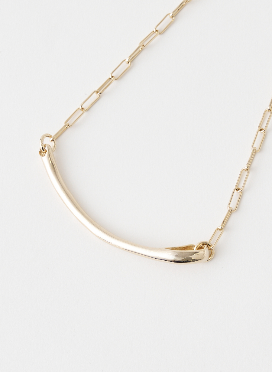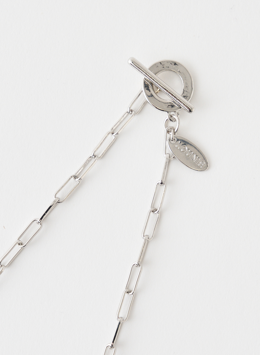 繊細なオーバルチェーンと、カーブを描くメタルパーツを組み合わせることで、シンプルながらも存在感のあるデザインに仕上げました。