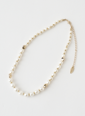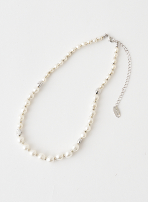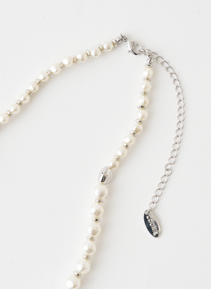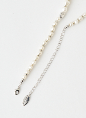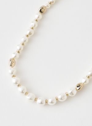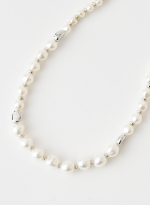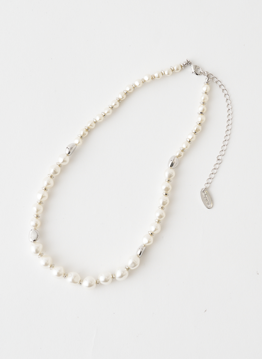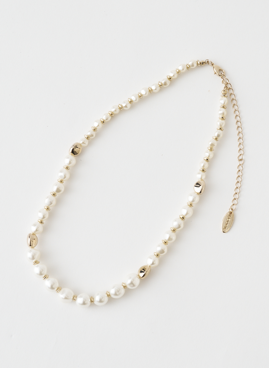 王道のパールネックレスにエッジを効かせ、歪みのあるメタルパーツが程よく抜け感をプラスしてくれるデザインに。