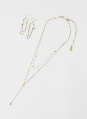 ネックレスは、ロングラインのY字シルエットとショートネックレスの2連風デザインに。