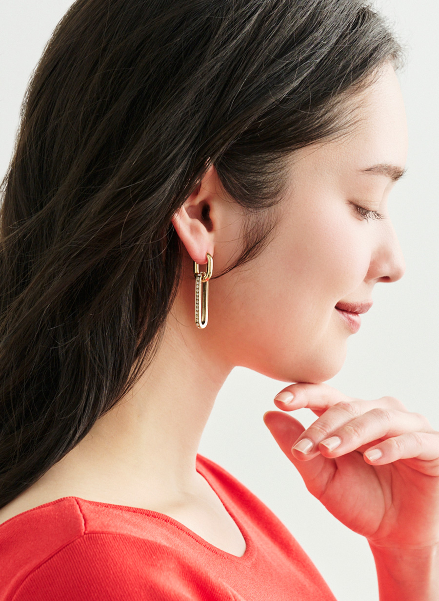 存在感のあるドロップパーツは取り外しが可能で、その日の気分やスタイリングに合わせて「華やかなロングタイプ」と「シンプルなフープタイプ」の2スタイルでお楽しみいただけます。