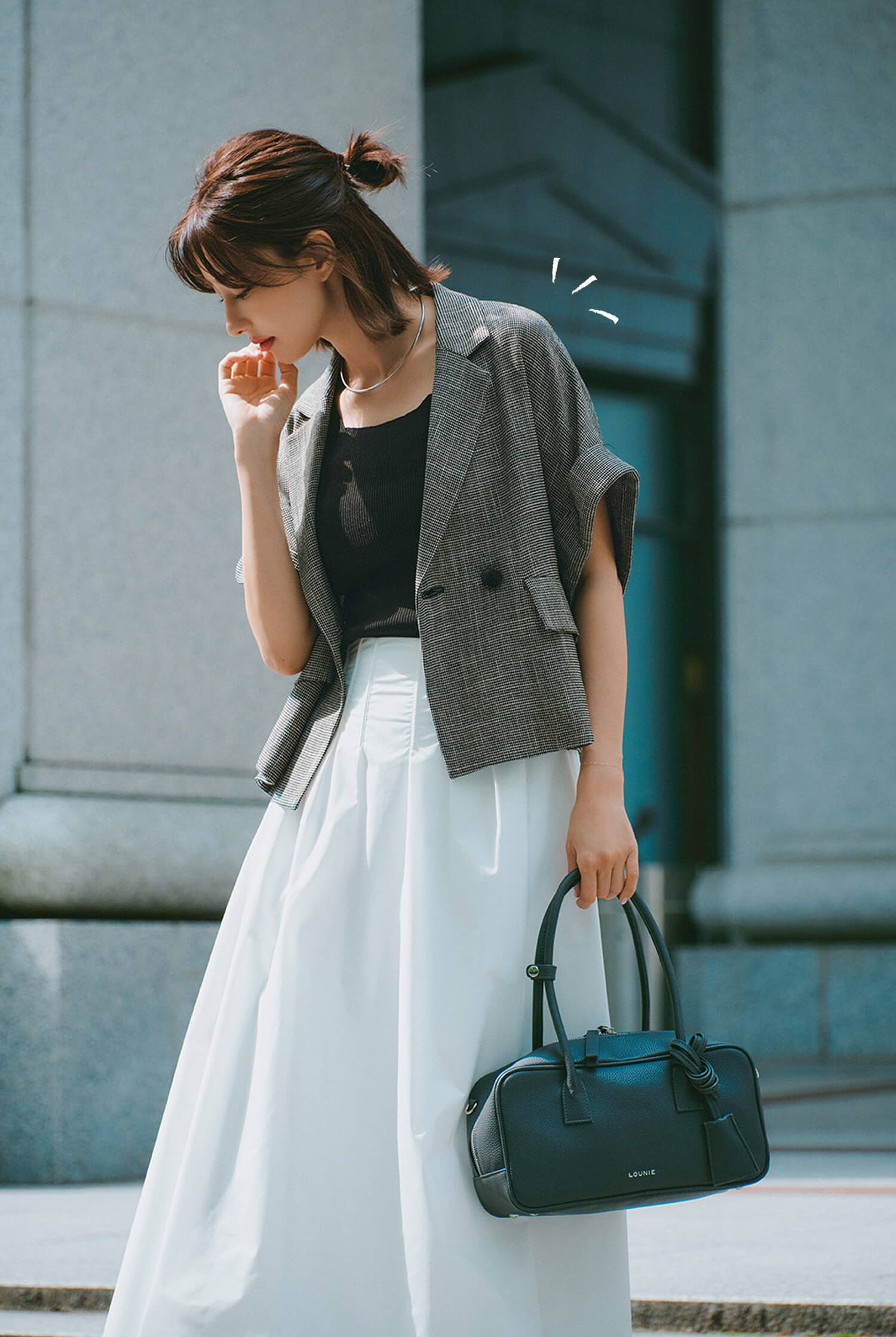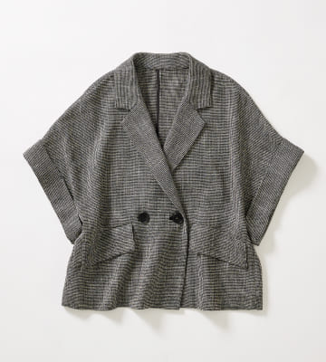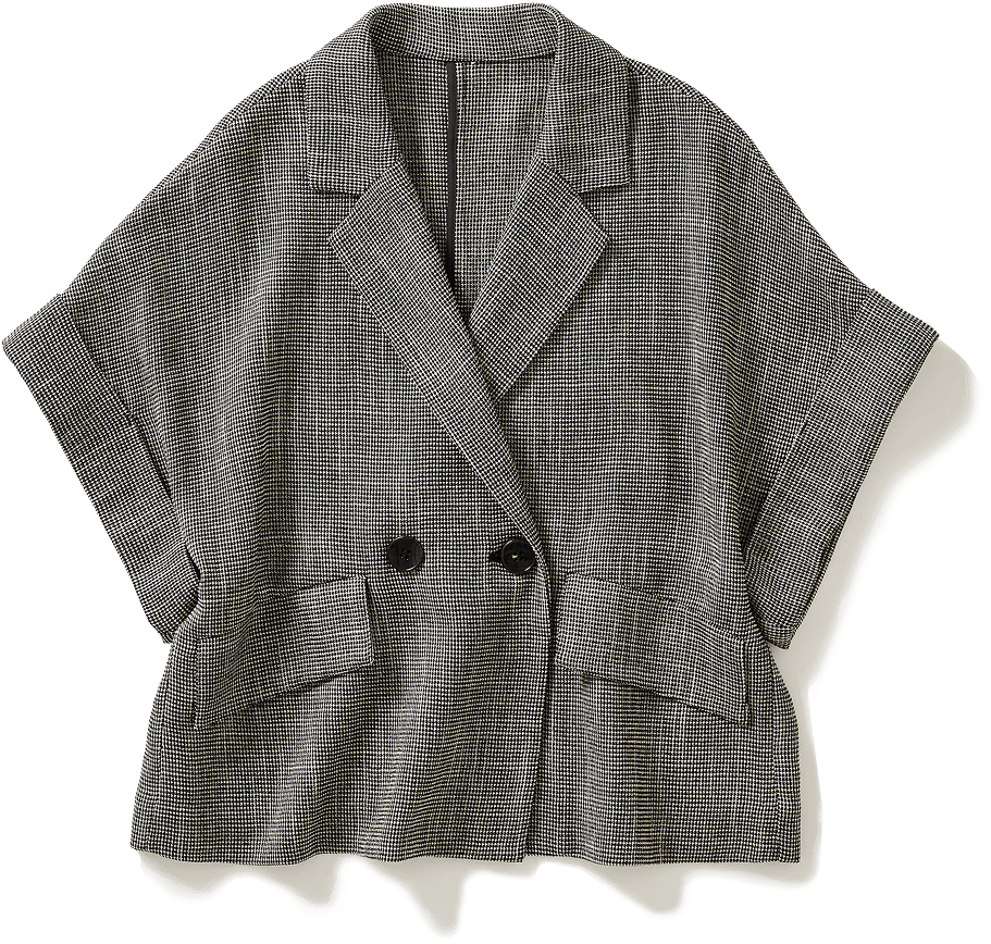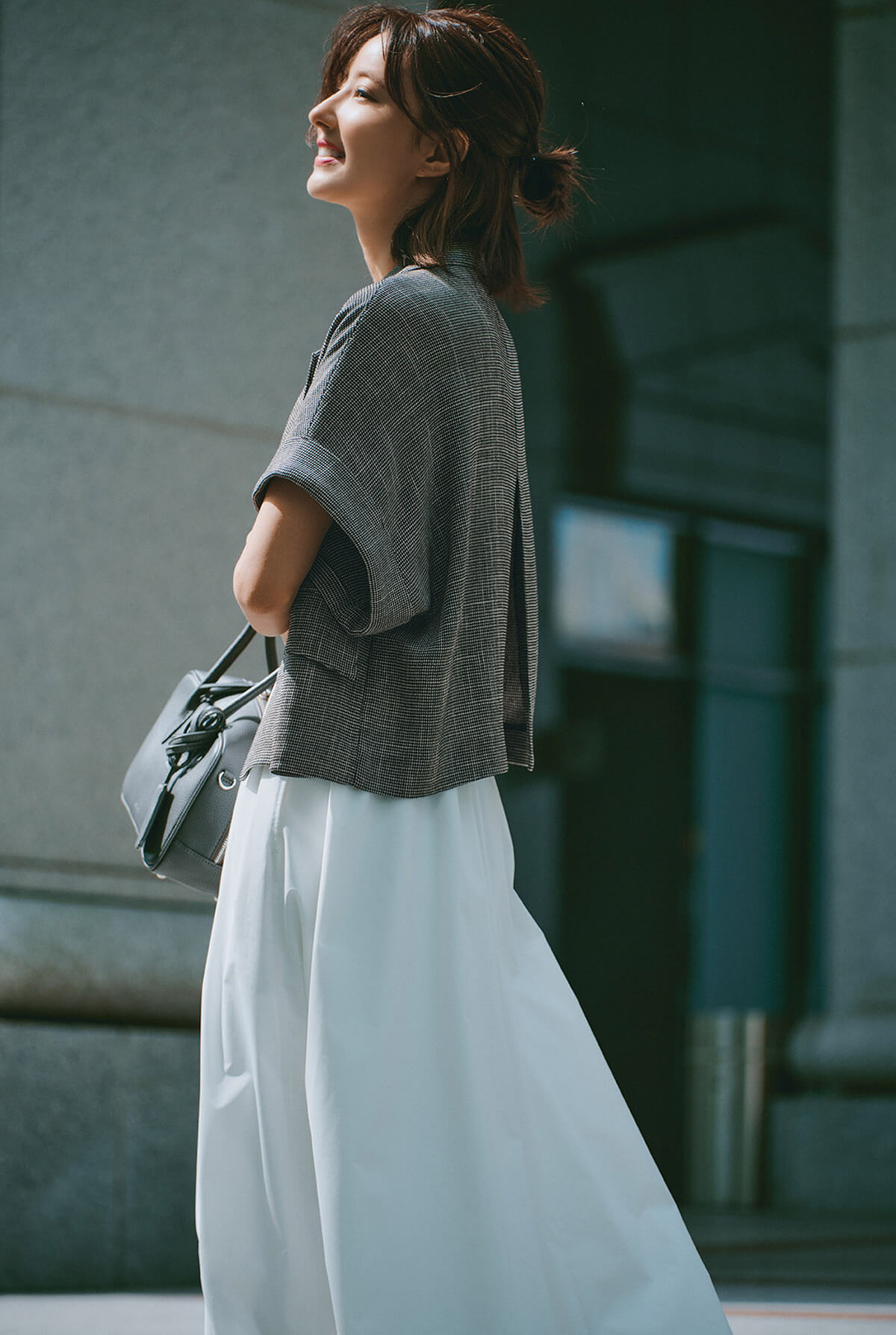 白ジャケットと同じデザインながら、ツイードのような表面感と千鳥柄がクラシックなムード。半歩先の新しい季節を感じさせる着こなしに。ほんのり透け感素材で、快適な着心地。