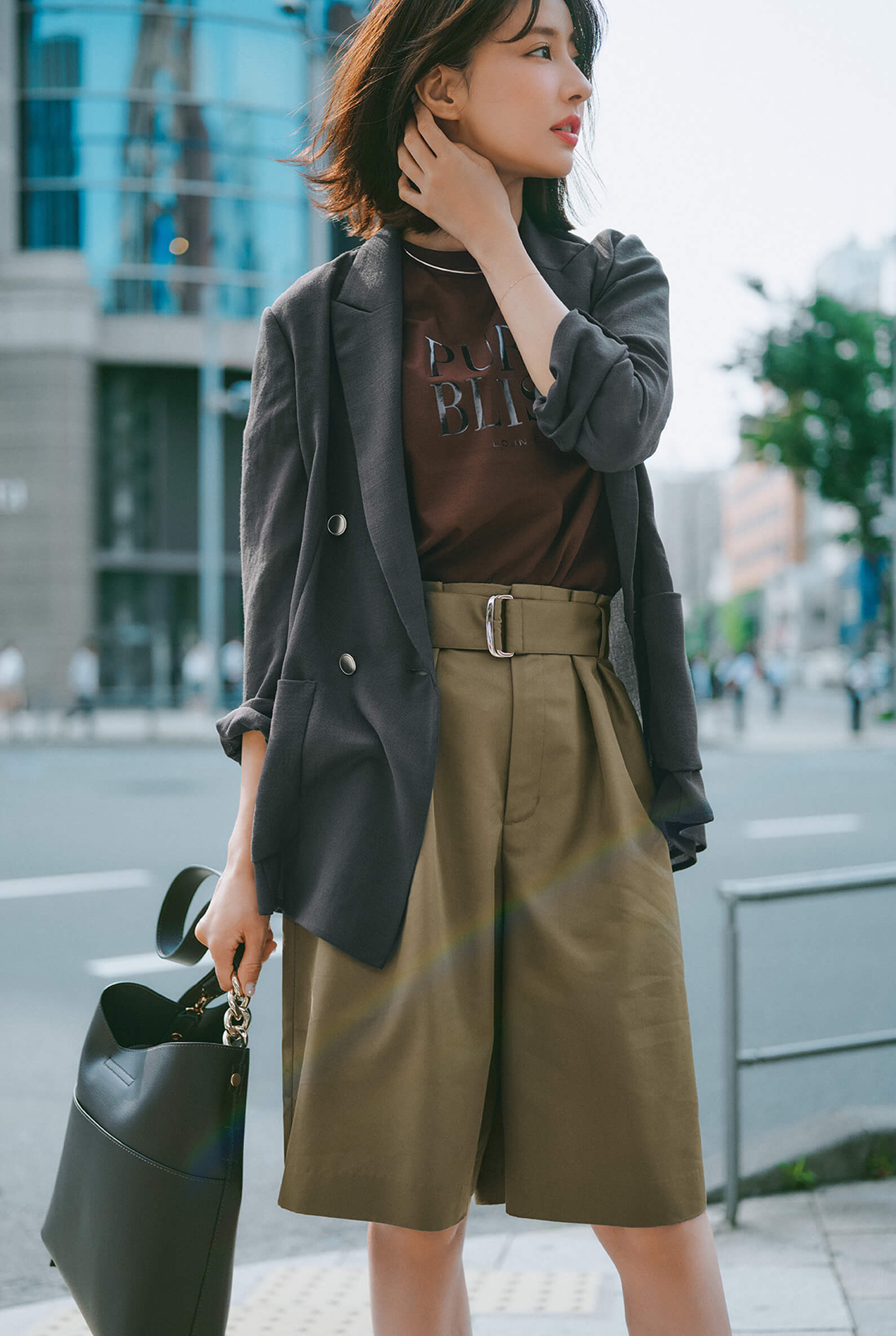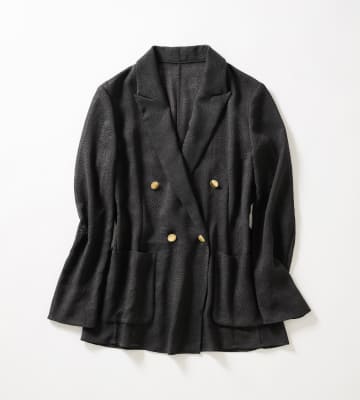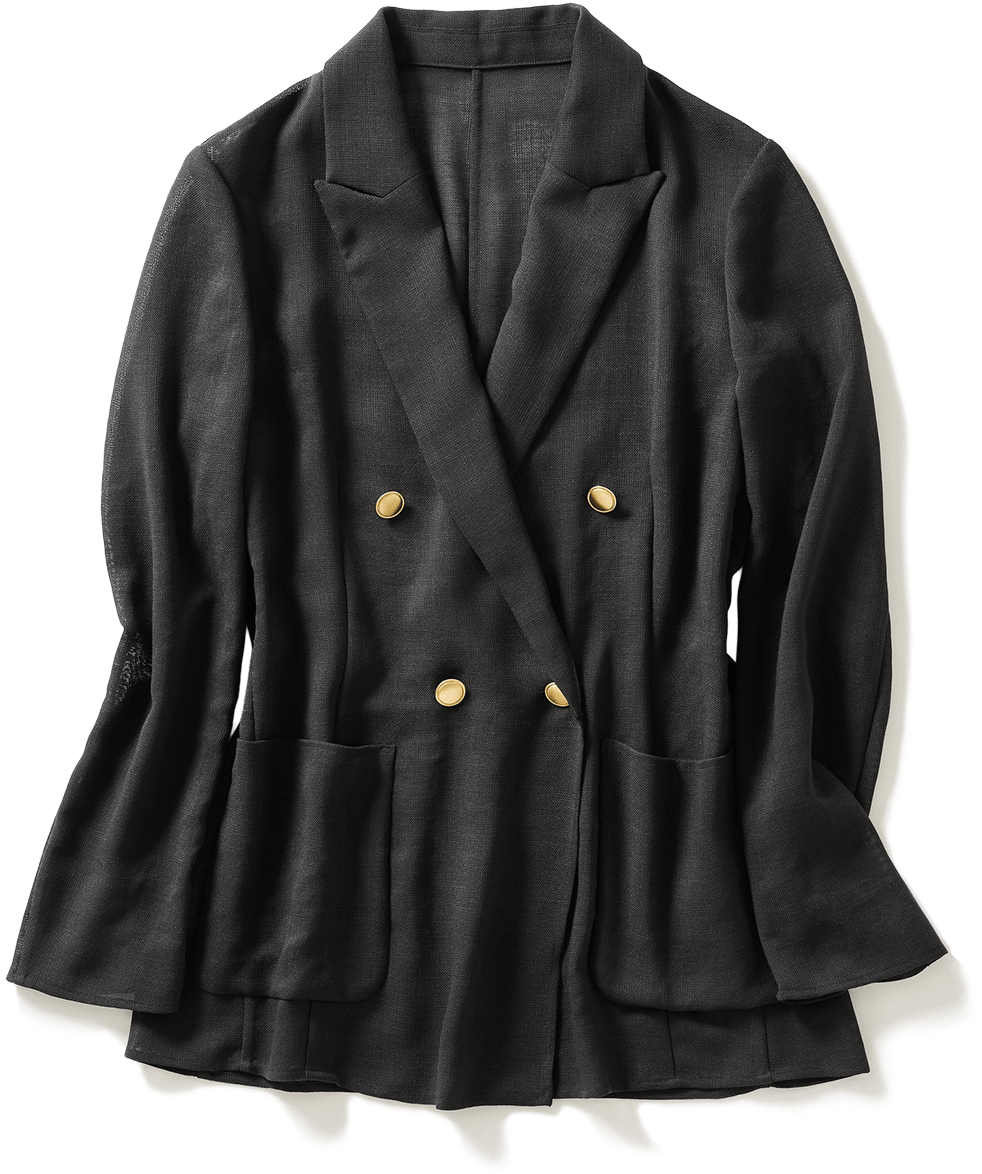 夏の定番になりつつあるシアージャケット。麻調の清涼感ある肌触りが嬉しい。ややオーバーサイズでリラックスした印象に。メタルボタン使いがコーデを引き締めて。