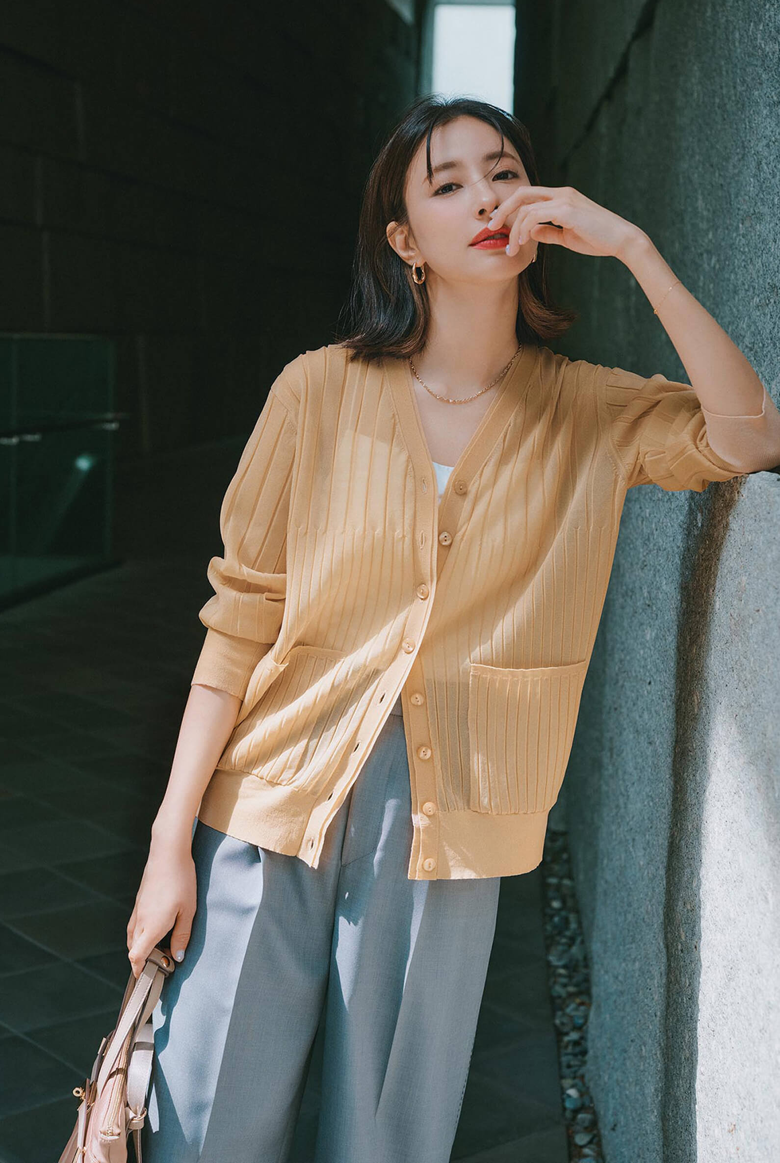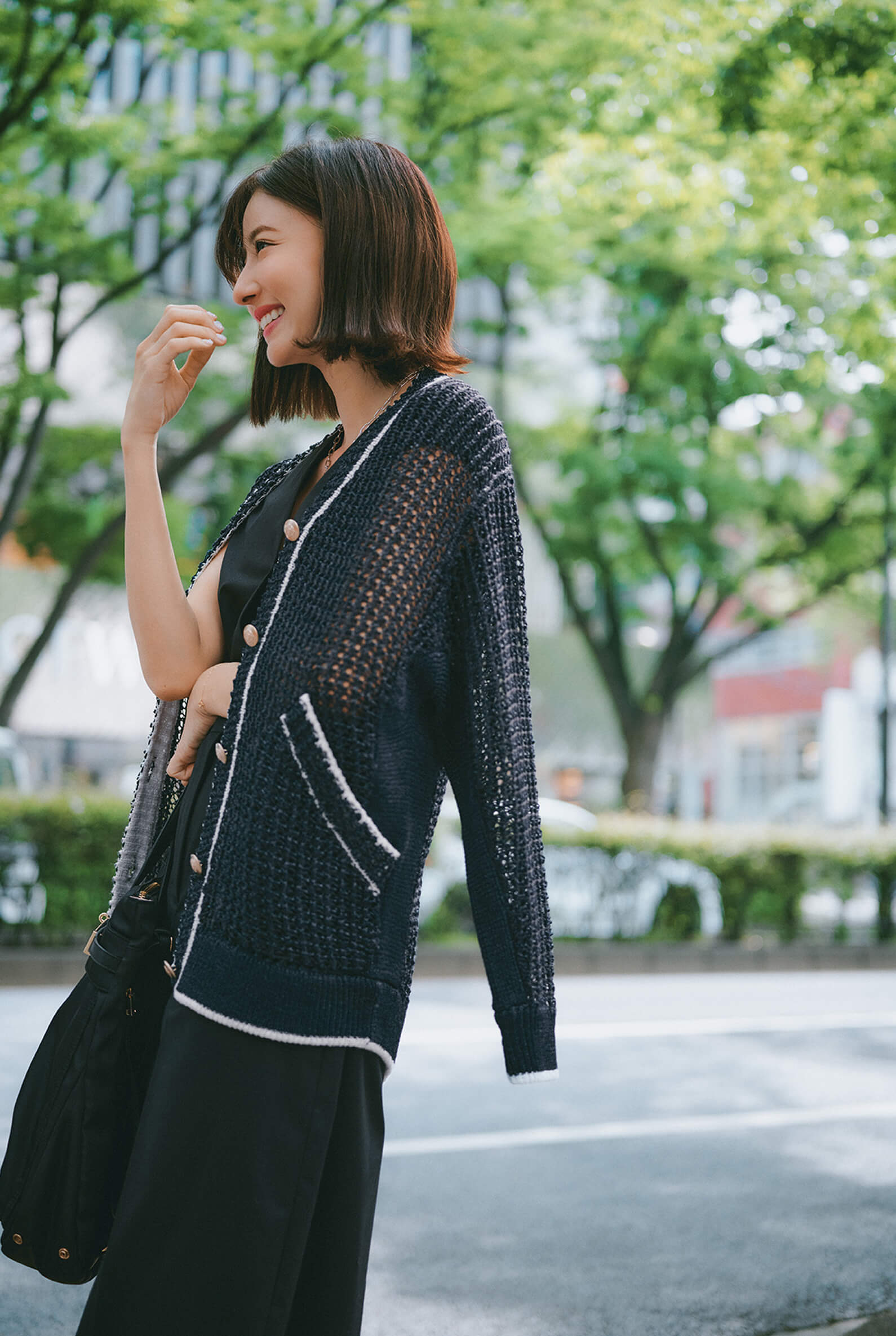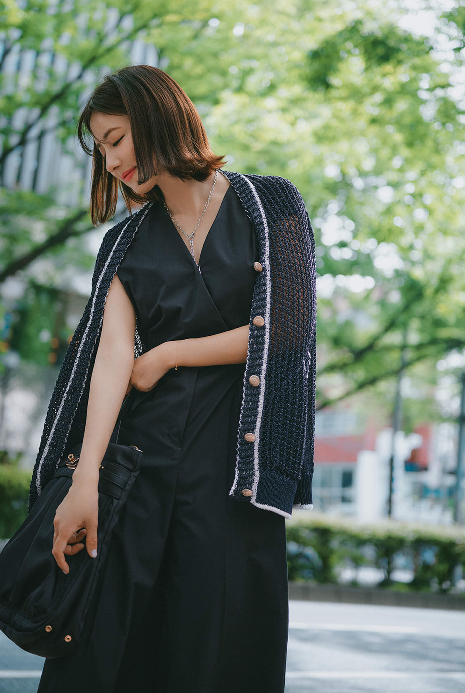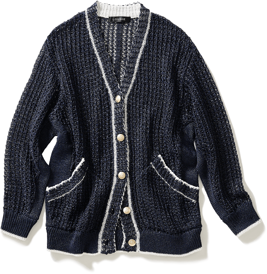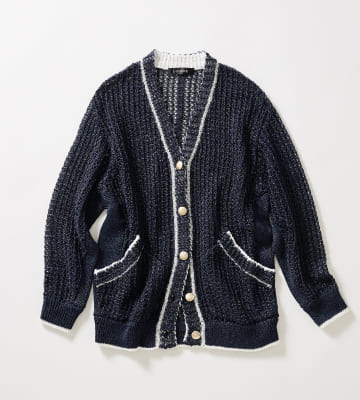 今手に入れるなら、素材もデザインも“変化球”なカーディガンを。ザックリとした清涼感ある編地とドライな肌触り、ゆるっとしたサイズ感が大人カジュアルな雰囲気。サッと肩掛けてコーデに一ひねりを加えて。