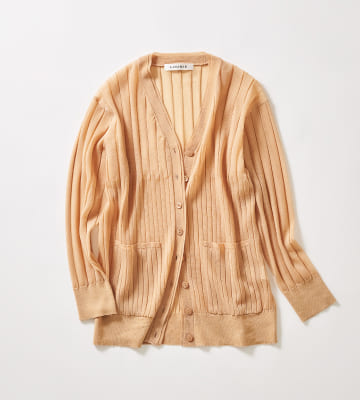 光沢感のある糸をあまく編み上げて、シアーな素材感に。複雑なリブの編地がカーディガンを今っぽく、存在感ある1枚へ。