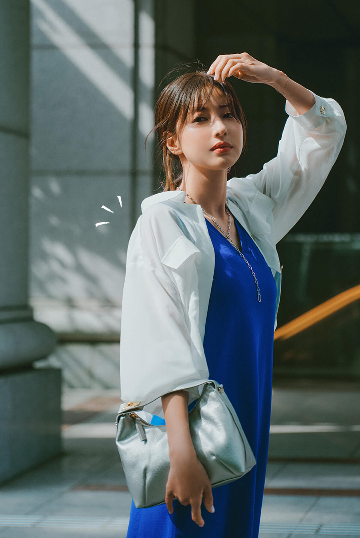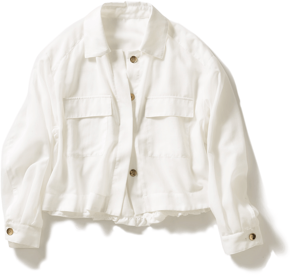 カジュアルなブルゾンもエアリー素材ならセンシュアルなムードに。背中の裾部分をバルーンデザインにすることで、ふんわり大人可愛く。今年らしいショート丈はワンピースと好相性。