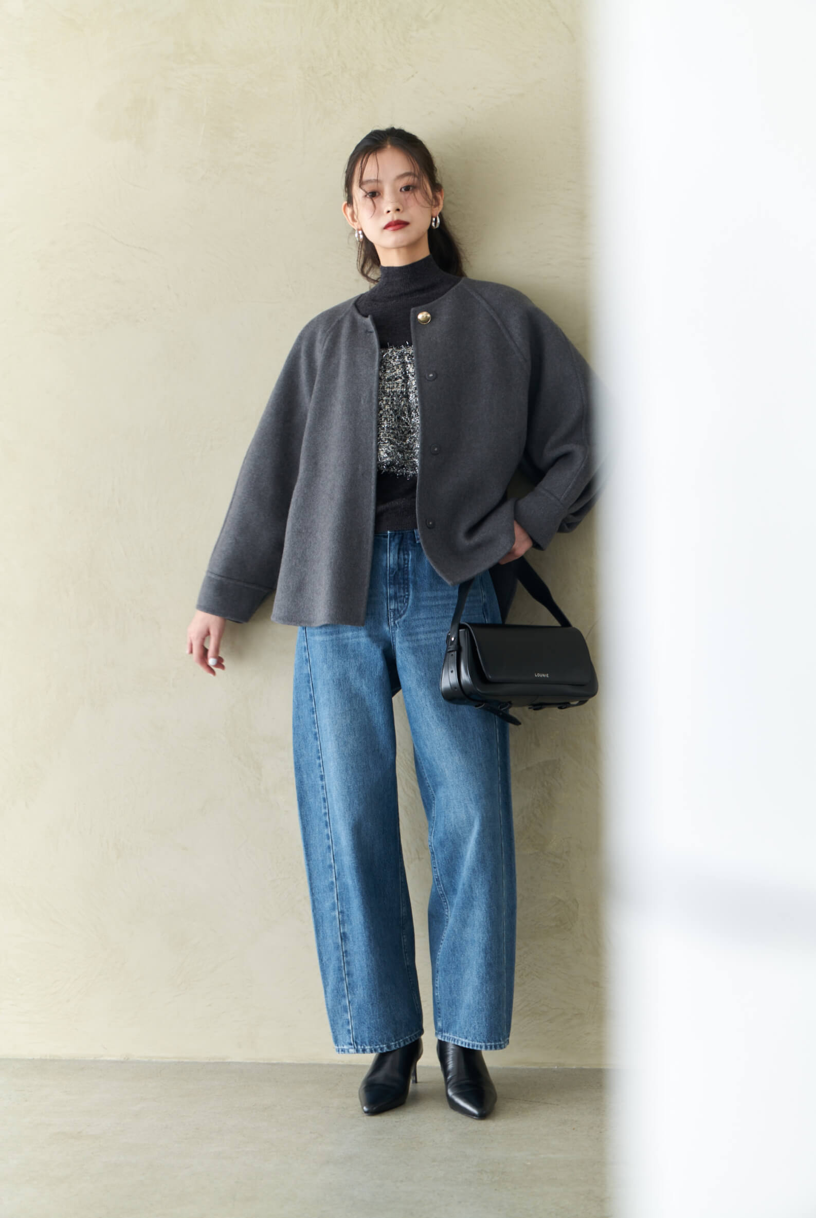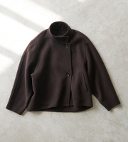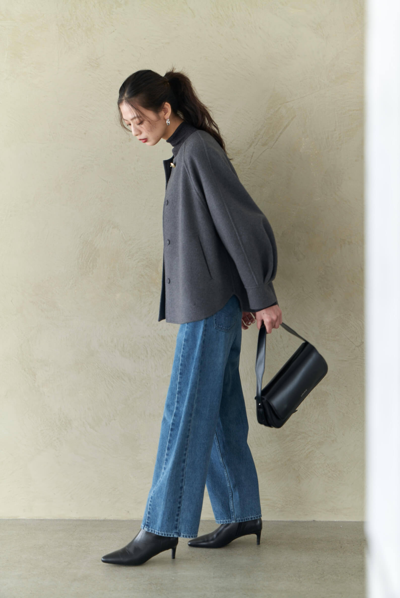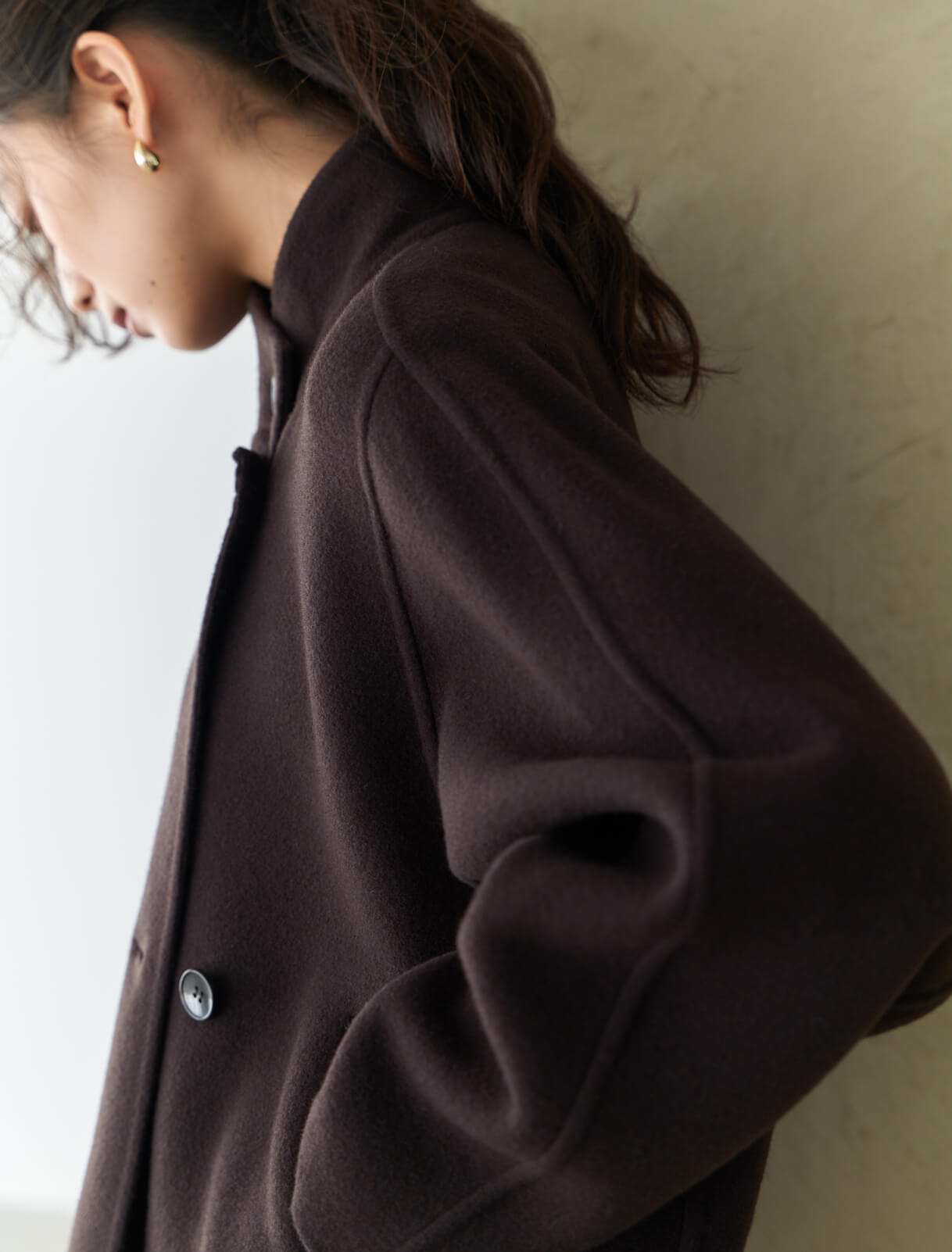 ダブルフェイス素材にほんのり起毛感を持たせて、両面をビーバー仕上げに。エレガントな表面感が美しい1着。デニムとの着こなしも上品にまとまる。