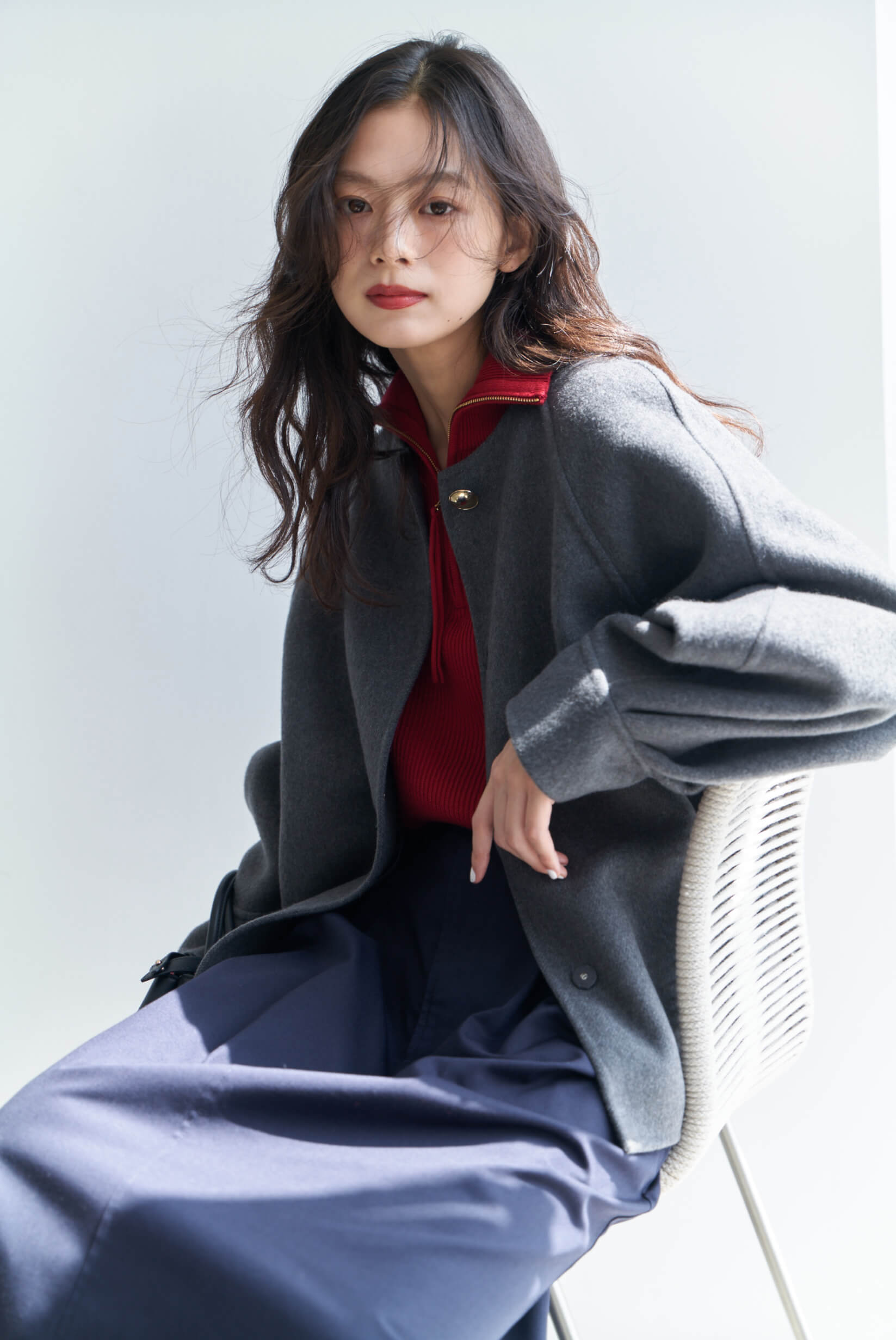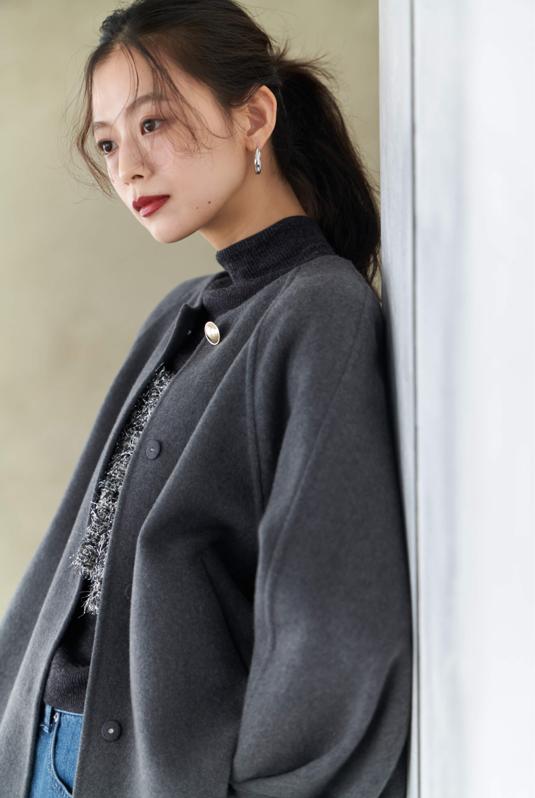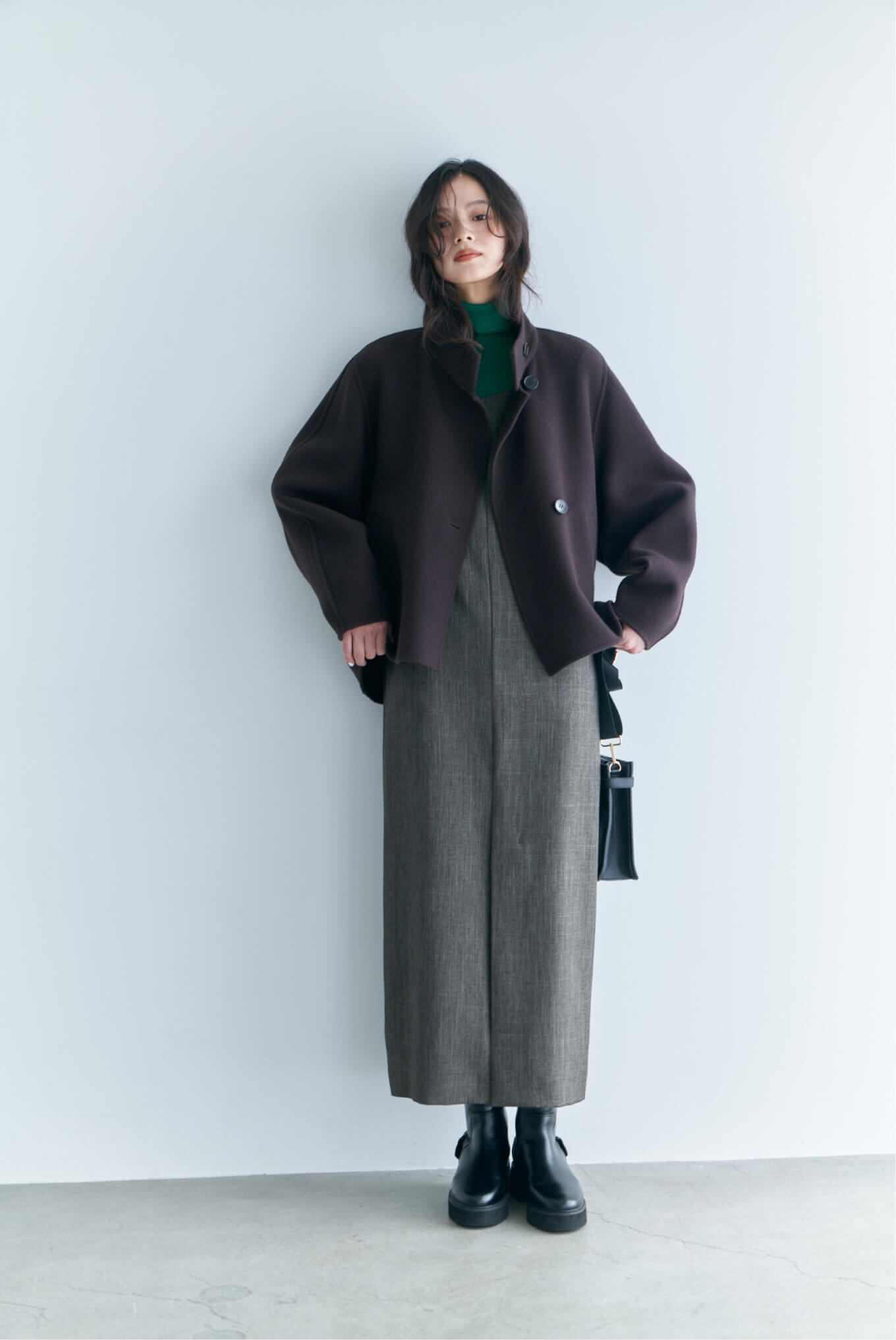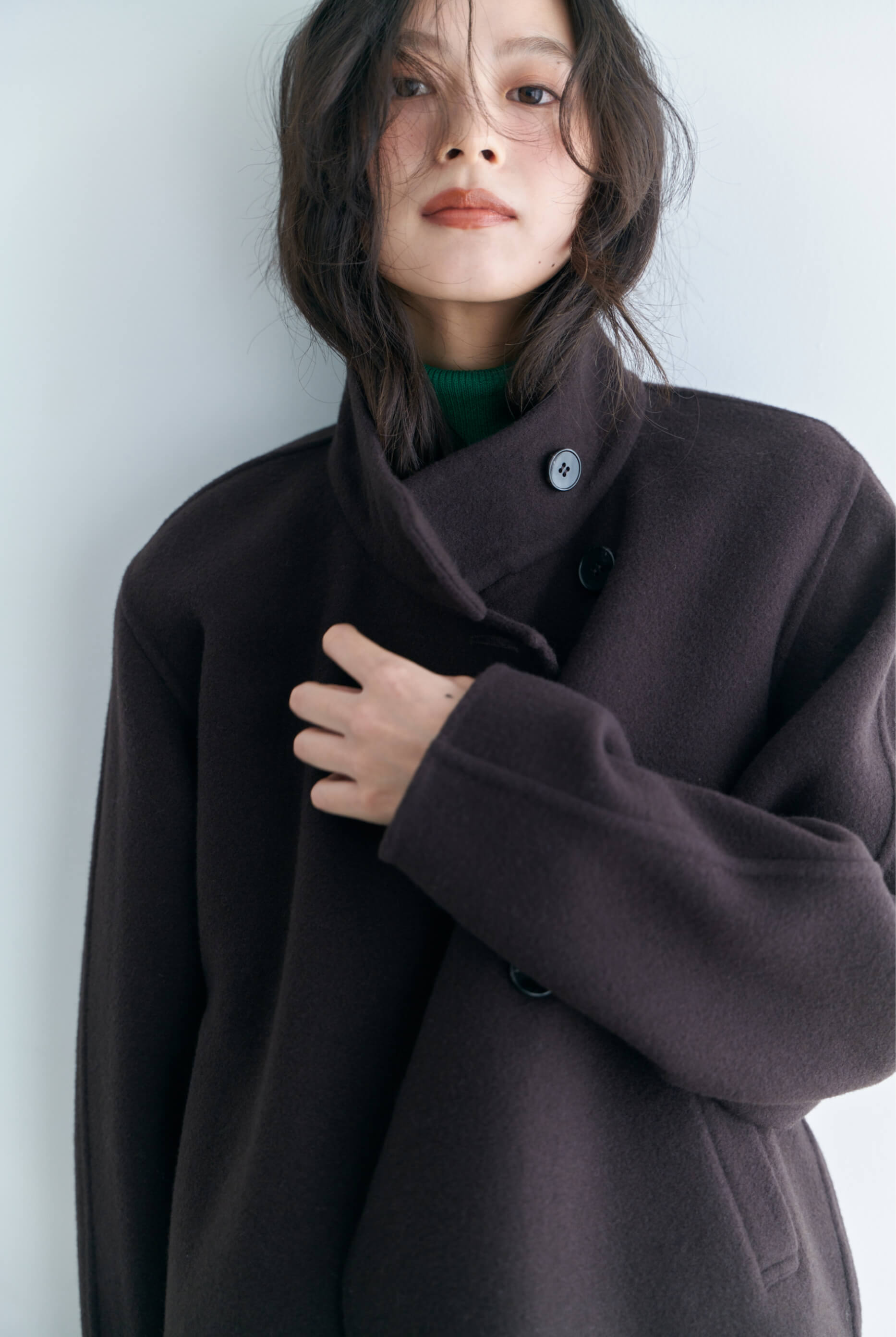程よい肉感とソフトな風合い。上質なダブルフェイス素材を活かしたシンプルなデザインが魅力。スタンドカラーデザインが顔周りをスッキリ見せつつ、暖かさをキープ。衿元からトレンドカラーのグリーンを覗かせて。