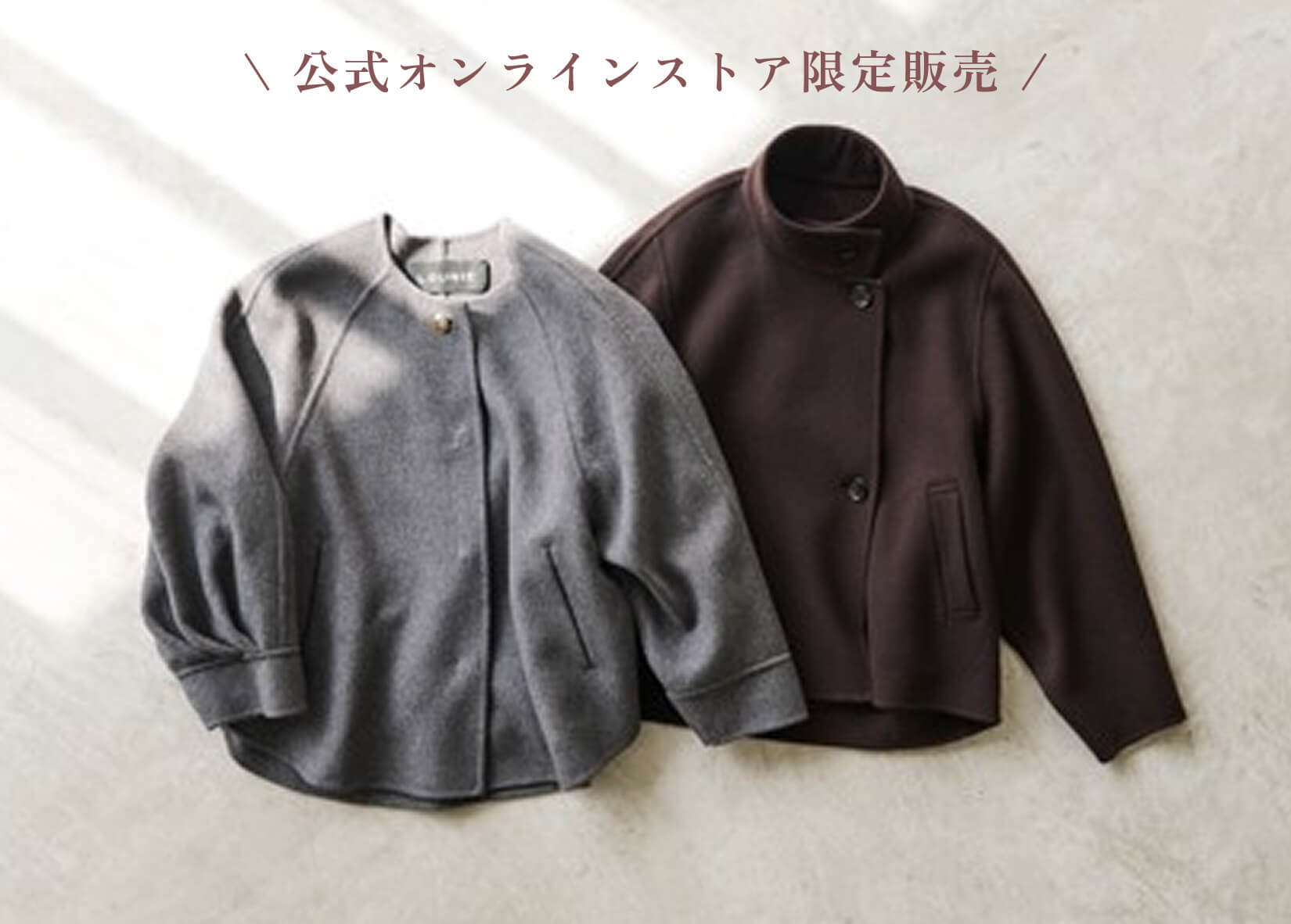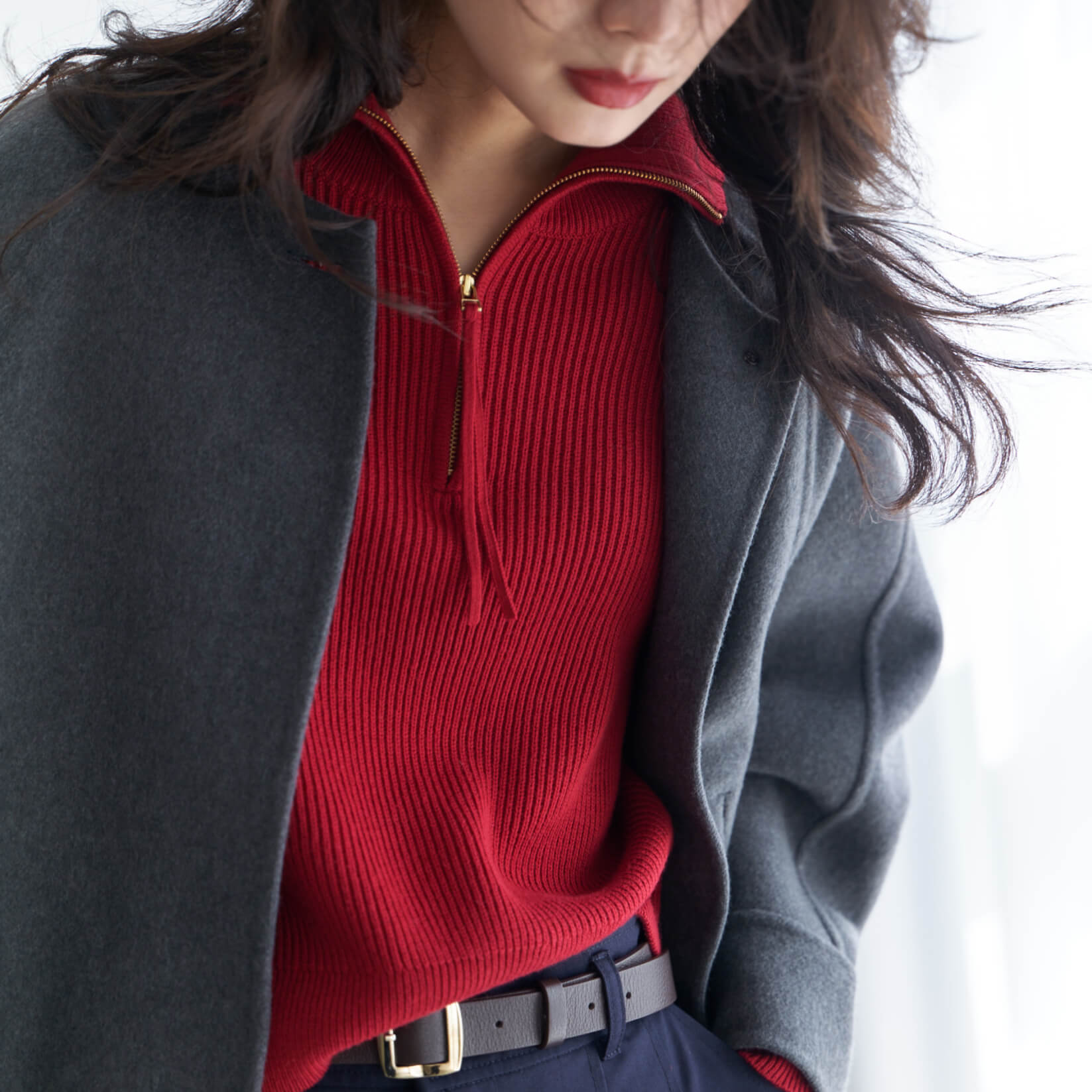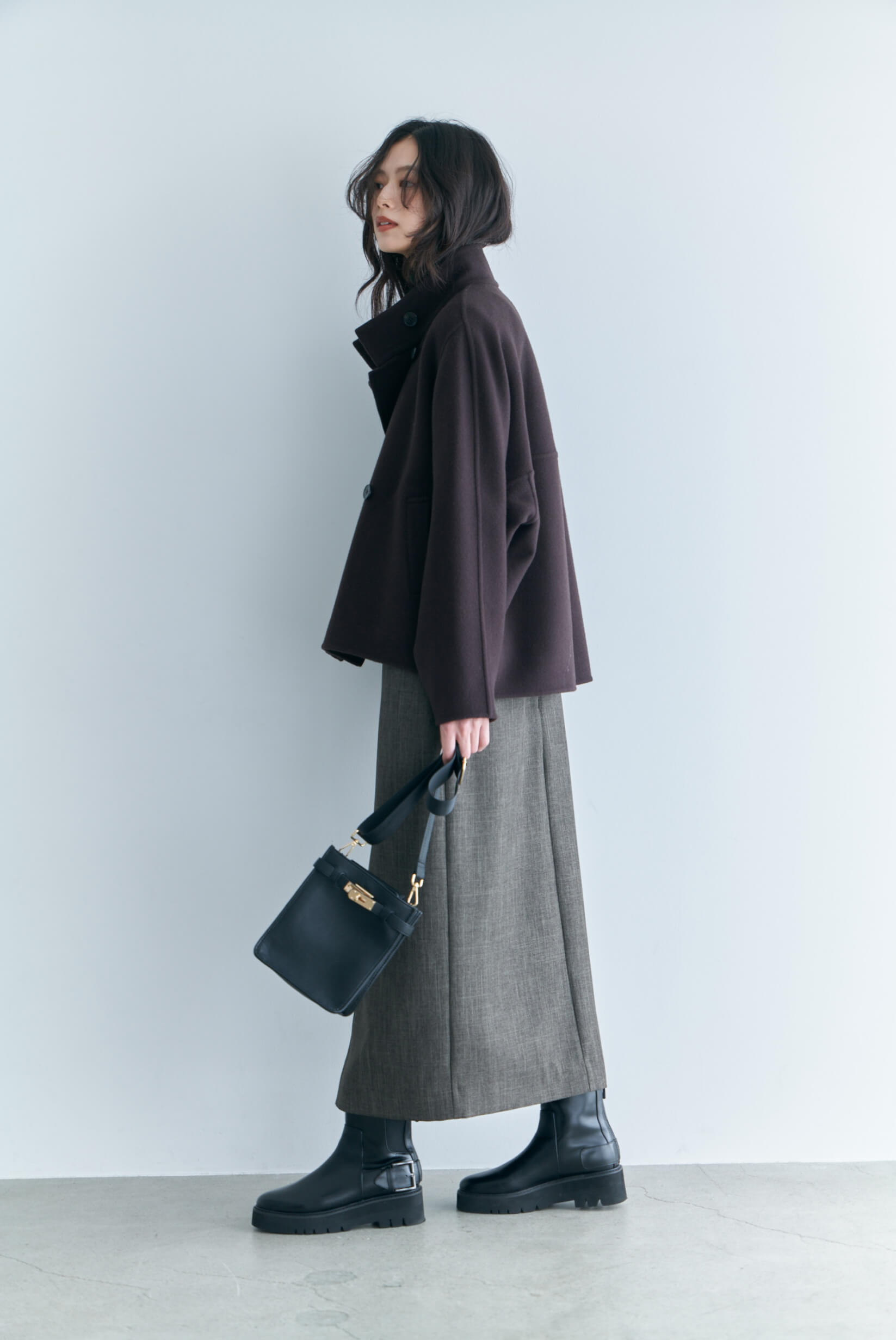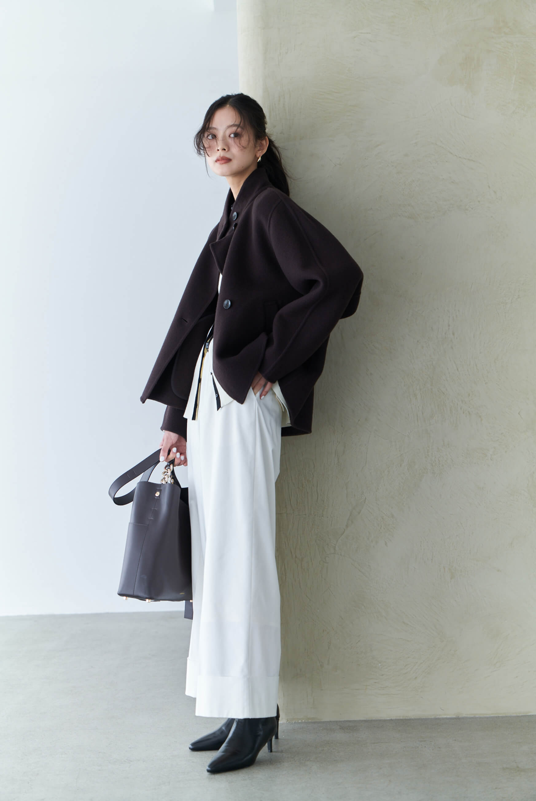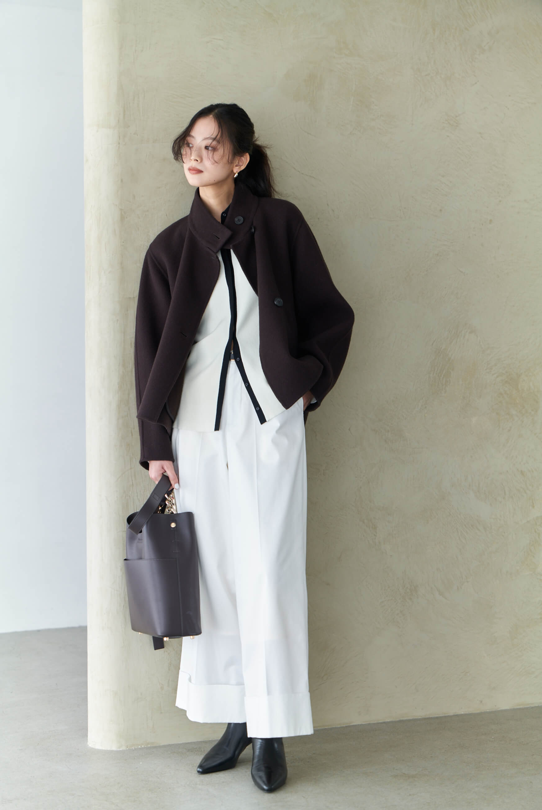 程よい肉感とソフトな風合い。上質なダブルフェイス素材を活かしたシンプルなデザインが魅力。スタンドカラーデザインが顔周りをスッキリ見せつつ、暖かさをキープ。衿元からトレンドカラーのグリーンを覗かせて。