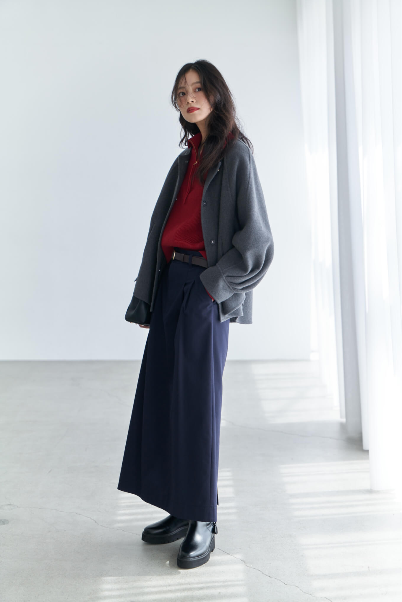 袖口のたっぷりとしたタックがやわらかなフォルムを作り出す。リラックス感あるシルエットは厚手のトップスをINしてもOK。大ヒット中のハーフジップニットとも好相性