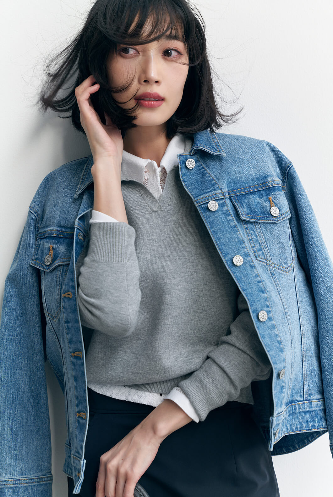 スキッパーニットに、Gジャンとレーシーニットの重ね着で奥行きのある表情に。 45周年のアニバーサリーマークが光るニットとキャップを合わせれば、特別感漂う都会的なスポーツミックスが完成します。
