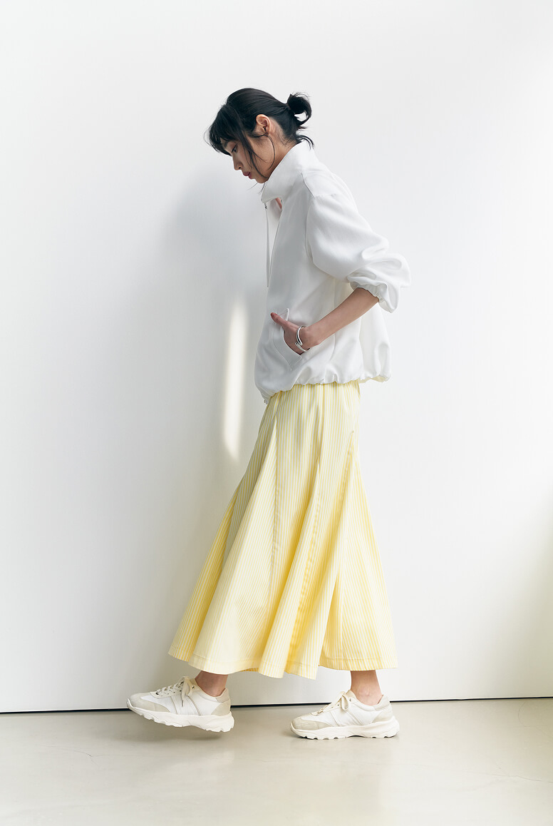 しなやかでシワになりにくい素材を活かした、広がりすぎない上品なフレアシルエットが魅力。 白いジップブルゾンと合わせることで、ストライプの爽やかさが際立つ軽快な装いに仕上がります。