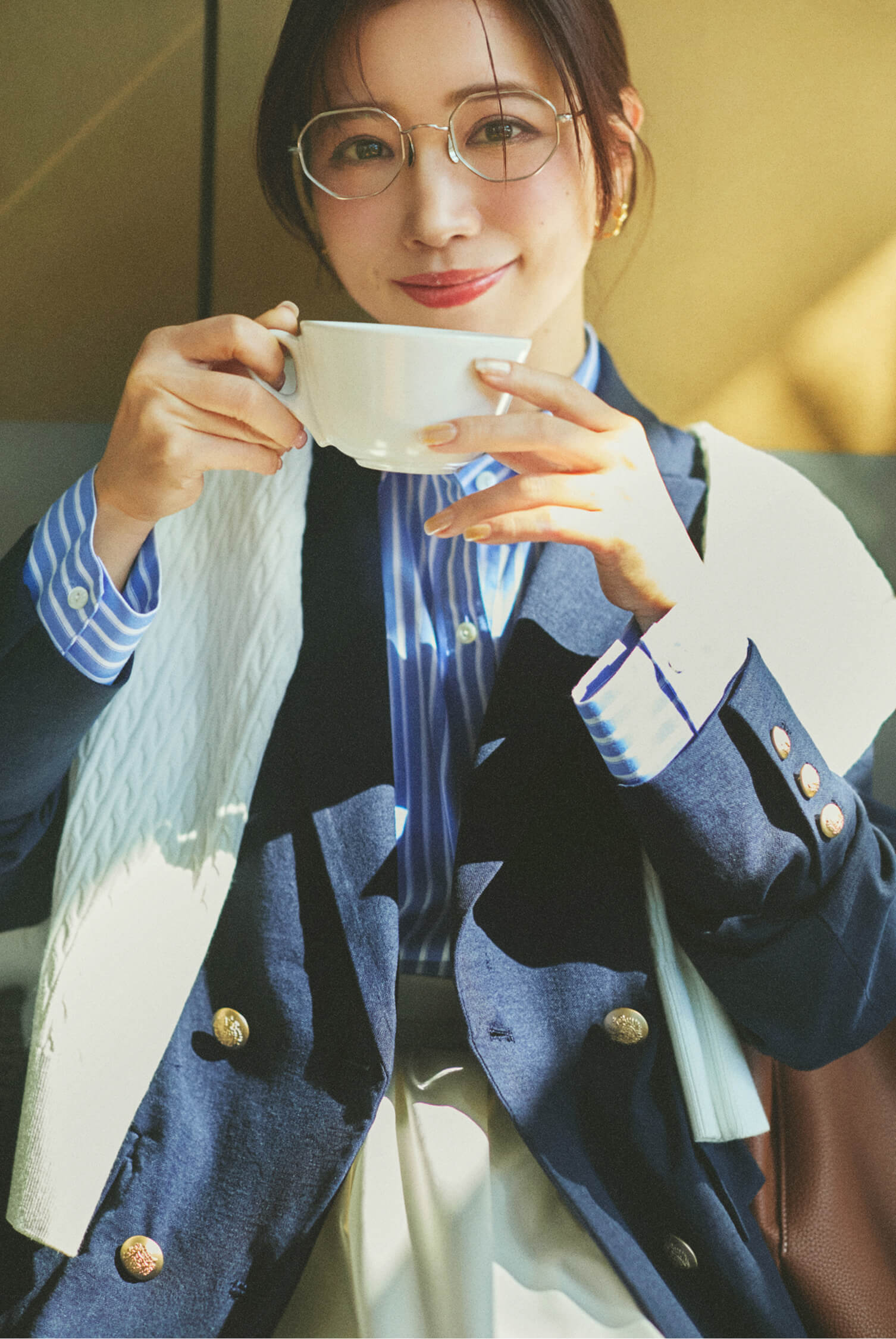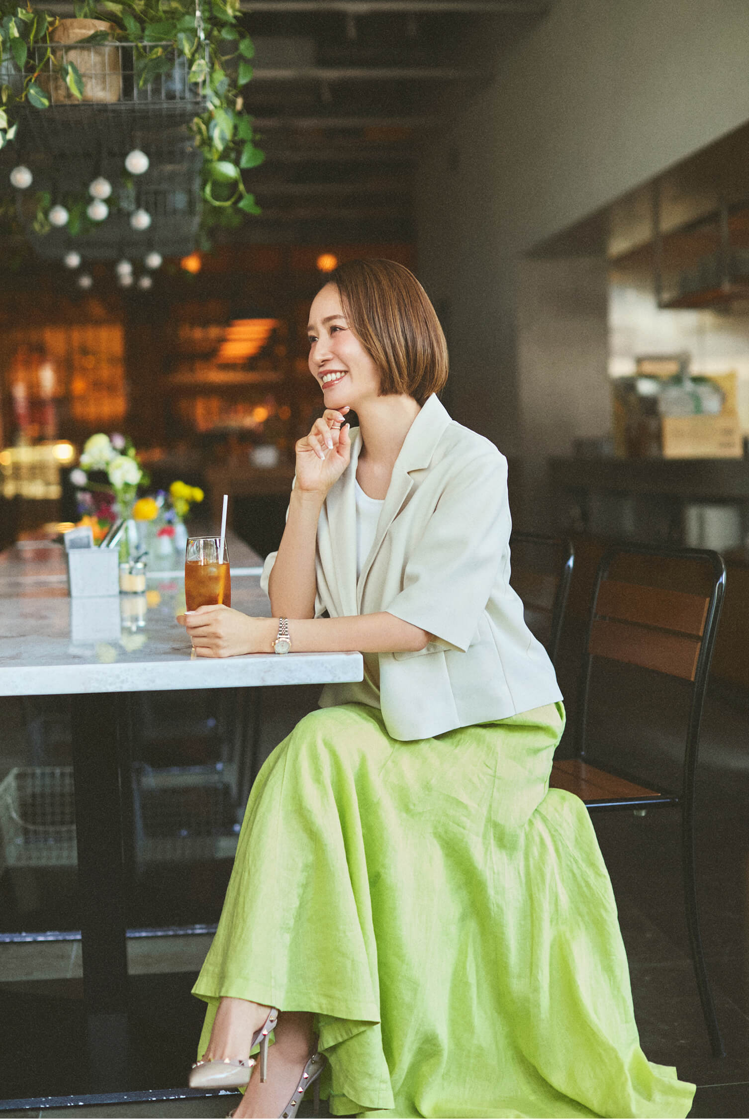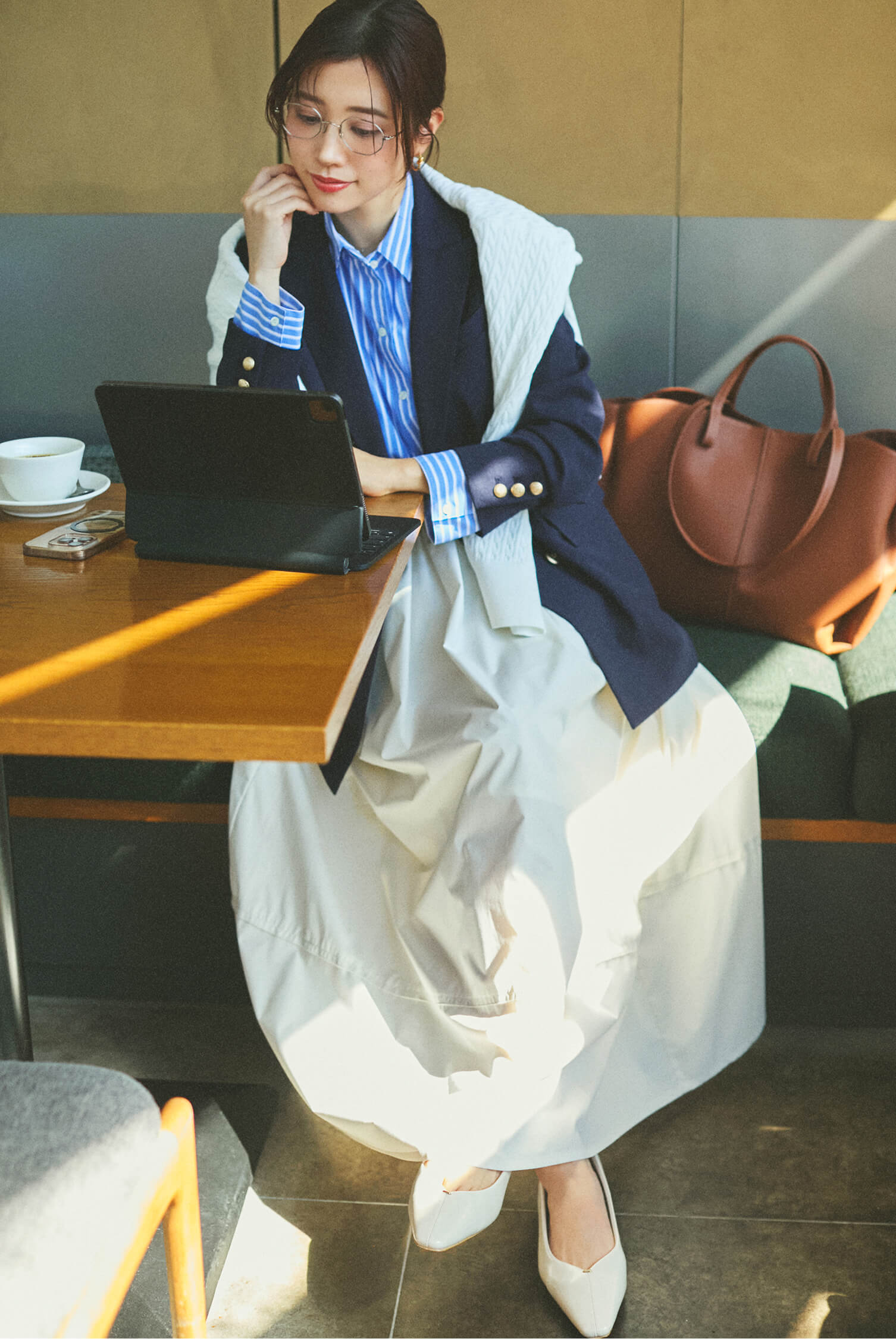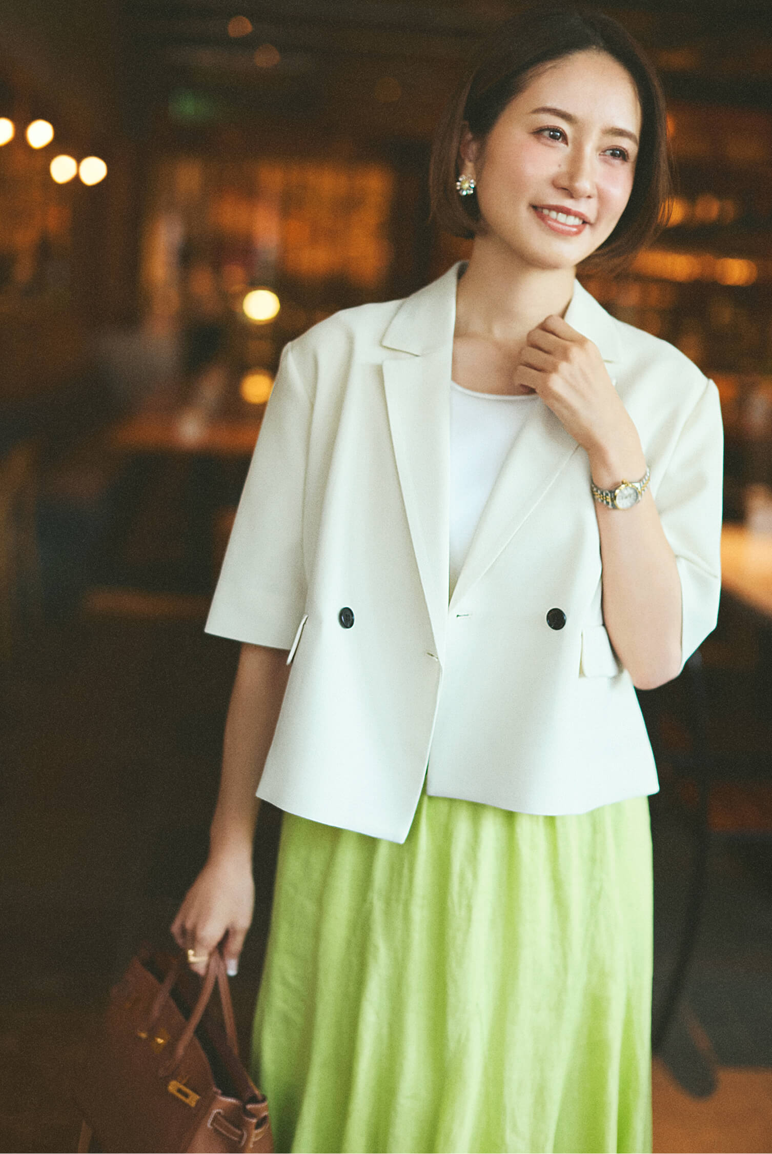 「お昼の会食は、相手に失礼のないようジャケットを羽織って、清潔感のあるきちんとスタイルに。カラースカートを合わせて、華やかさをプラスしました。 ジャケットを重ねてもインナーのニットがすっきり綺麗に収まるので、背筋をスッと伸ばして会話を楽しめます。」