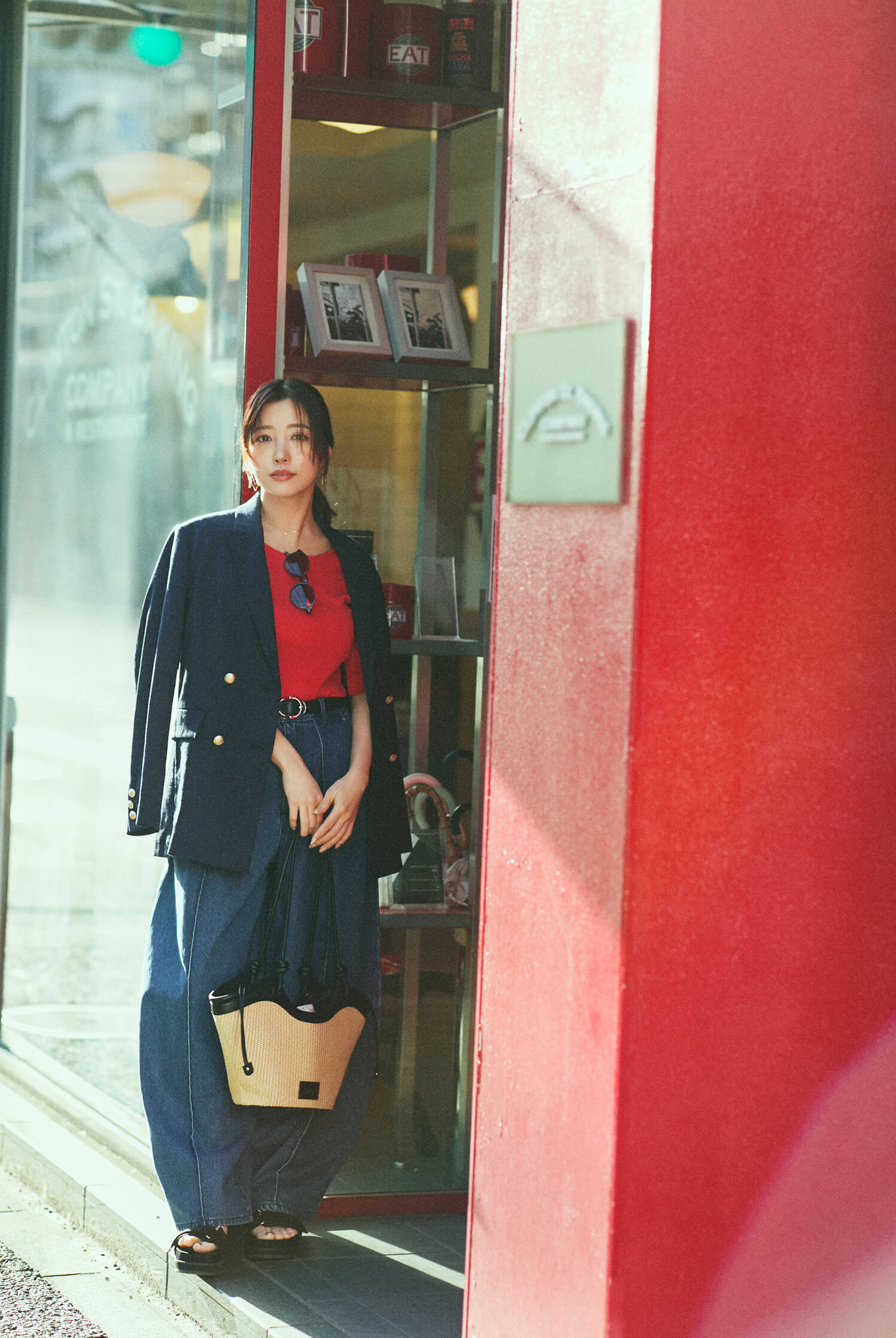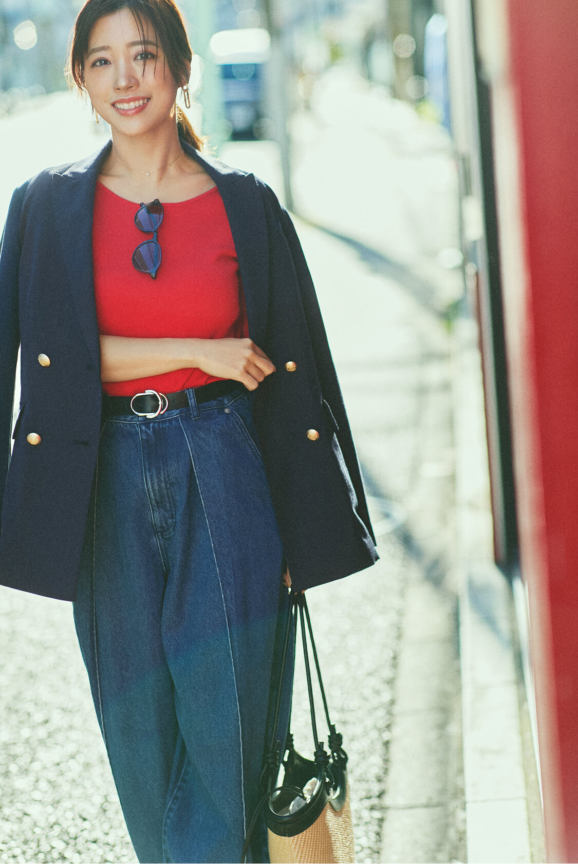 「休日の美容デーは、赤のトップスを主役にデニム×紺ブレで大人っぽいきれいめカジュアルに。ジャケットにUVカットや遮熱機能が備わっているので、強い日差しや暑さを気にせず外出を楽しめるようになりました。ラフさときちんと感のバランスがちょうどよく、これ一着でどこへでも行けると思える安心感があります。」