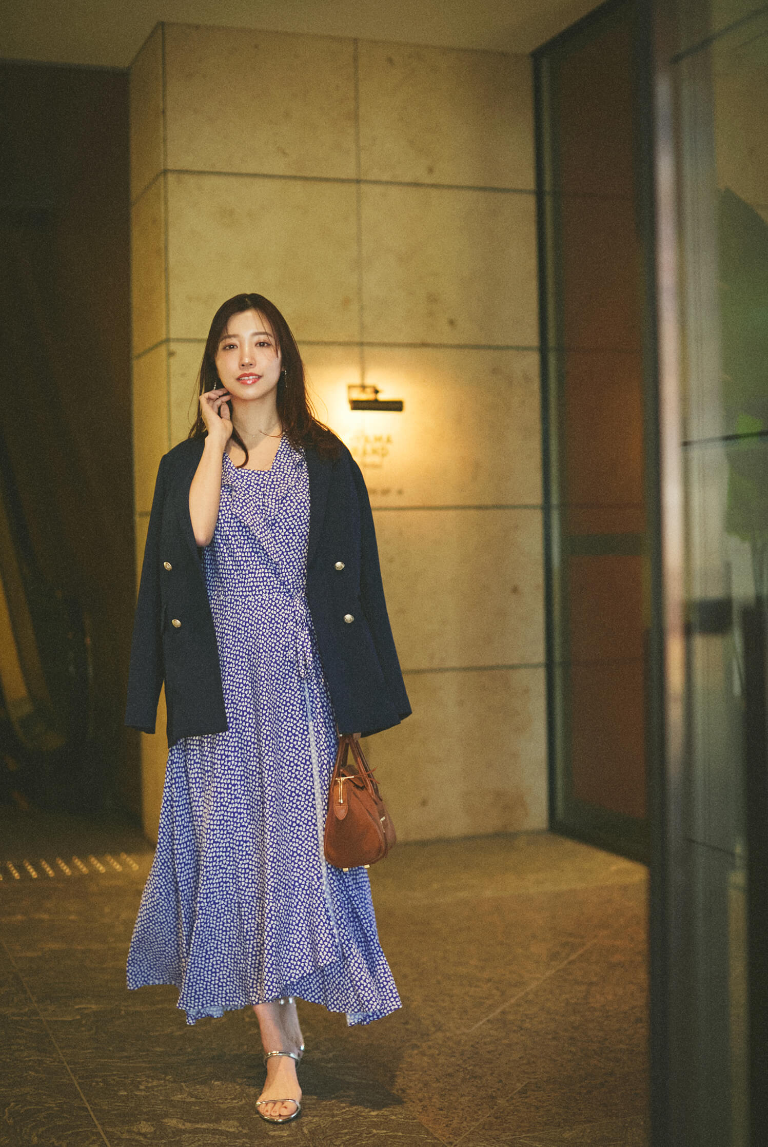 「特別な日のディナーは、ブルーのハート柄ワンピースに紺ブレを重ねた、品よく知的なワントーンスタイル。 揺れるシルエットの甘さをジャケットで引き締めることで、ホテルシーンにもふさわしいハンサムな華やかさが加わります。 移動中もシワを気にせず美しい状態をキープできるので、自信を持って次の予定へ向かえる安心の一着です。」