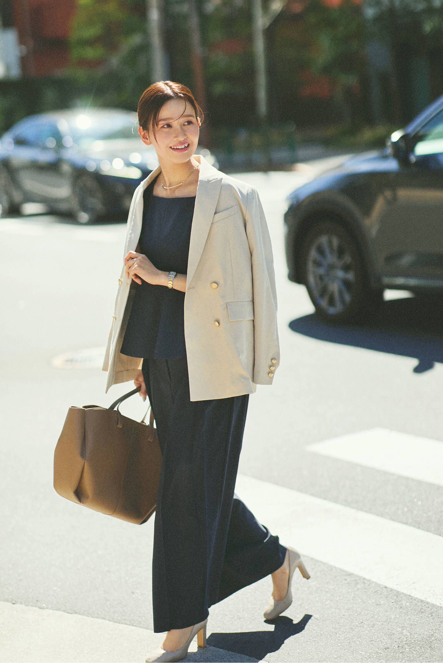 「忙しい朝は、余計なことをせずセットアップで潔く楽しみたい。 上下で合わせるだけで洗練された雰囲気が一気に高まり、無駄なく綺麗なお仕事スタイルが完成します。 ジャケットを羽織ることで全体がさらに引き締まり、信頼感のある印象に。」