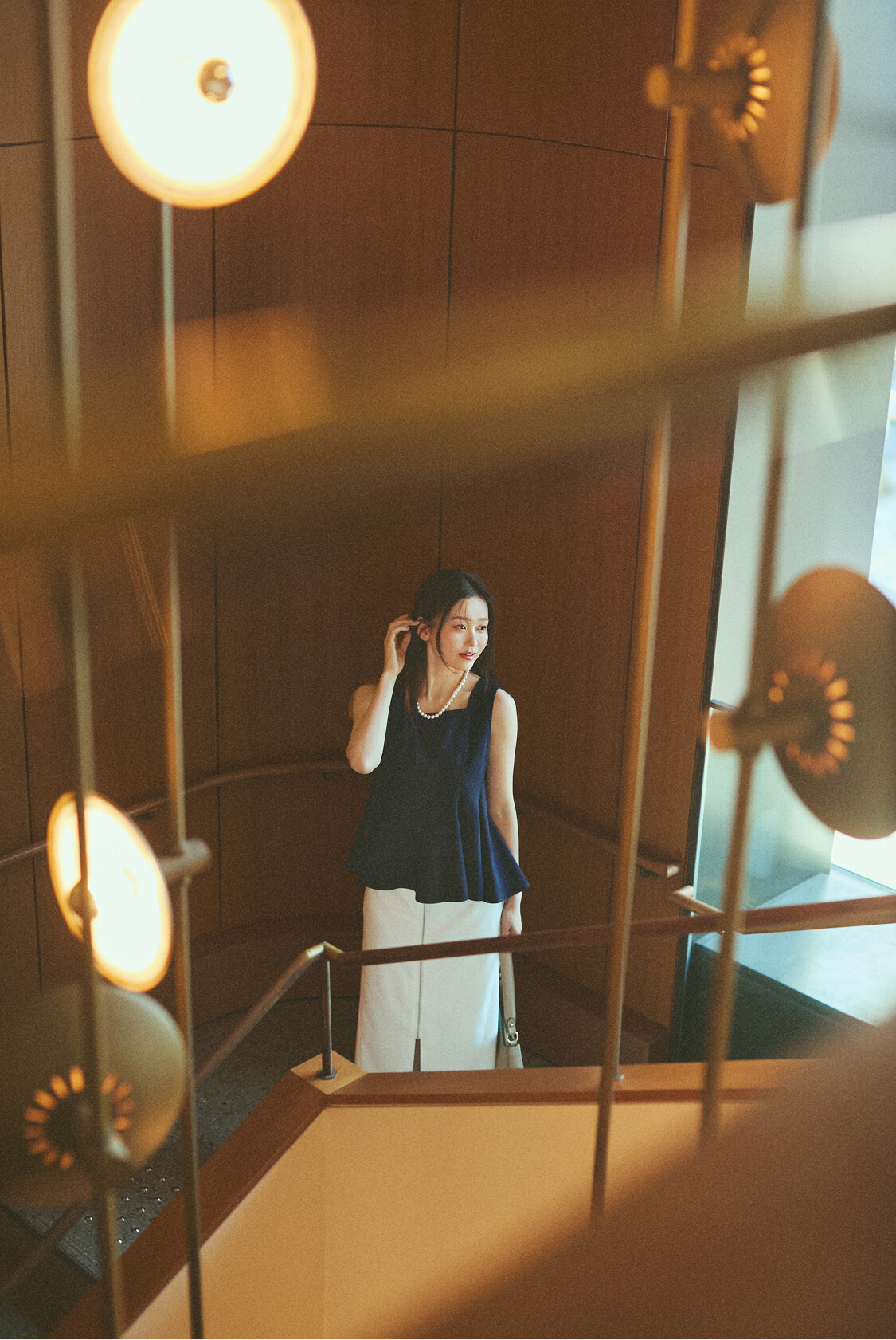 「休日の美術館は、ペプラムの立体感とタイトスカートの縦ラインを活かした、上品なきれいめスタイルで。 エレガントなスカートとも相性が良く、合わせるだけで洗練された女性らしいムードに。」