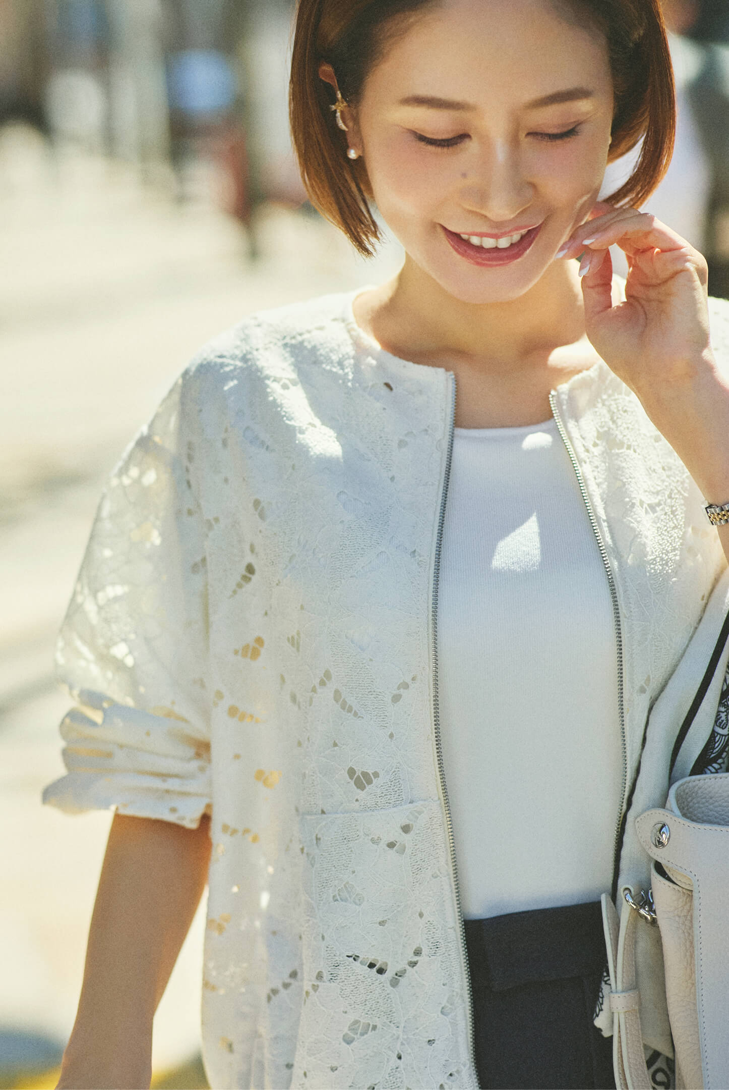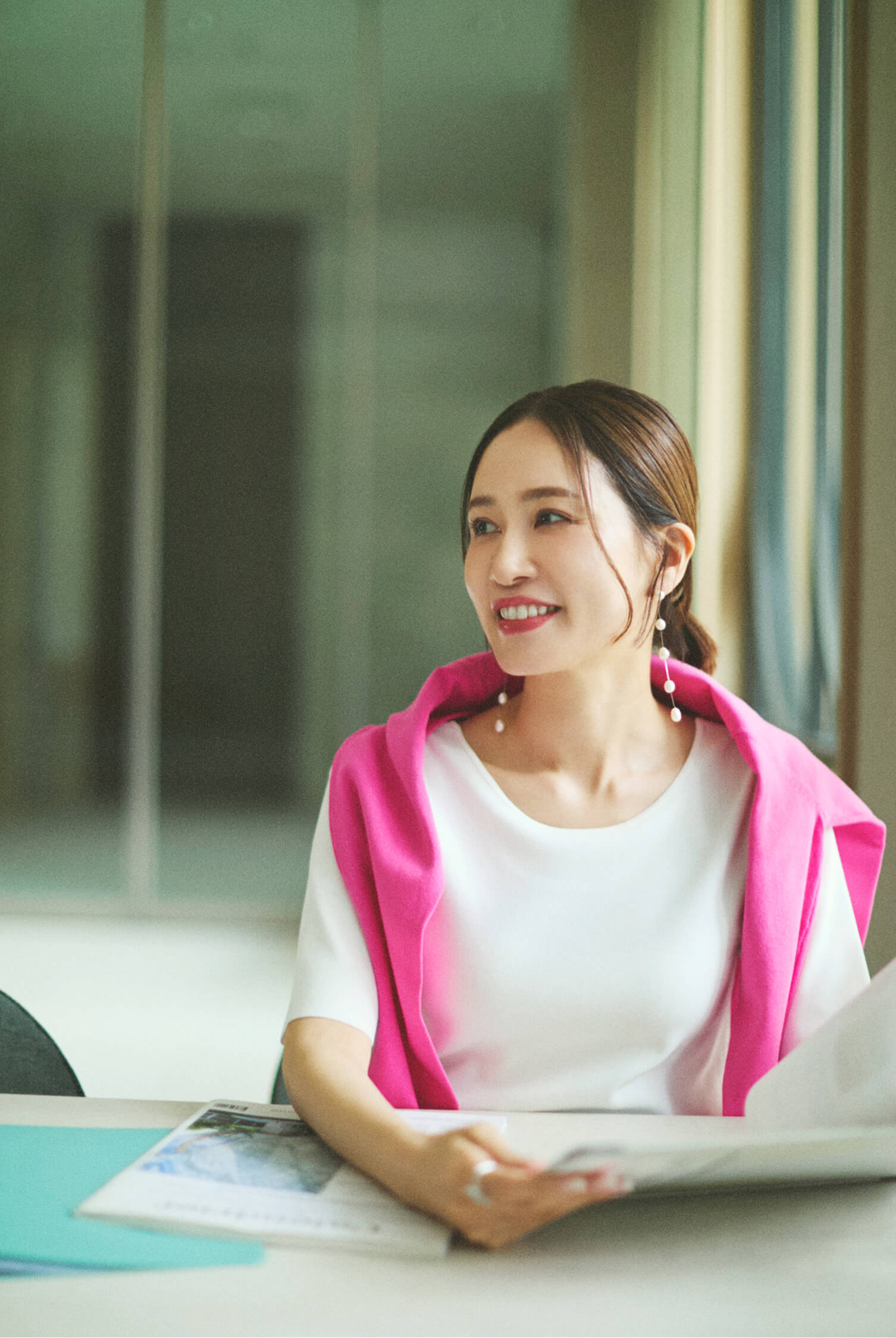 「会議の日は、内側からポジティブなエネルギーが湧いてくるような、春らしいピンクを顔周りに。 清潔感あふれる上下ホワイトのコーデに、ピンクのニットが柔らかなアクセントを添えてくれます。」