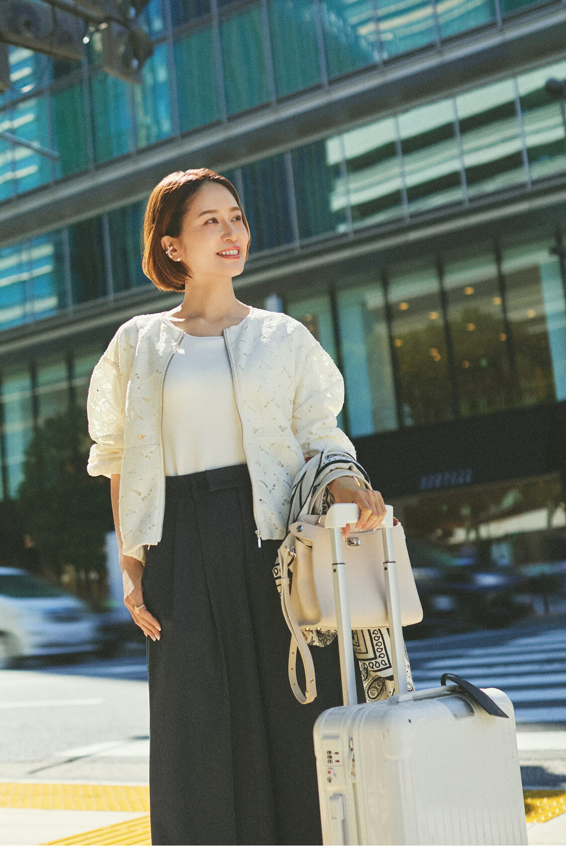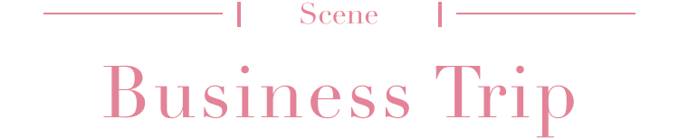 「出張の移動日は、カップ付きニットと柔らかい素材のパンツで、ストレスフリーを追求。 移動中の乗り物での寒さ対策には、透け感のある羽織りを重ねて、軽やかで洗練された印象に。」