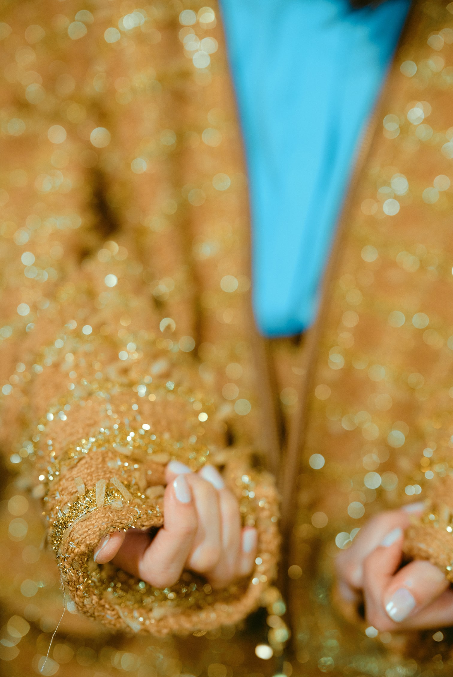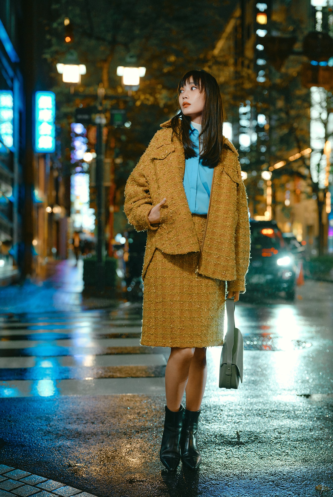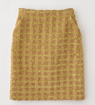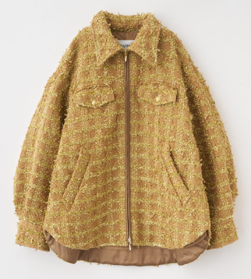 ライトに照らされて、ラメモールの意匠糸が煌めく。クラシックなツイード素