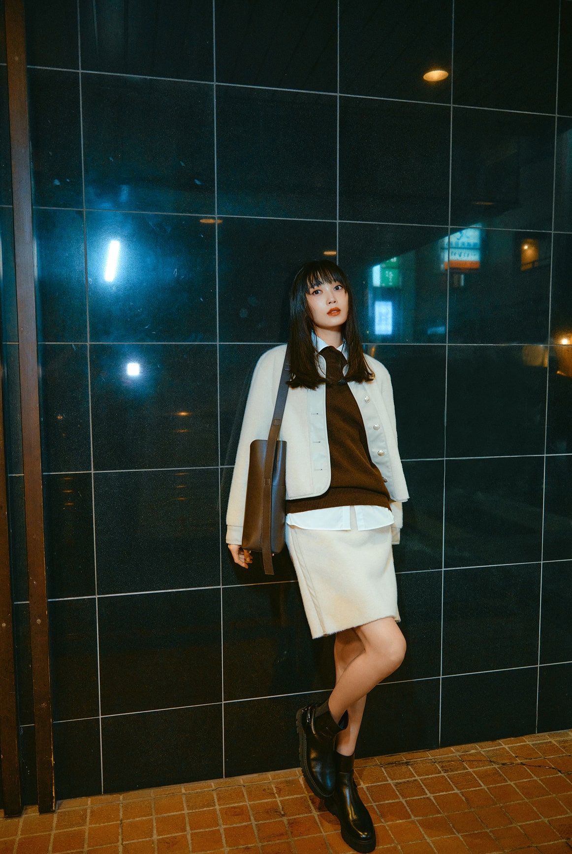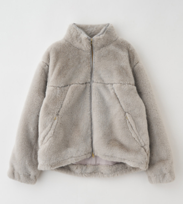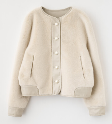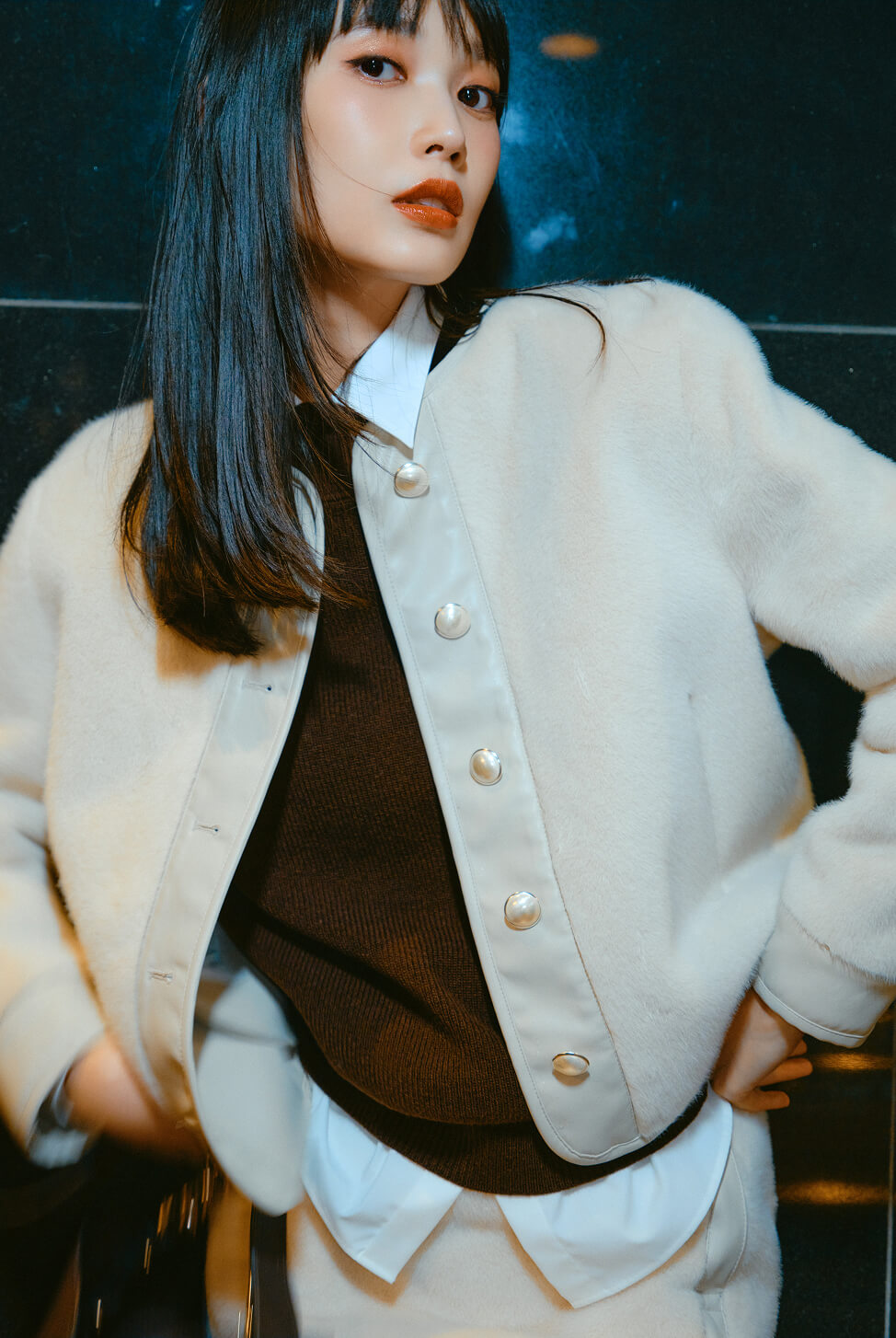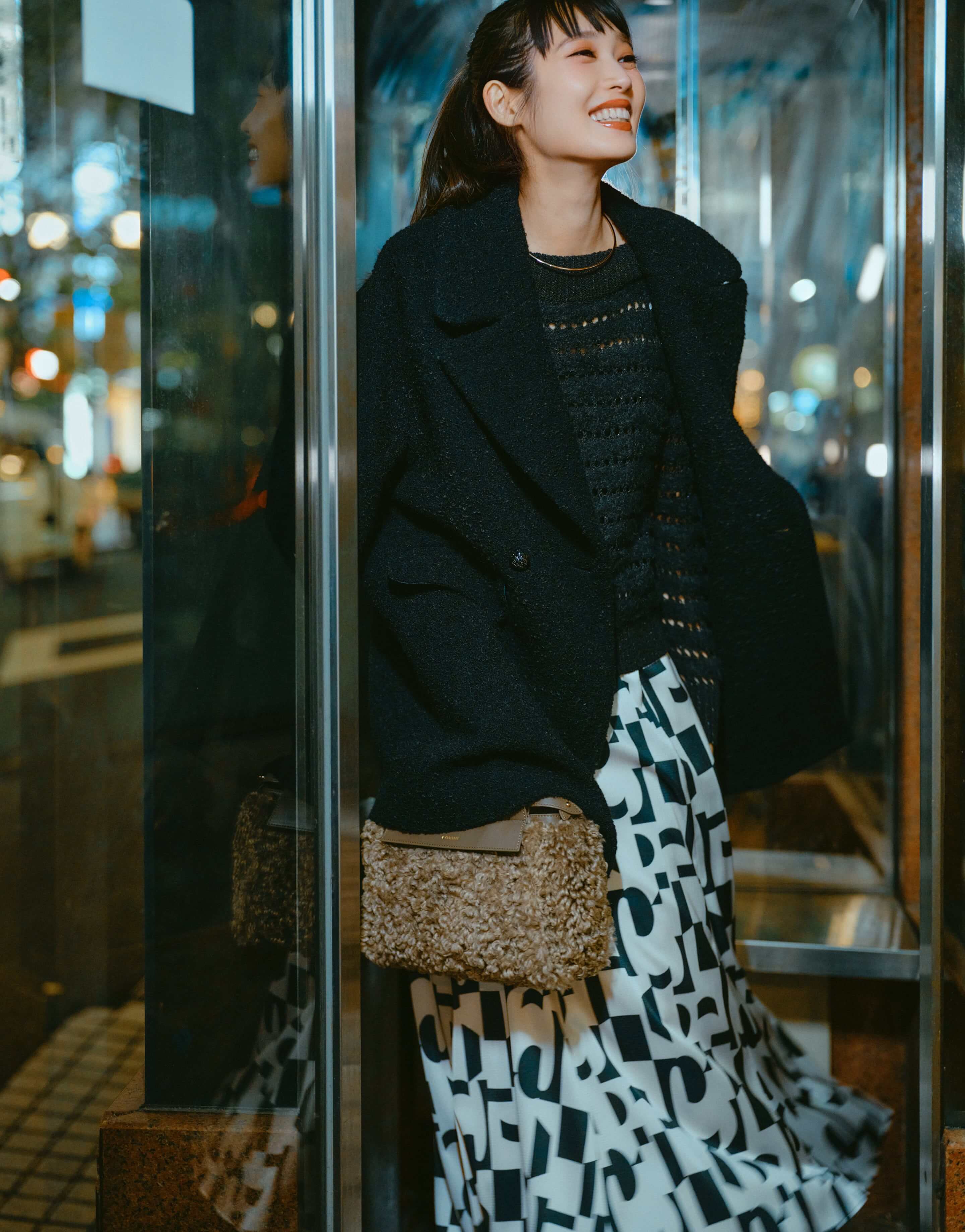 フェイクムートンの表面感が愛らしい。ブルゾンはリバーシブル仕様。昼と夜、表情の違う着こなしが楽しめる。