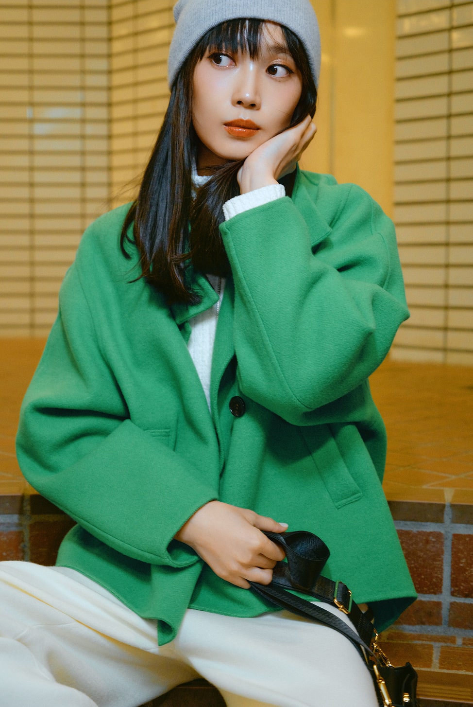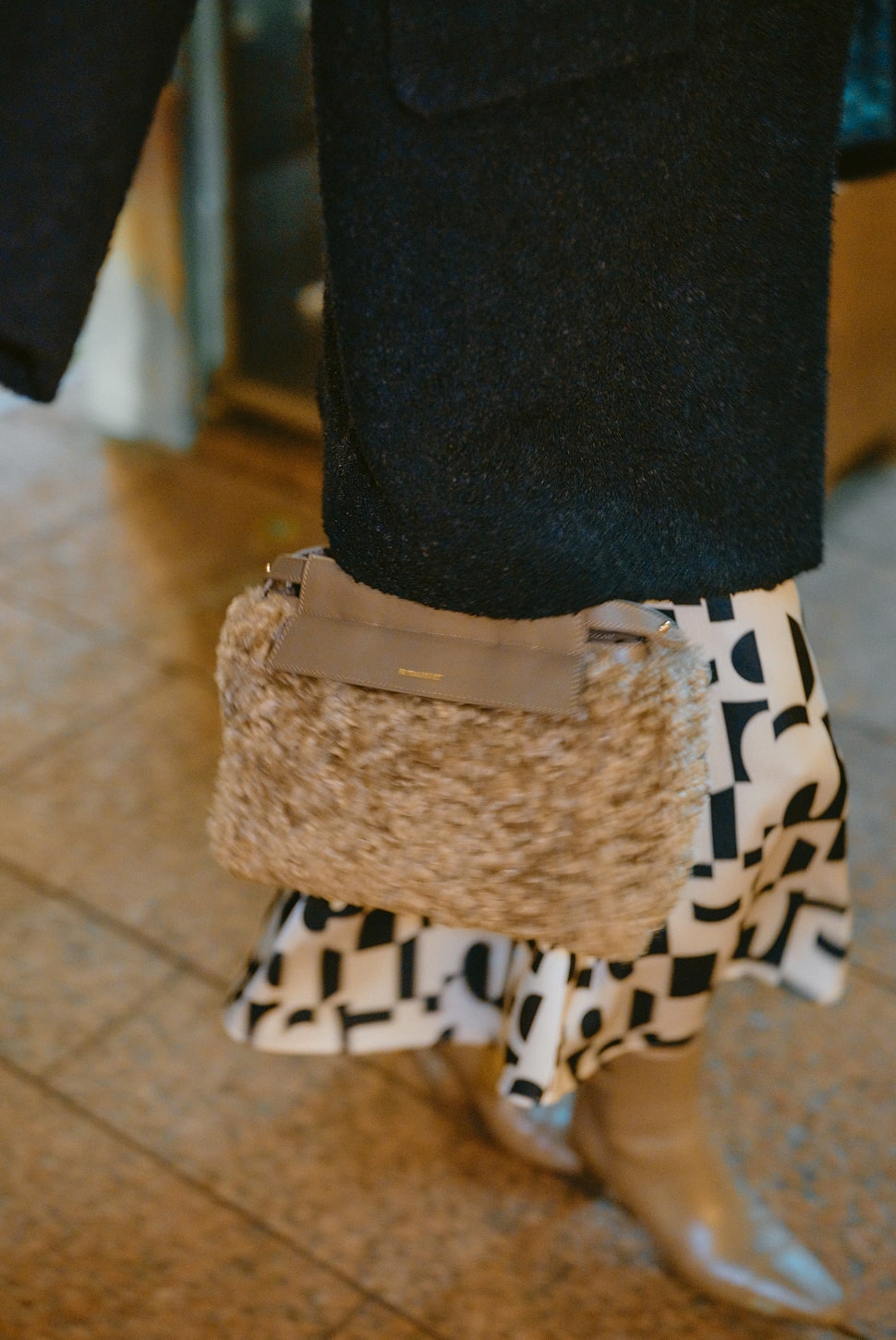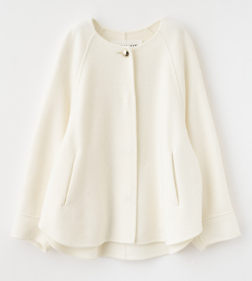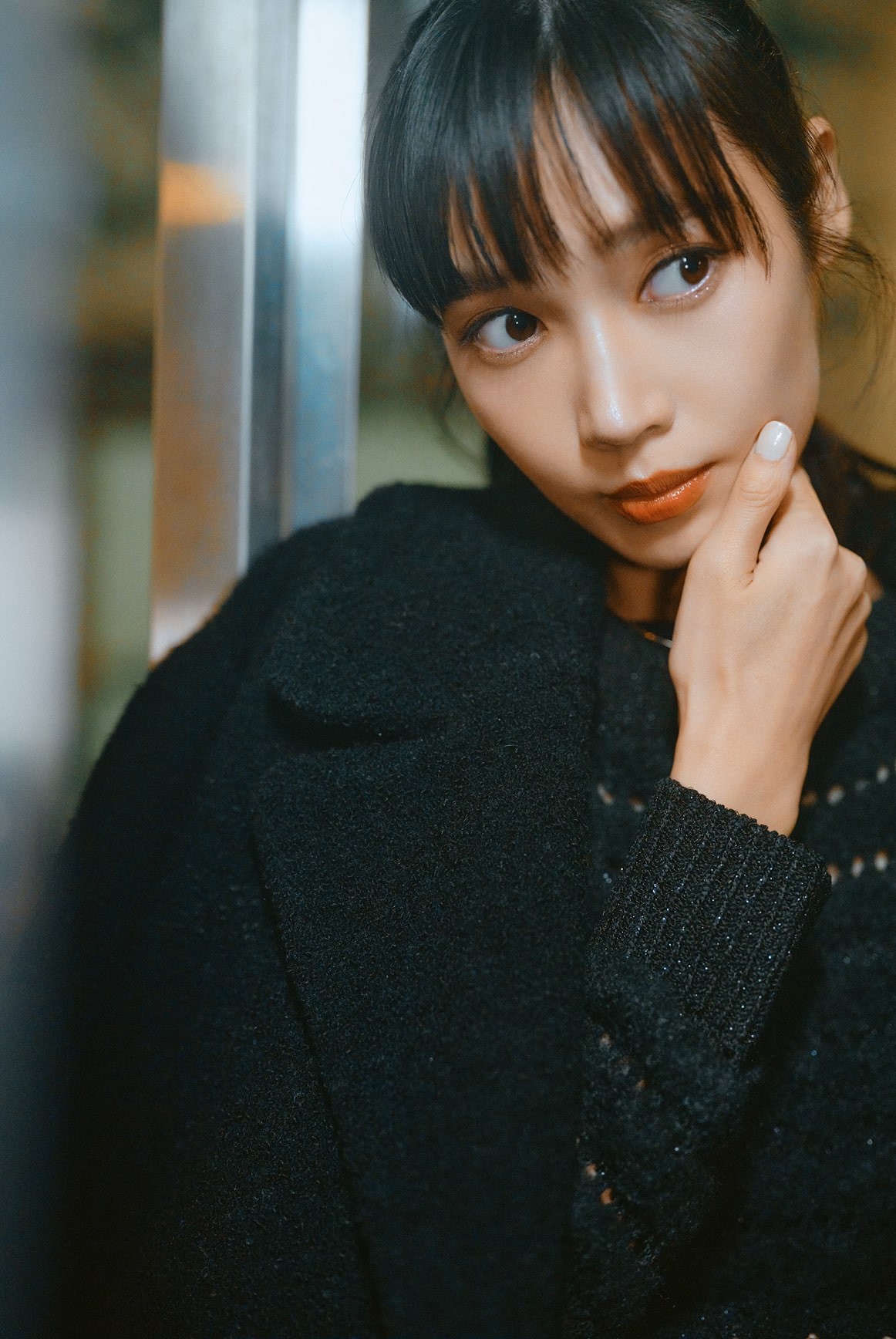 フェイクムートンの表面感が愛らしい。ブルゾンはリバーシブル仕様。昼と夜、表情の違う着こなしが楽しめる。