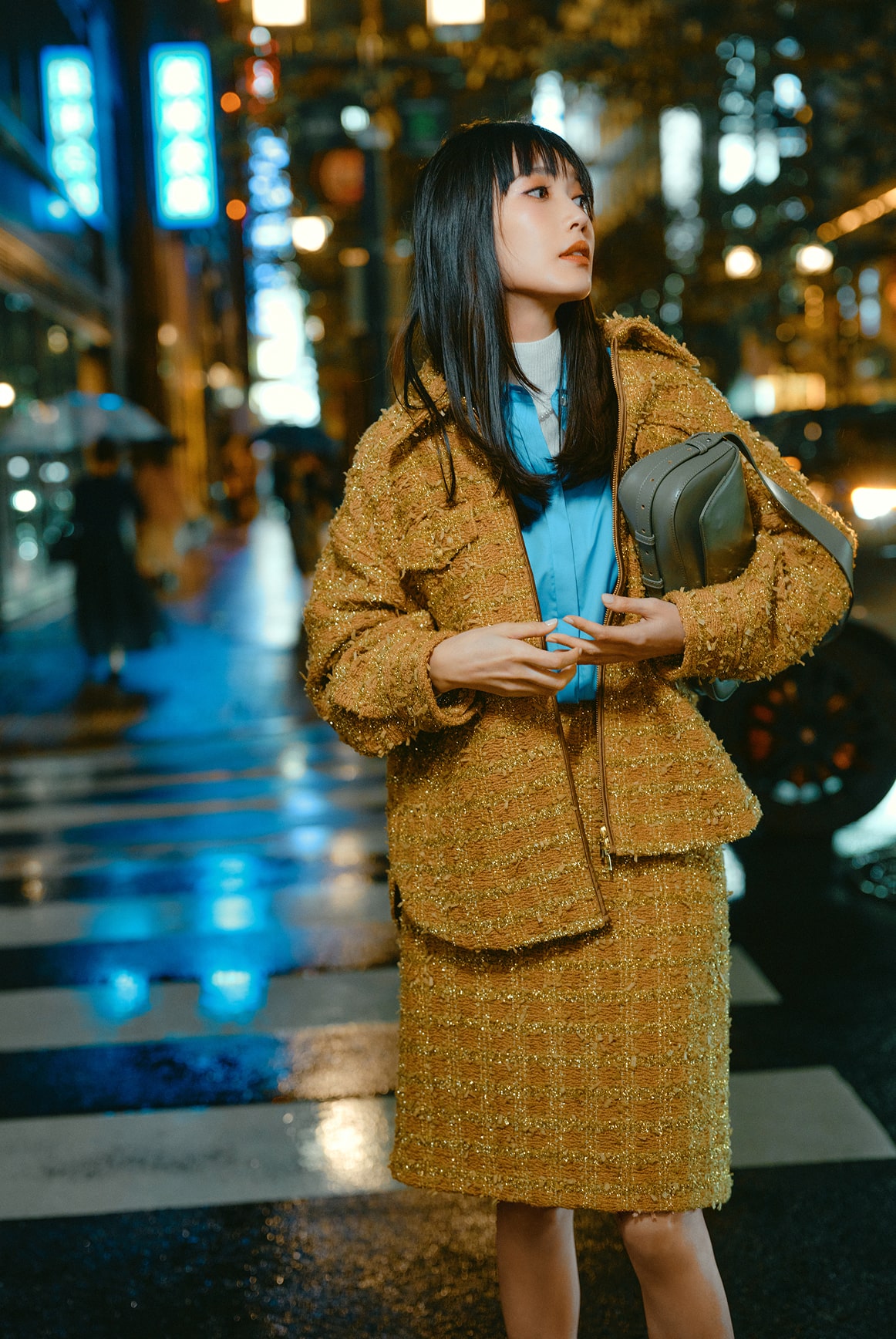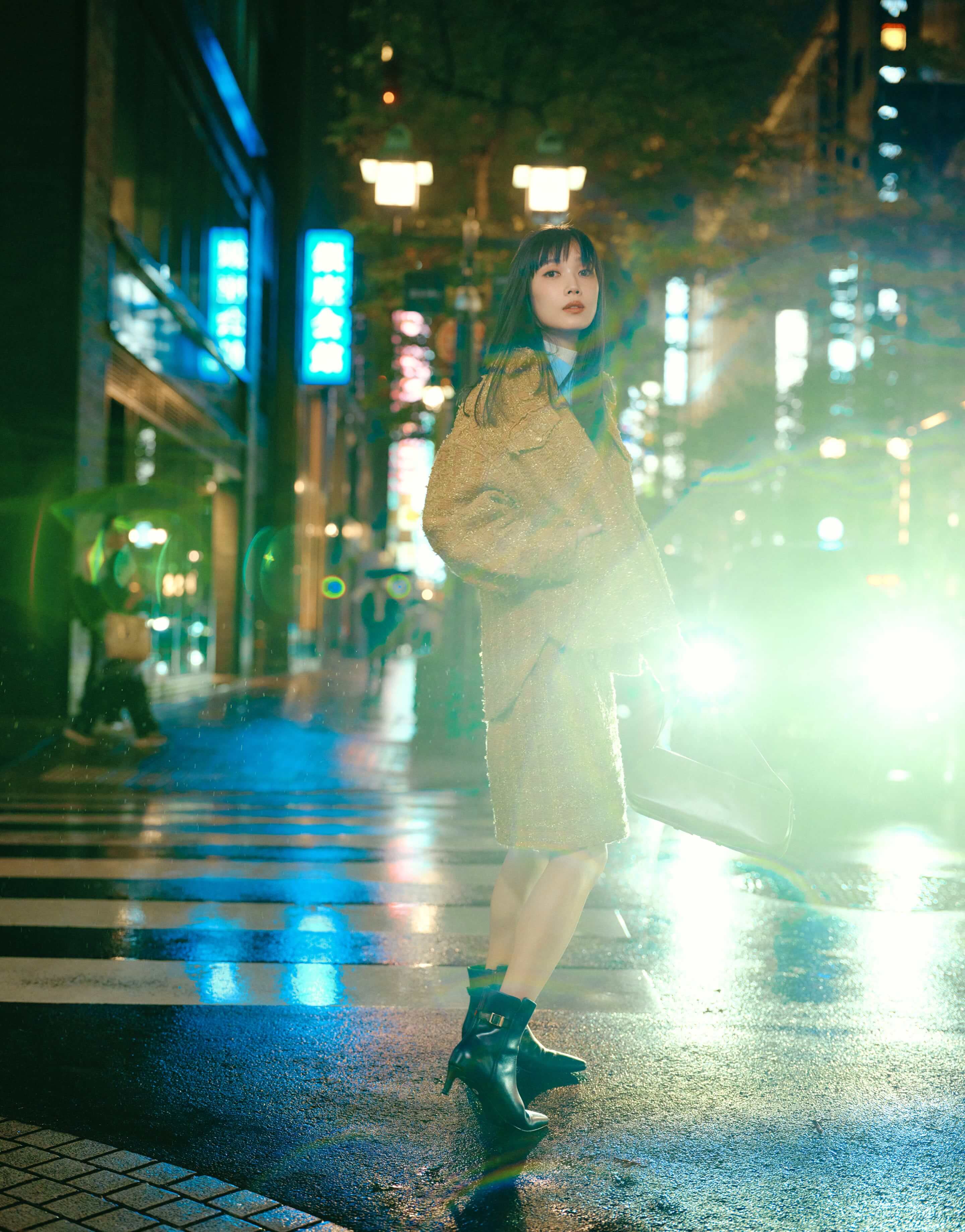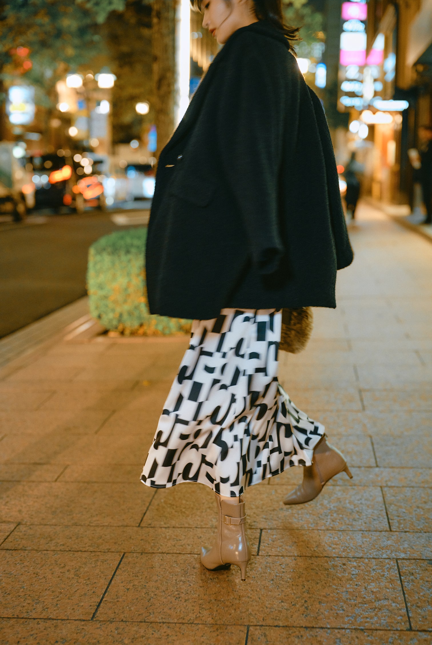 インパクトプリントとサテン素材の光沢感に街が華やぐ。レトロムードを纏って、夜を駆け抜ける。