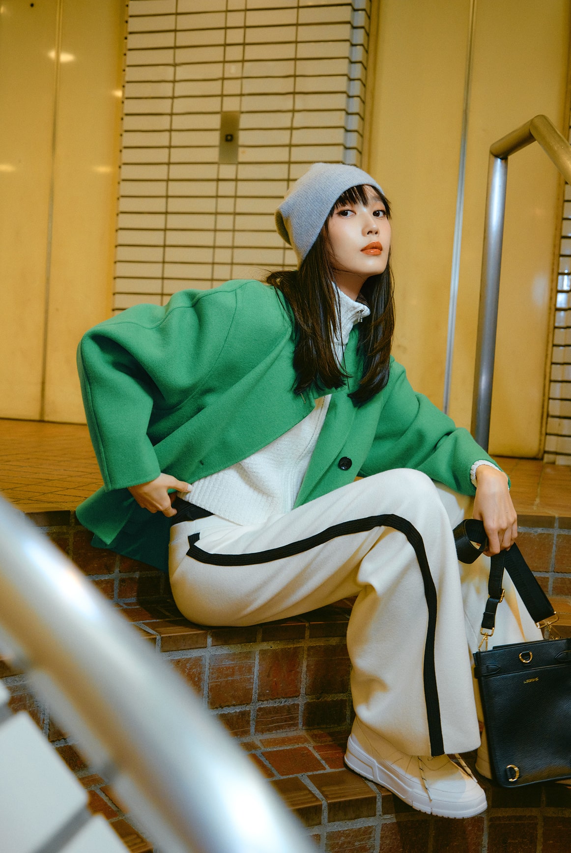 トレンドのトラックパンツも、ミラノリブ素材ならキレイめな印象に。気楽さと、程よく抜け感ある着こなしで、夜の散歩。