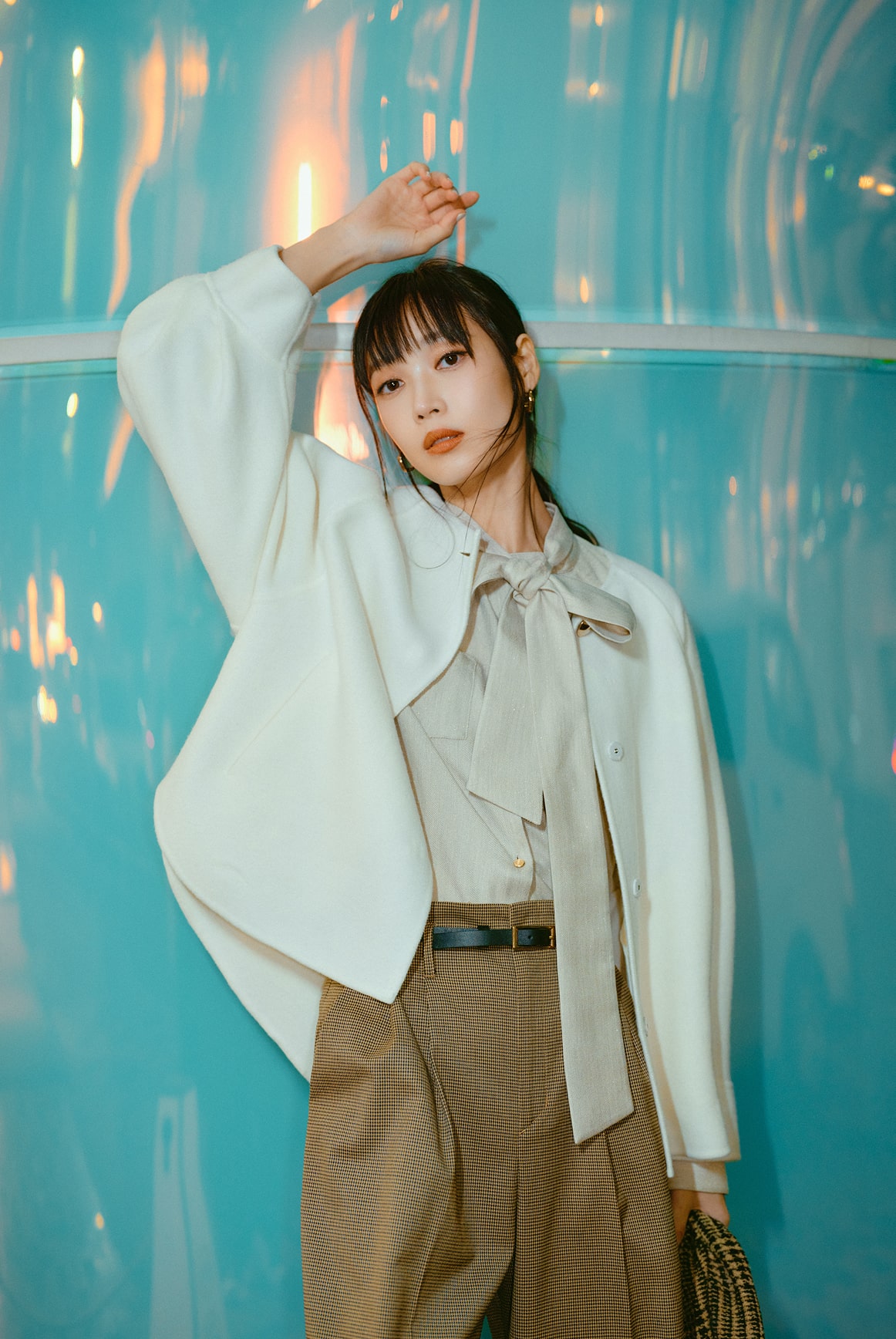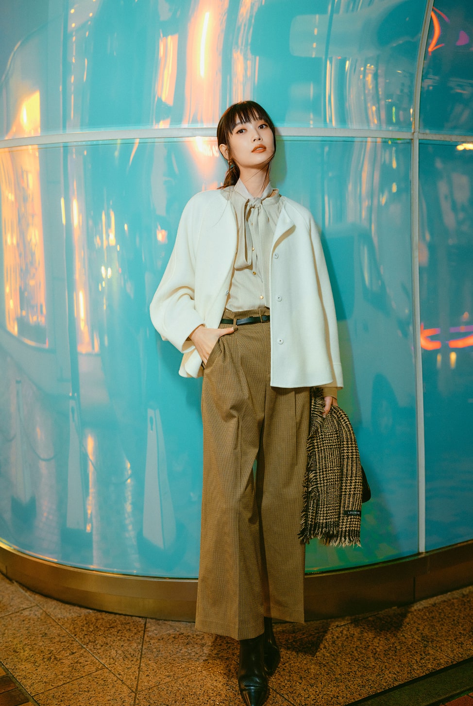 立ち姿の美しさが際立つ。ハイウエスト×タックデザイが、女性らしさとカッコよさのバランスが絶妙。