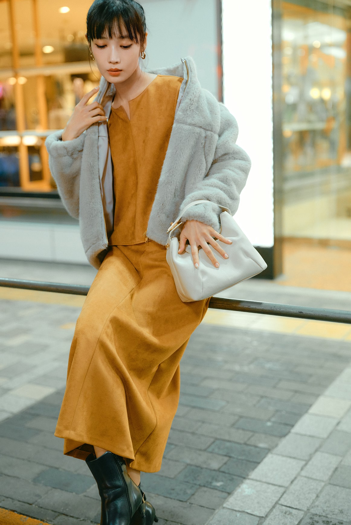 気軽いのにきちんと見え。スウェード調のマットな表面感が着こなしを今っぽく仕上げる。ファーブルゾンで、冬のワクワク感を盛り上げて。