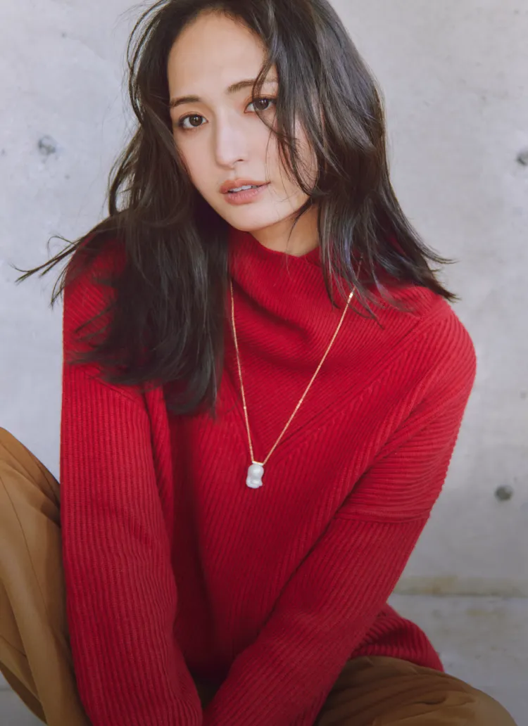 今年らしい衿つきのカーディガンにIラインスカートを合わせたセットアップ。メタルボタンがちょうどいいアクセントになってすらりとした縦のラインを自然に強調してくれる。