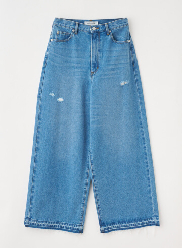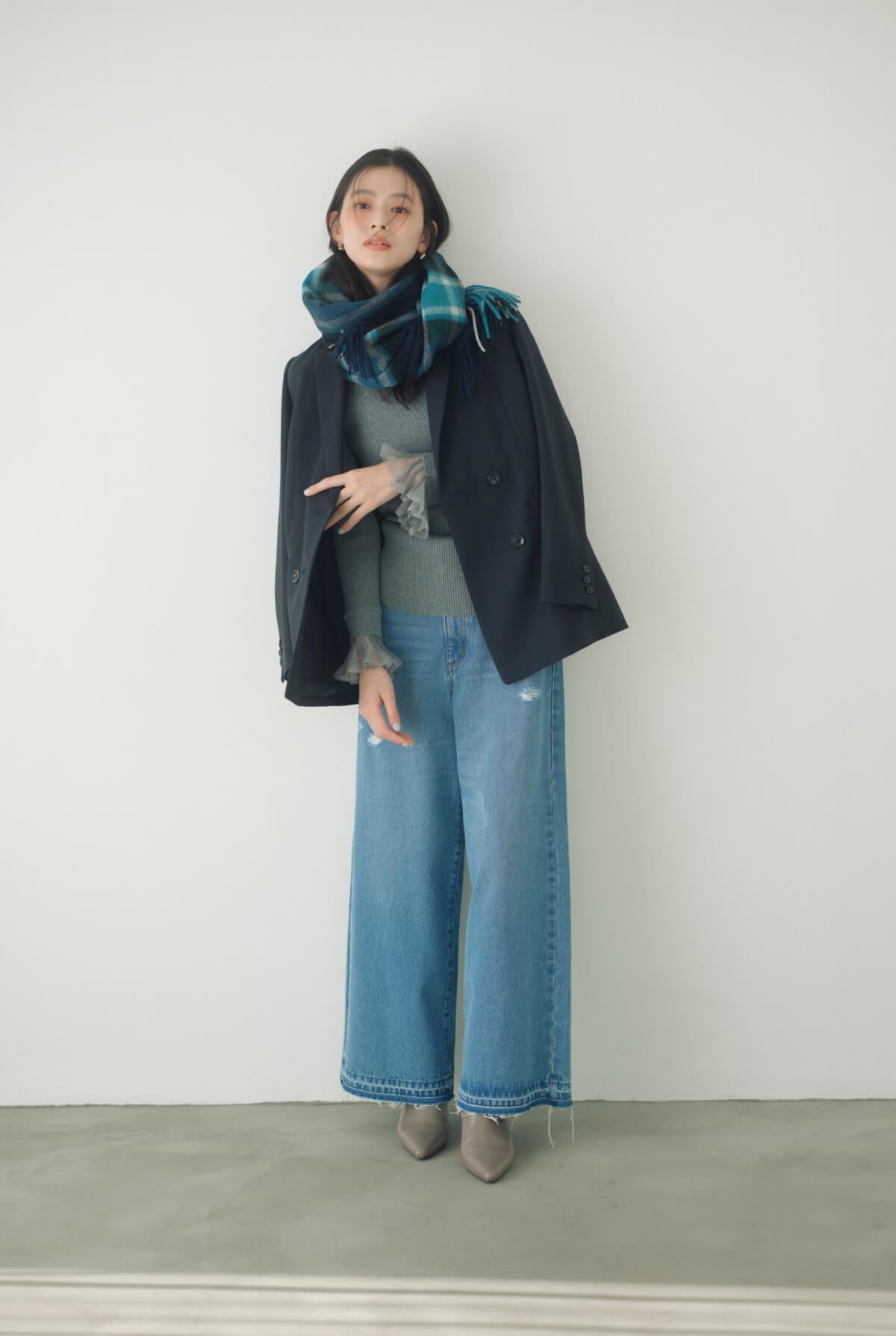 袖口にシアーなフリルデザイン。ジャケット×デニムのシンプルコーデが一気に華やぐ。