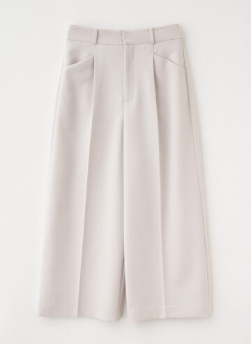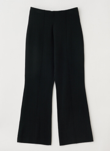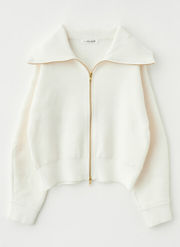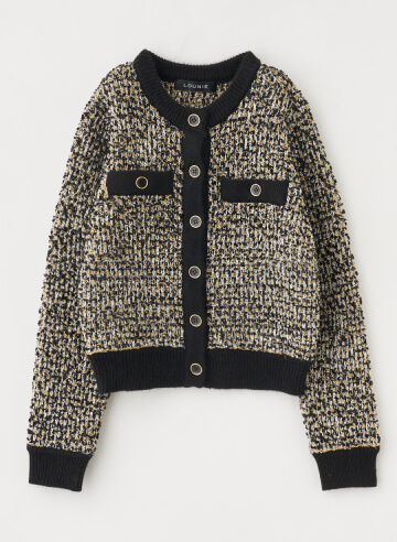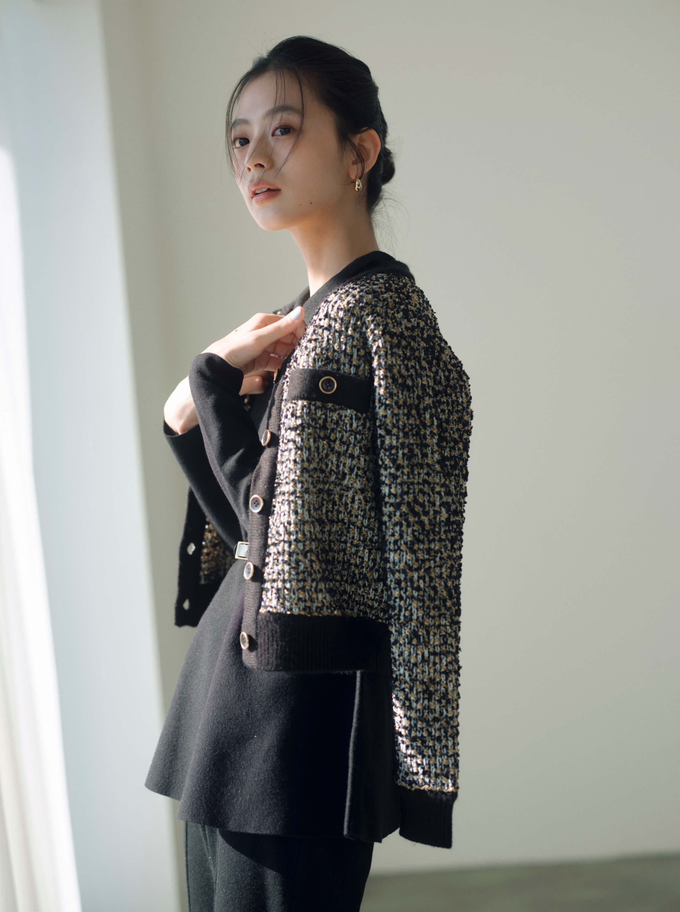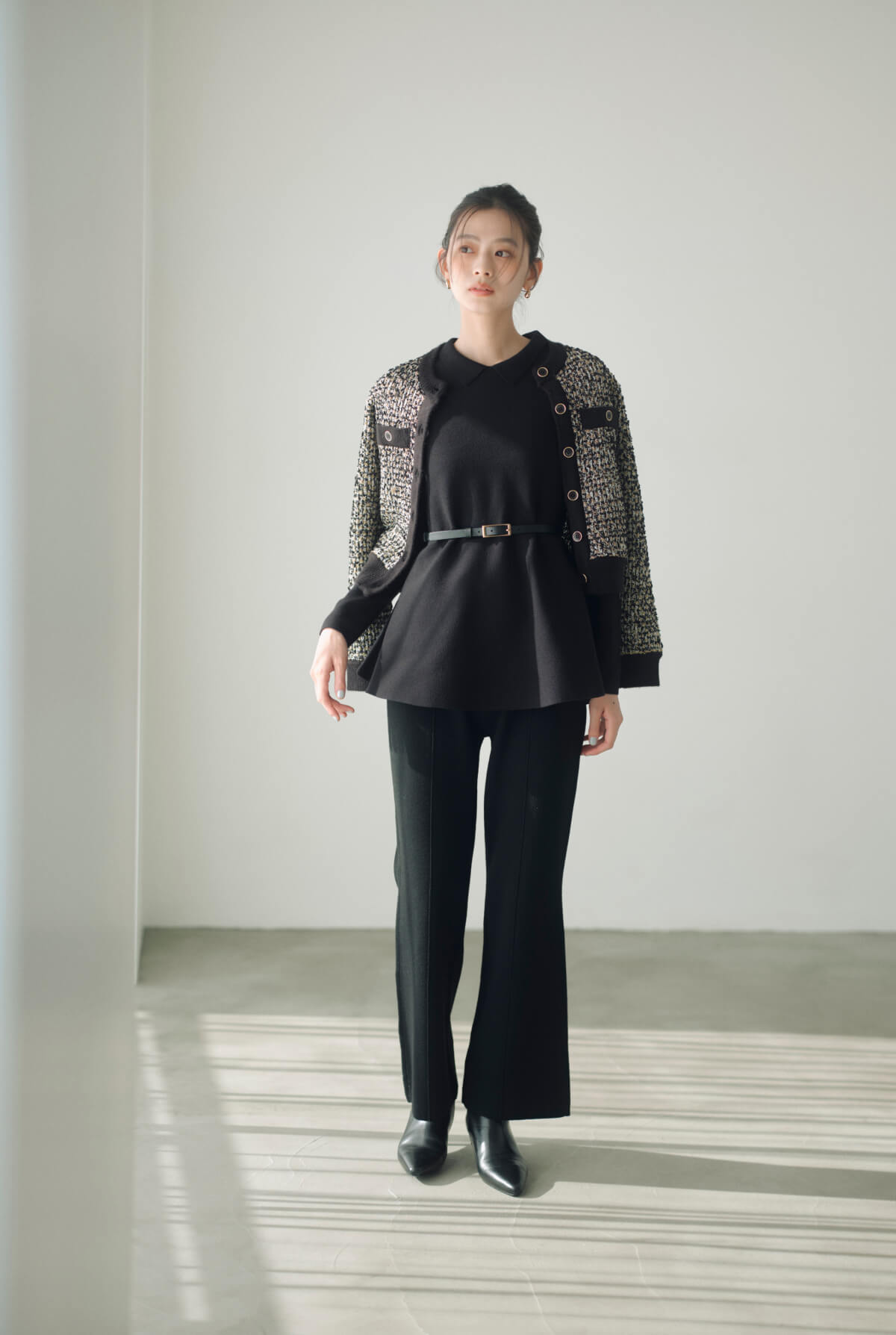 ラメ系を編み込んだツイード風ニットジャケットが主役なら、INの着こなしはワントーンに。襟付きニット×ニットパンツで、リラックス感も取り入れて。