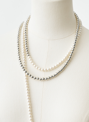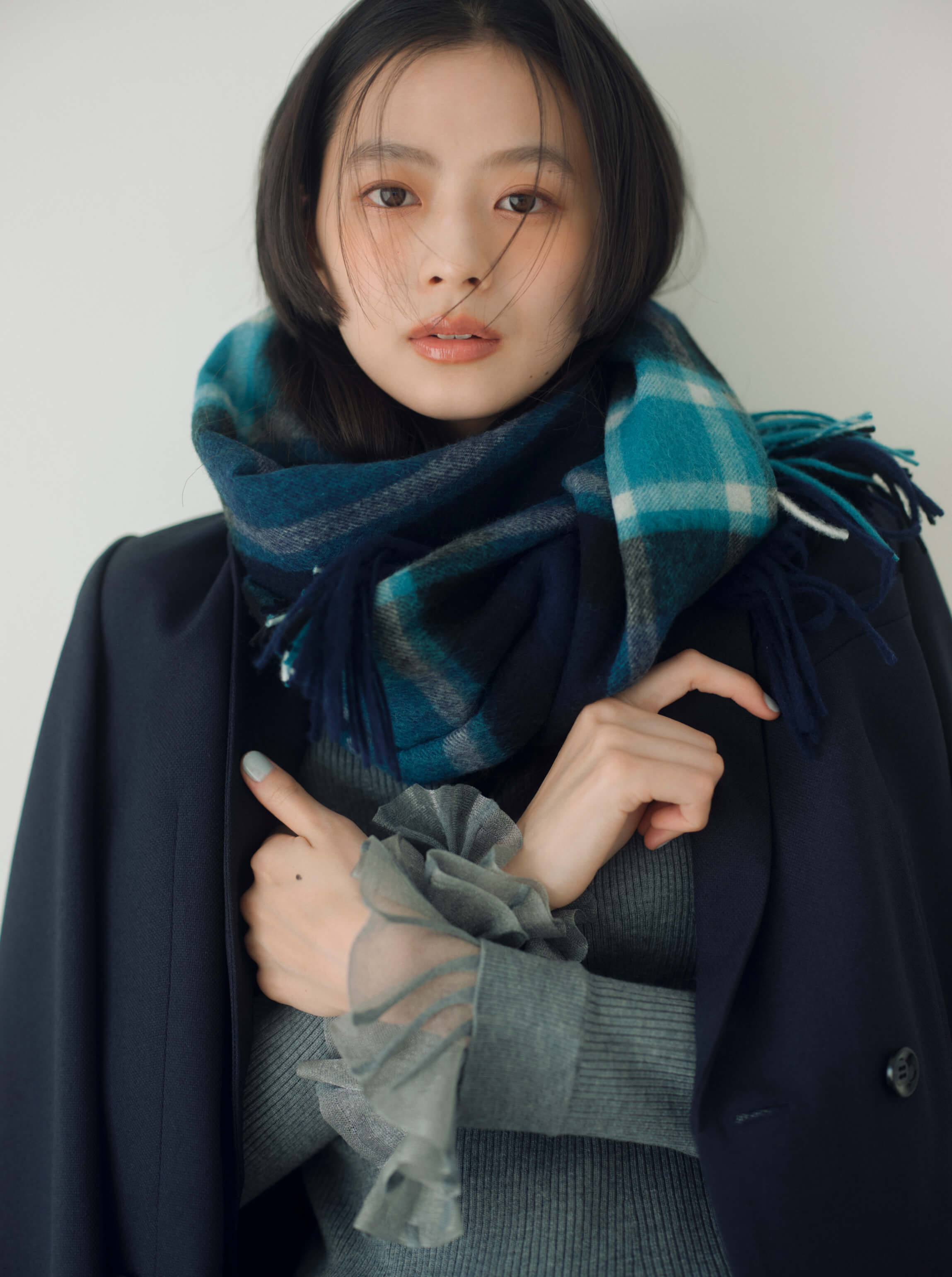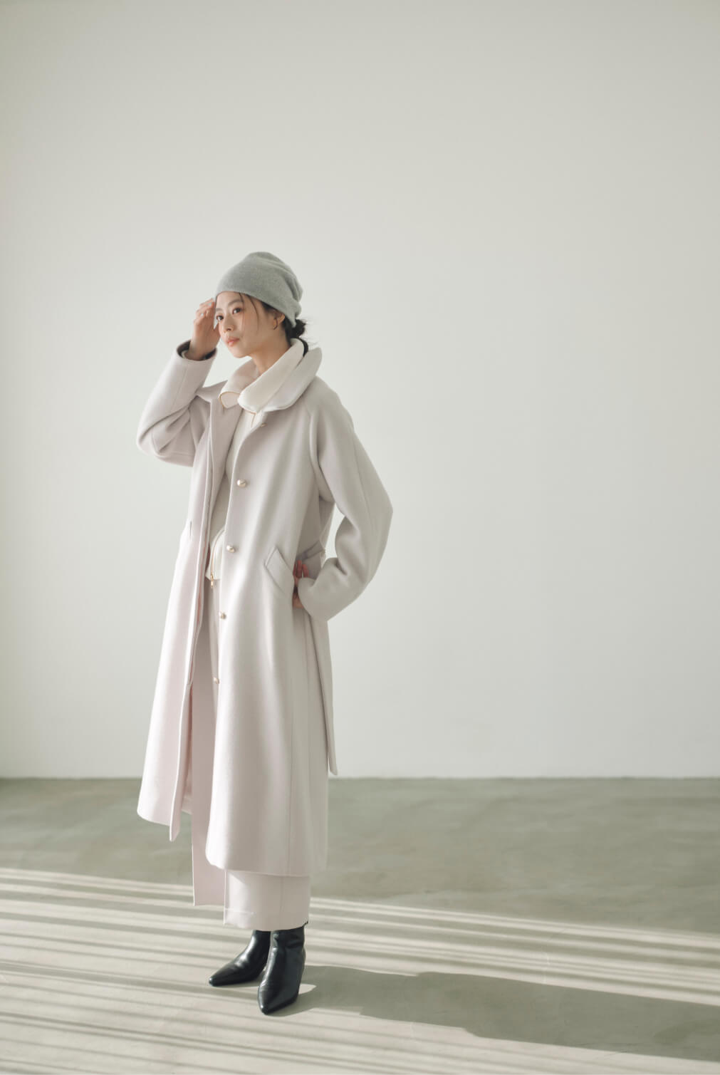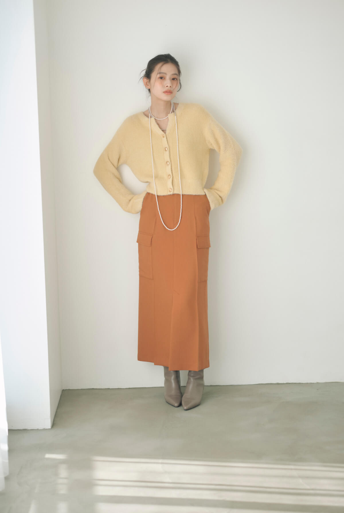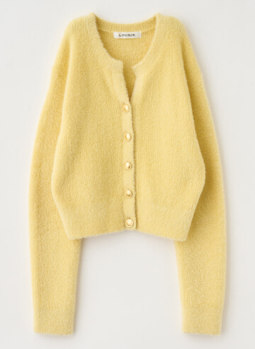 滑らかな肌触りが人気のフェザーヤーンは、まろやかなバニラクリーム色が新登場。肌を華やかに、リッチに見せる効果も。ロングパールでコーデを盛り上げて。
