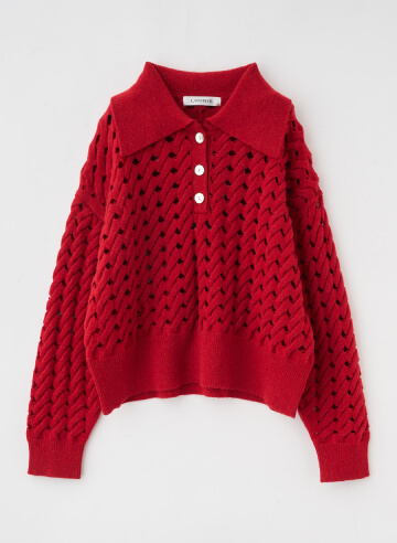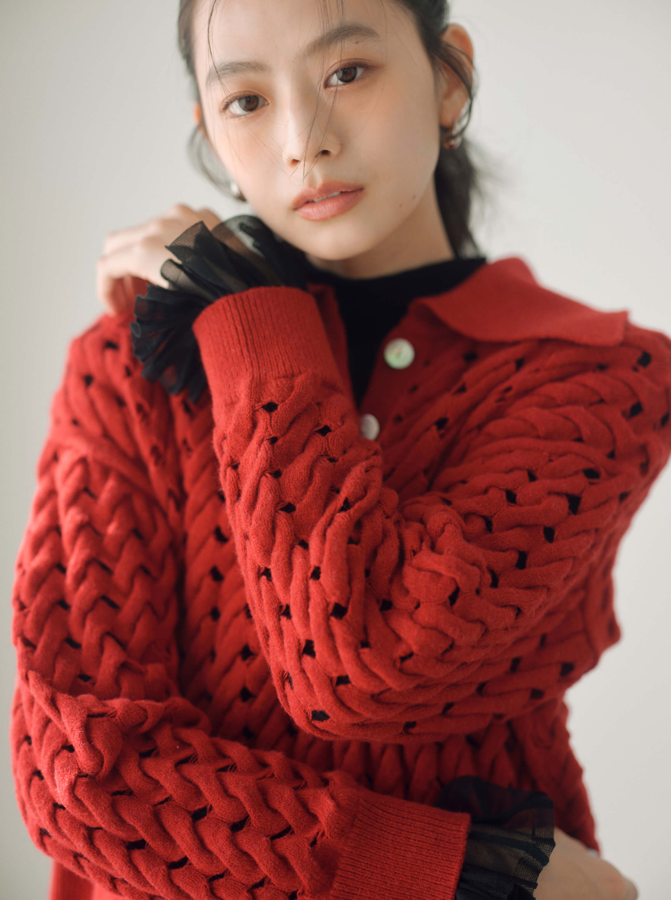 クロシェ編みにビッグカラー。レトロムードと今っぽさのバランスに一目惚れ。袖口からフリルを覗かせて、ロマンチックな甘さをプラス。