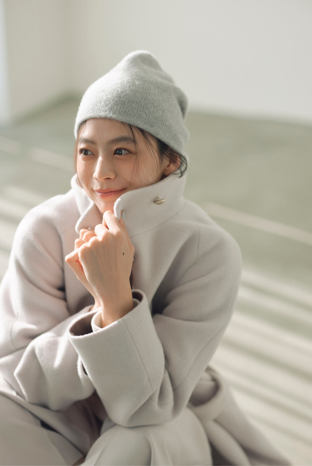 クラシックなスタンドカラーコートは、あえてスポーティな気分をミックスして。カシミヤ100%のニットキャップなら、カジュアルのバランスも丁度いい。コートINにはジップデザインのニットを。