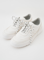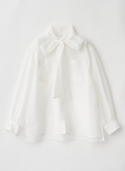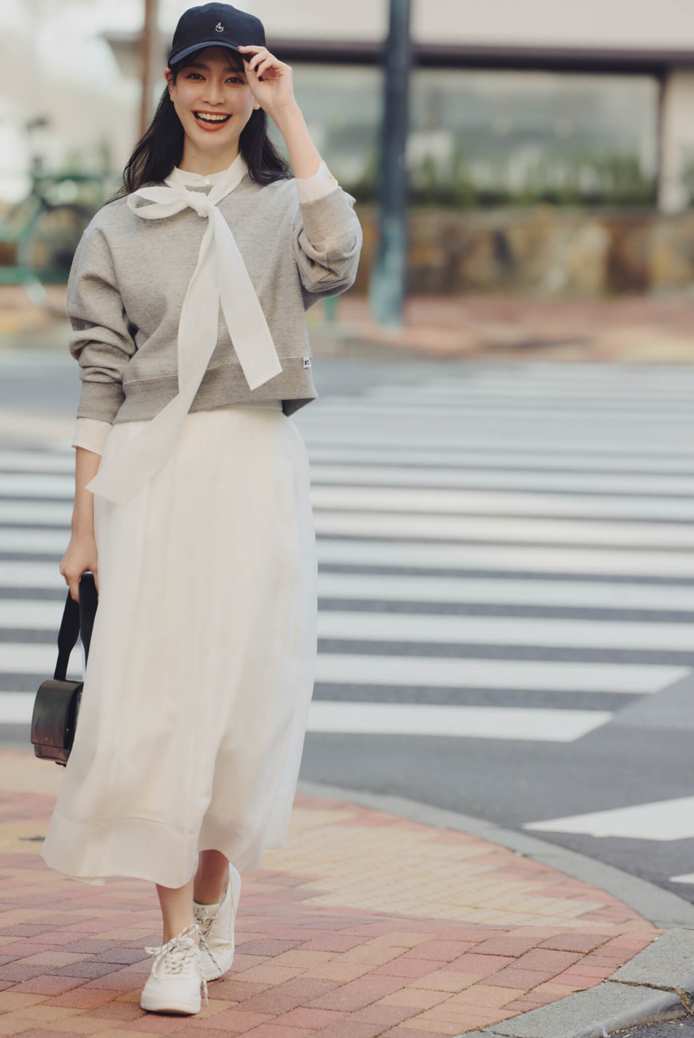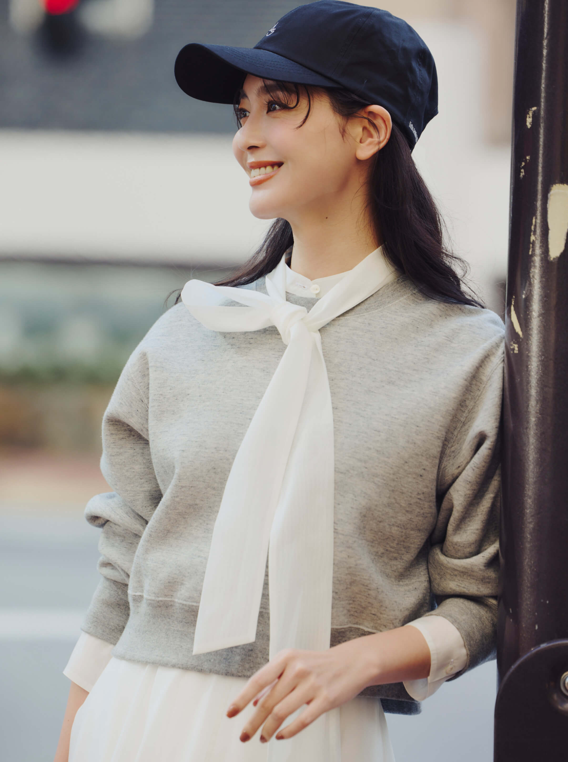 2WAYカーデをプルオーバー使いし、ボウタイブラウスをレイヤード。キャップとスニーカーで軽快にハズす、休日のショッピングにぴったりのきれいめカジュアルスタイルです。