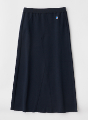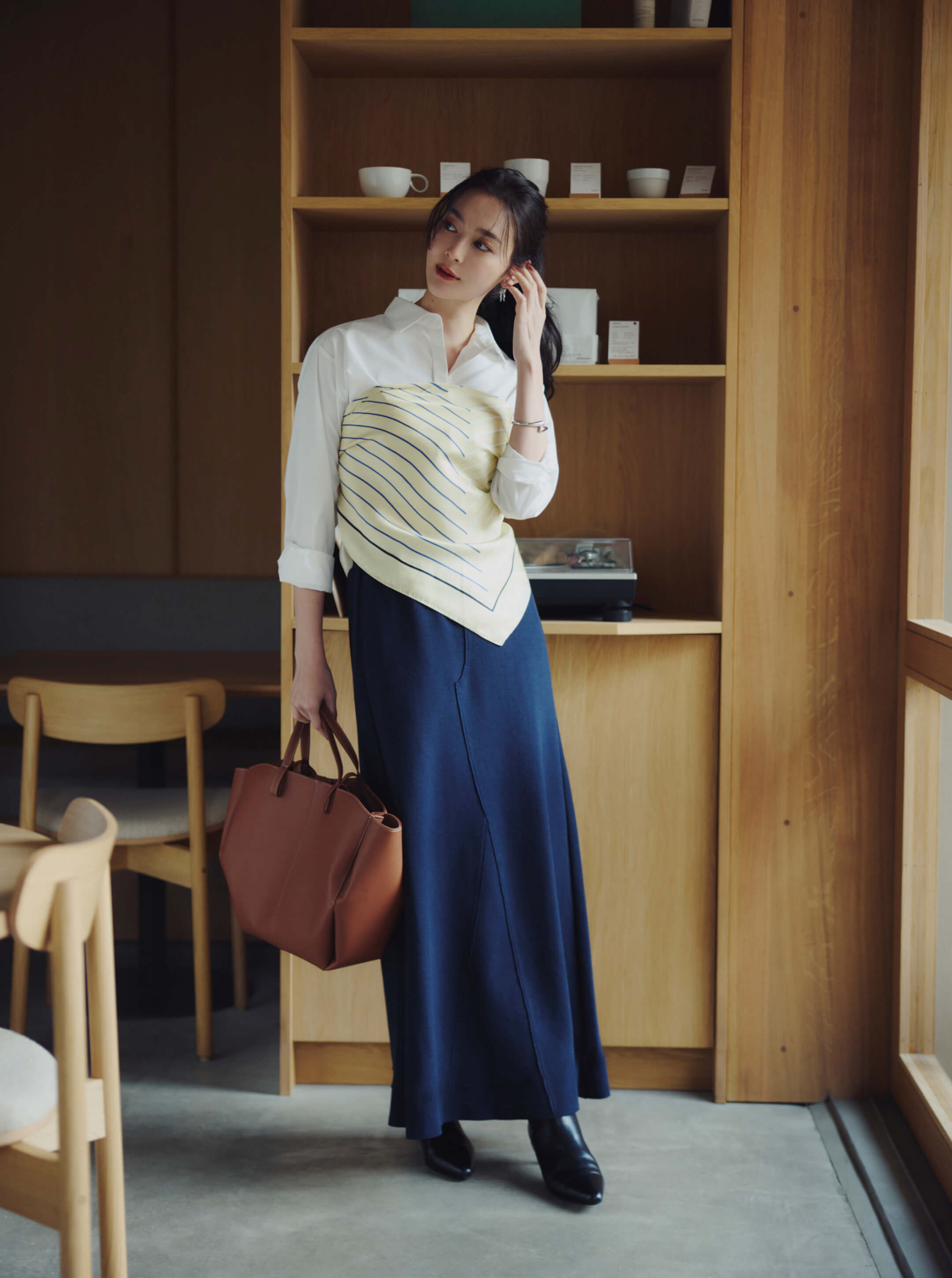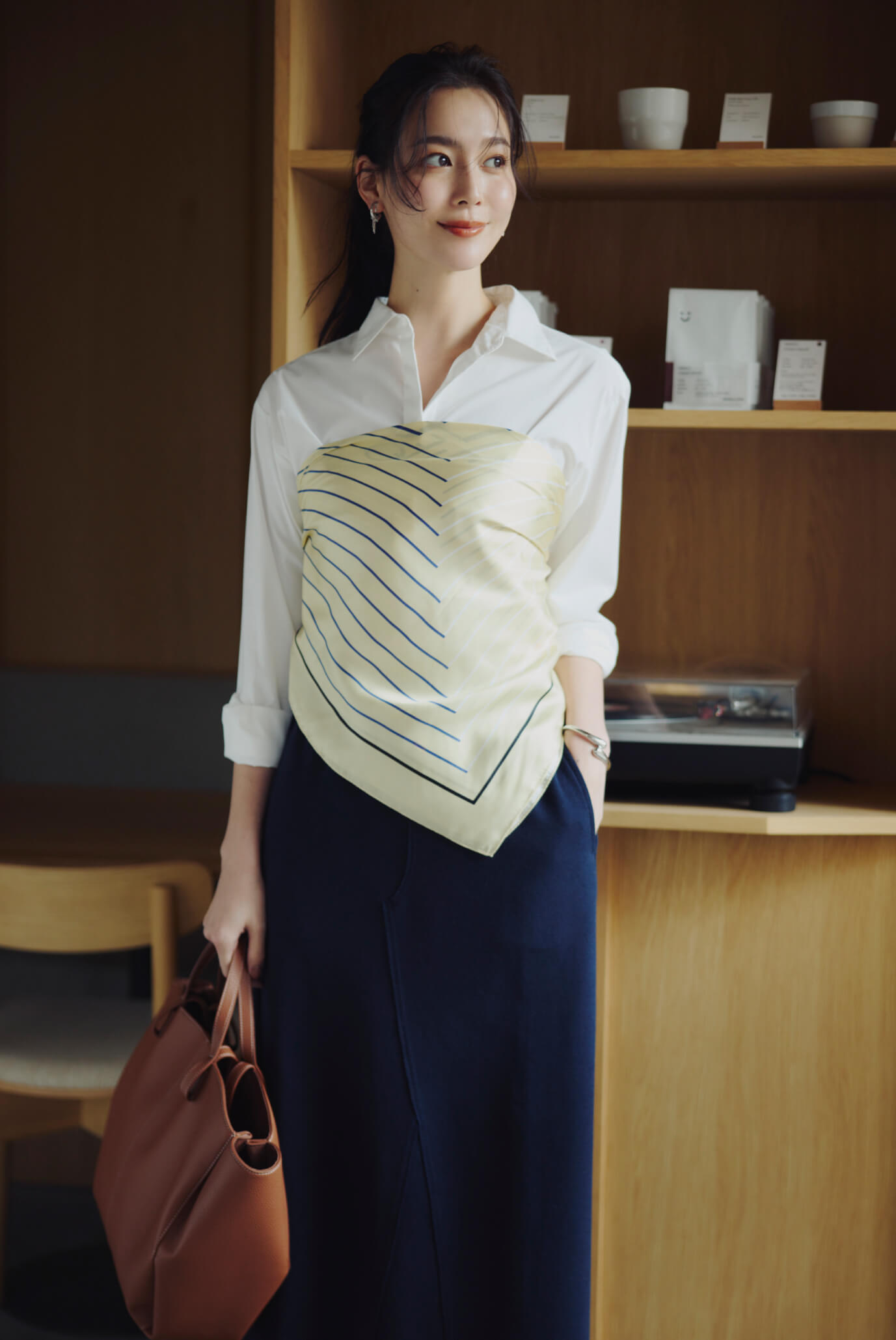 ネイビーのスカートは、オフィスシーンやリモートワークにも対応!白シャツとスカーフのレイヤードで知的に格上げ。
