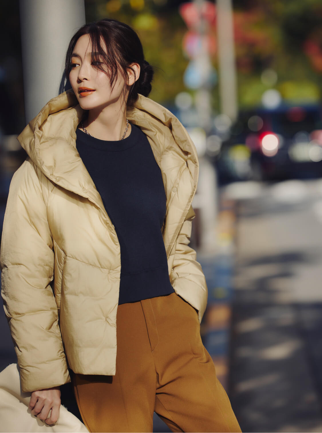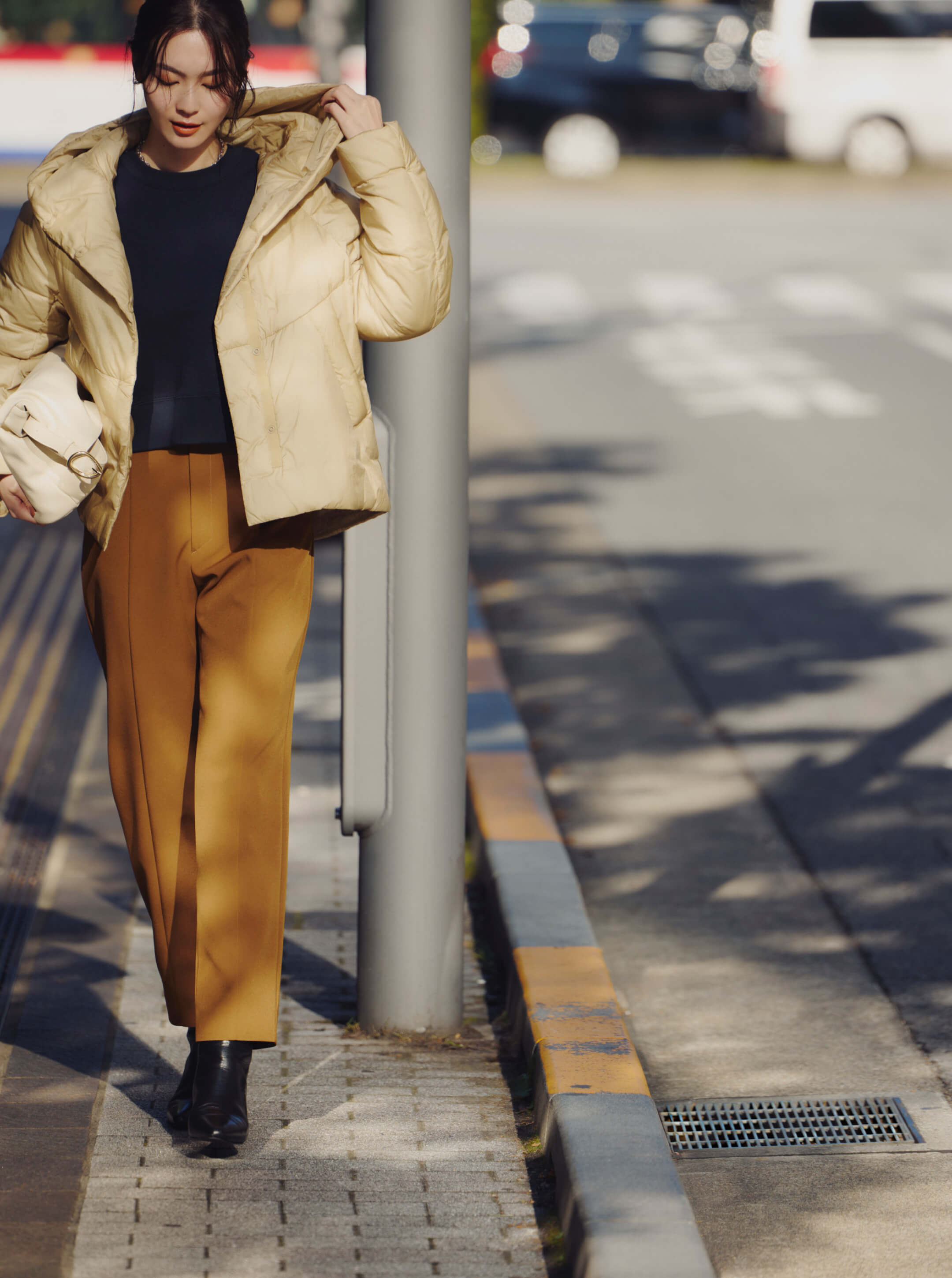 短め丈のトップスで目線が上がり、ダウンを羽織ってもすっきりとした好バランスに。年末の帰省や旅行にぴったり。