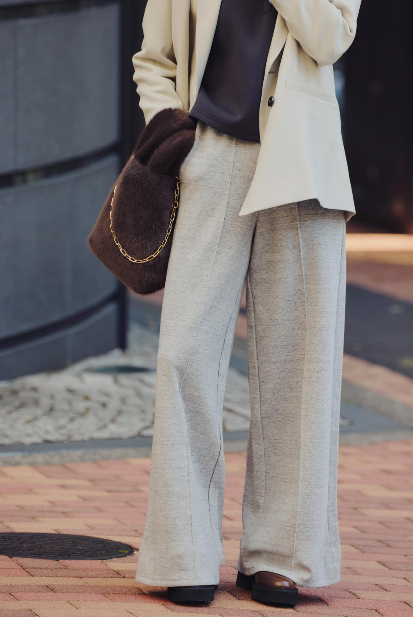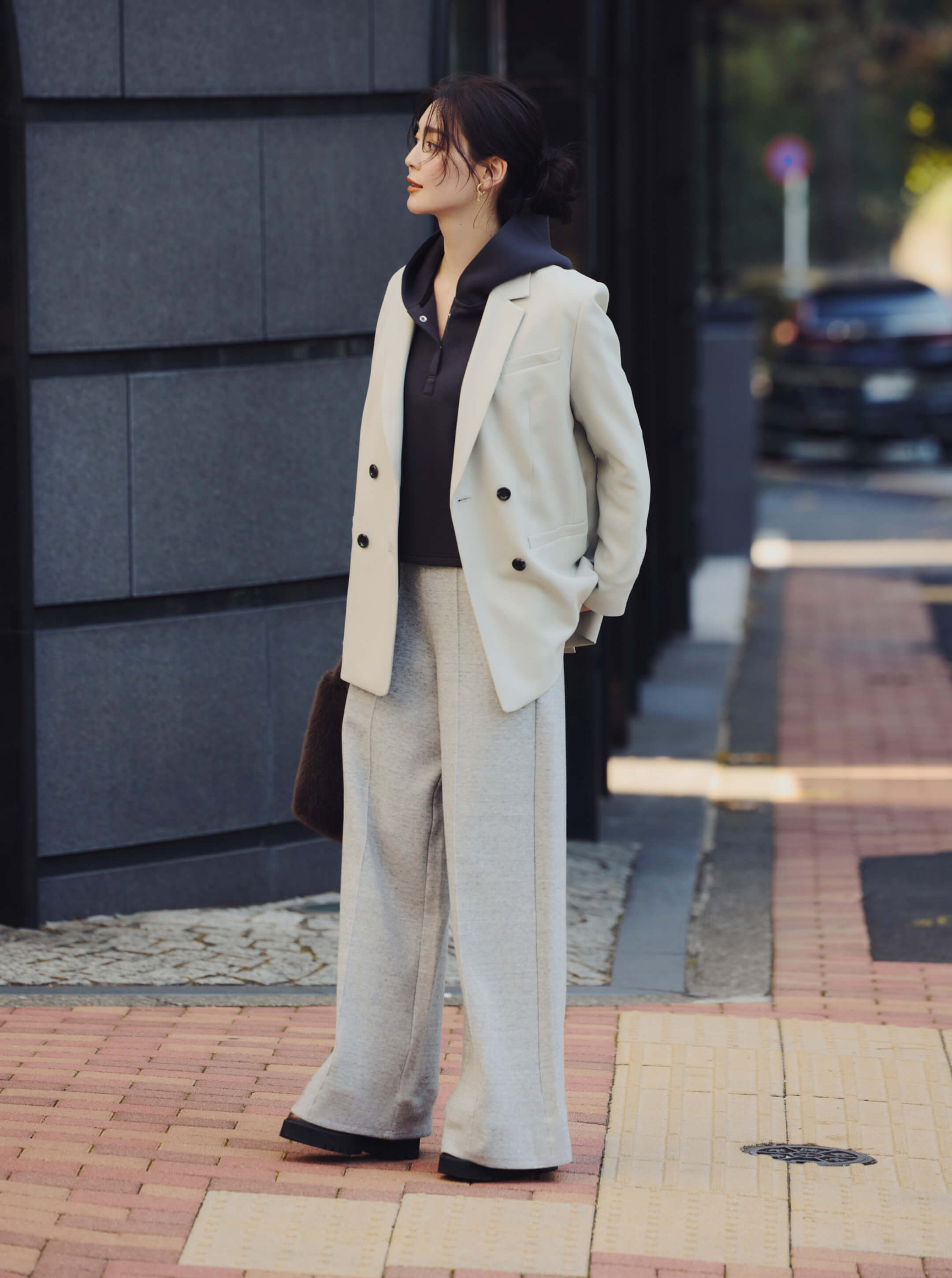 ピンタック入りのワイドパンツが縦ラインを強調し「きれいさ」を担保。ジャケットとパーカーを合わせたラフな着こなしも手抜きに見せない!